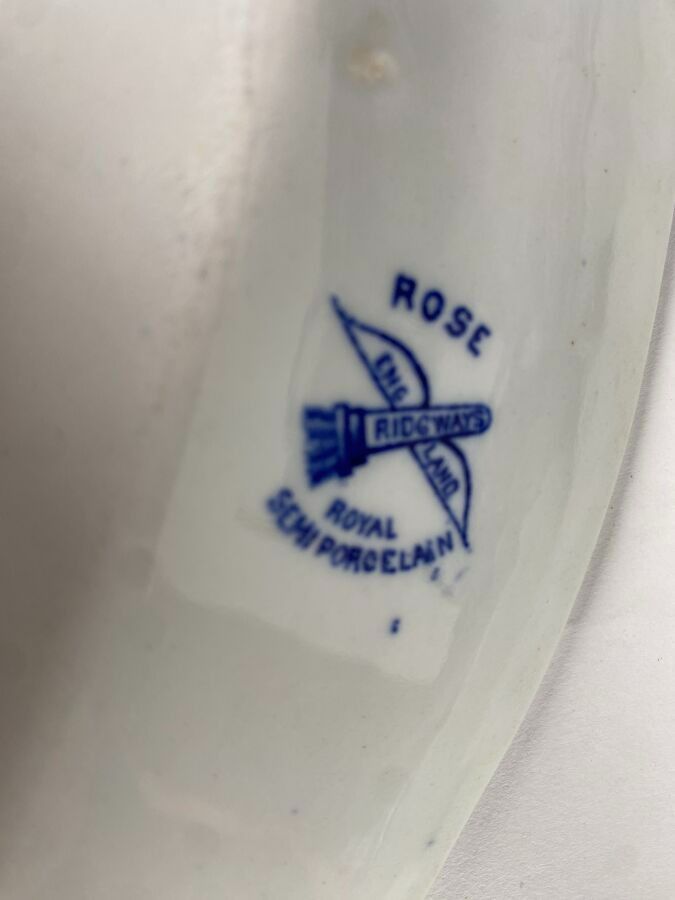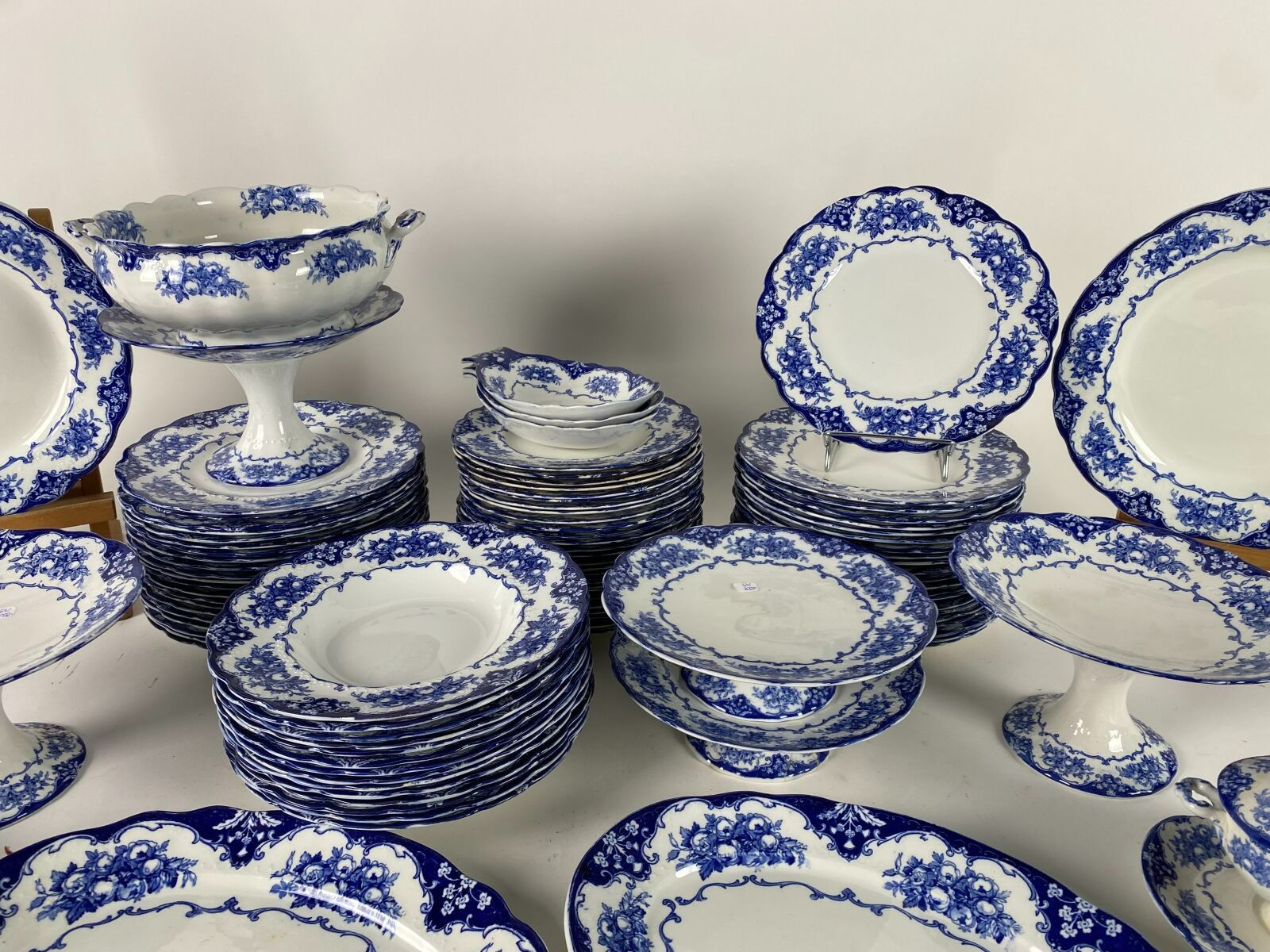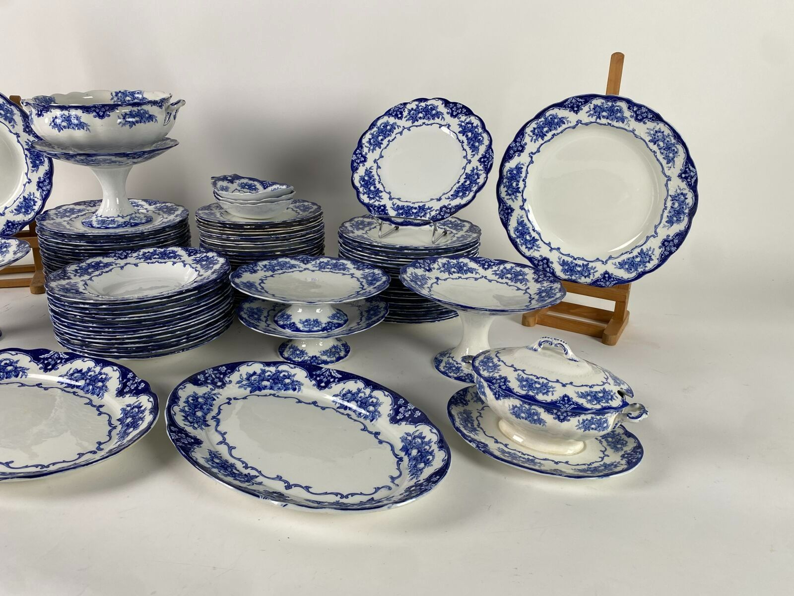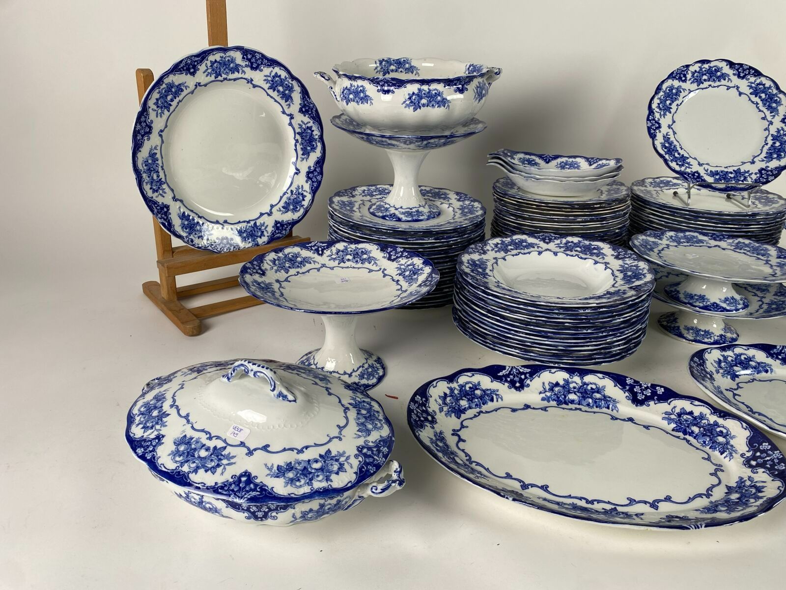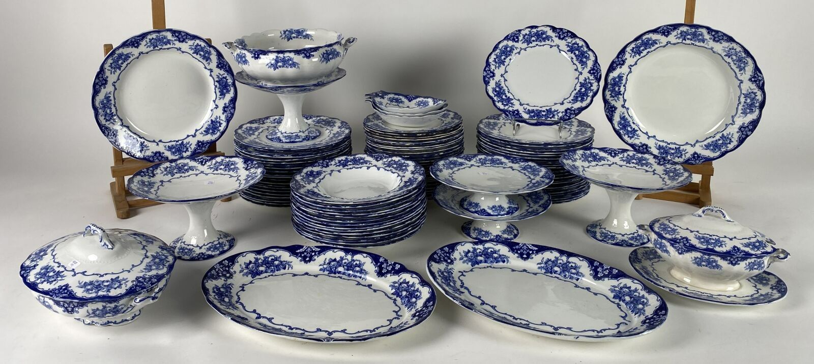 RIDGWAY, Staffordshire, modèle ROSE. Service de table comprenant 98 pièces en faïence fine de Staffordshire à décor floral en camaïeu bleu comprenant quarante trois assiettes plates, quatorze assiettes creuses, vingt sept assiettes à dessert, trois ramequins, deux plats ronds, deux plats ronds sur piédouche, deux plats ovales, trois coupes, un légumier, un saladier et une saucière Bel état général.