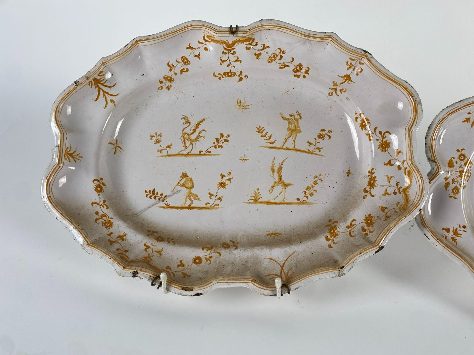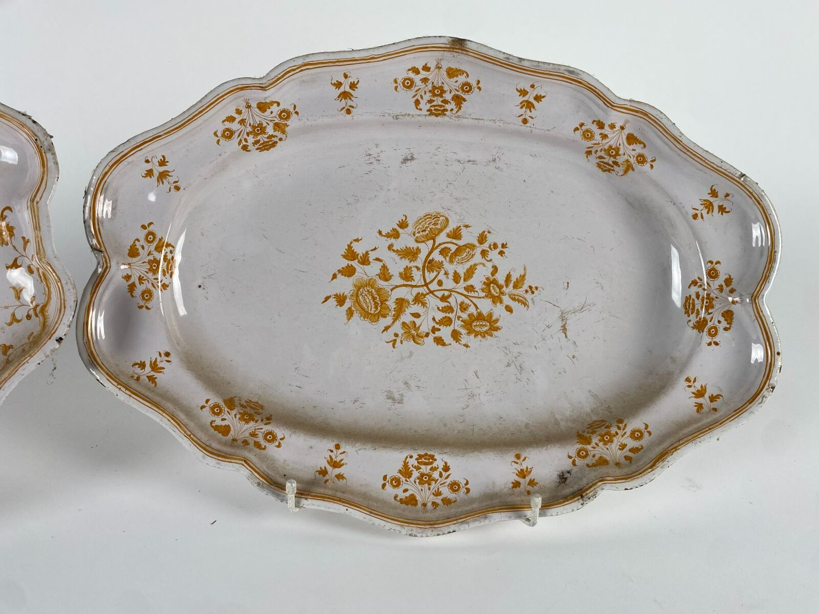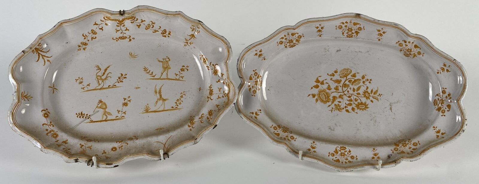 Moustiers? Lyon? XVIIIème siècle Deux plats ovales à contours, en faïence, à décor en camaïeu ocre à fleurs