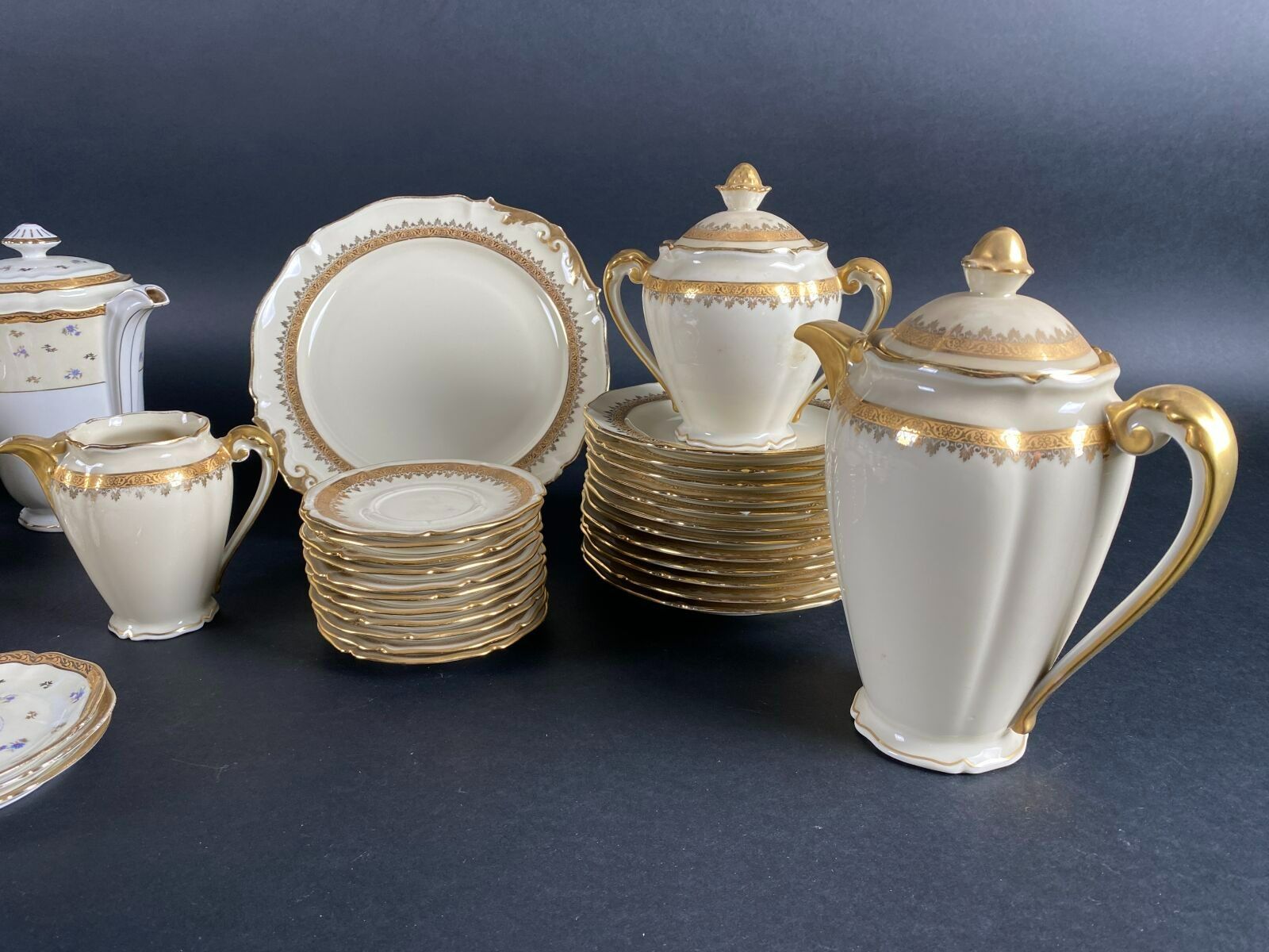 On y joint LEC - LIMOGES, une partie de service à café et gâteaux en porcelaine à décor de frises dorés comprenant une théière, un sucrier, un pot-à-lait, one sous-tasses, douze petites assiettes et un plat.