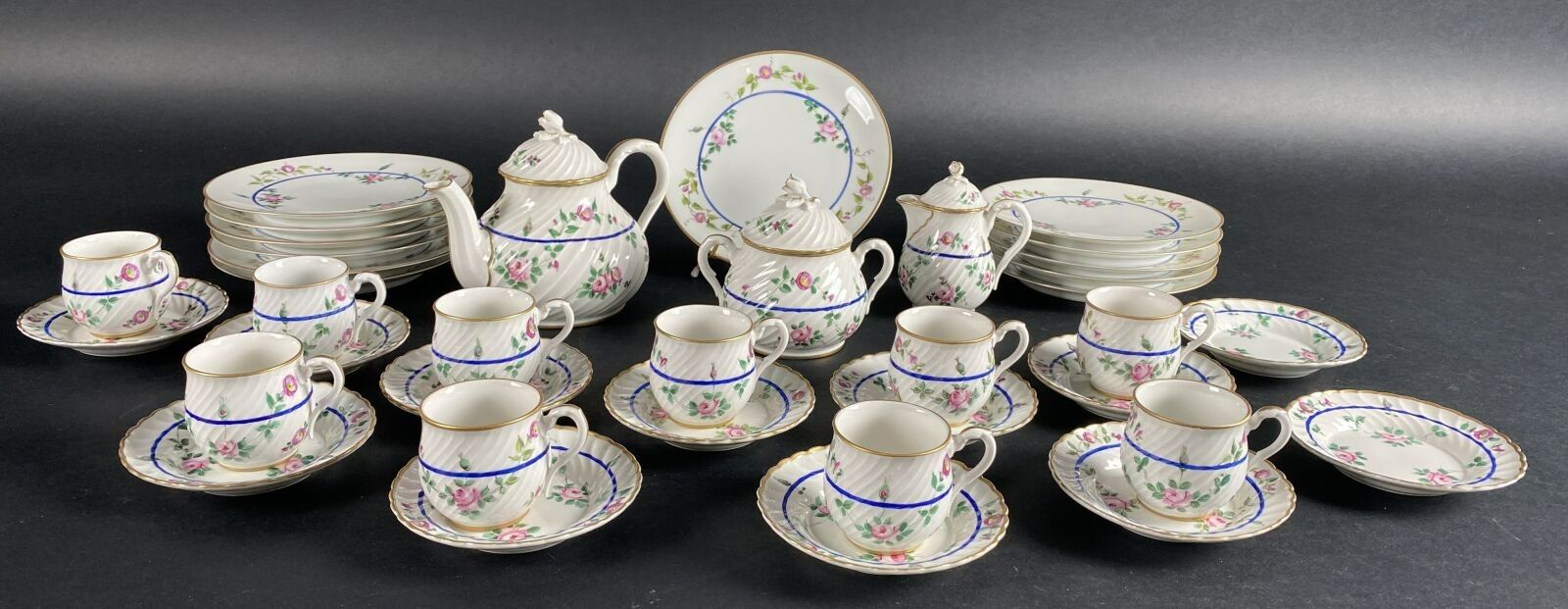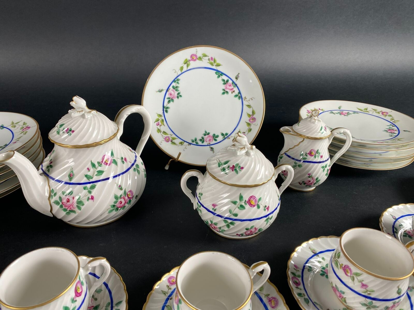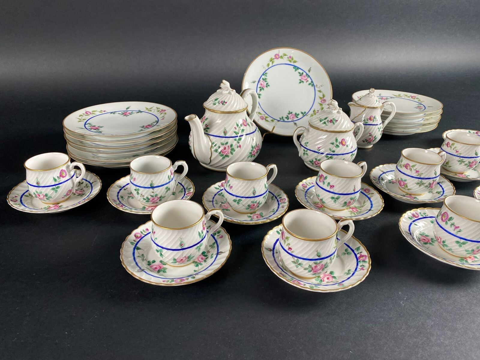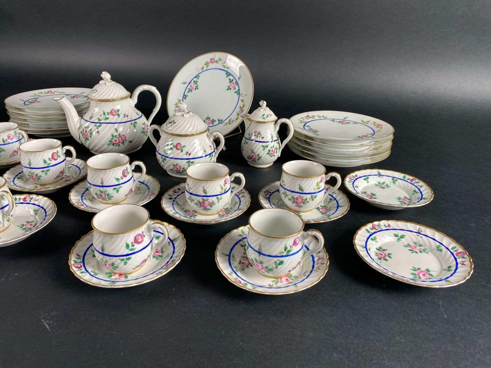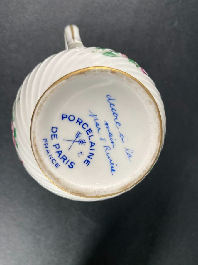 Une partie de service à café en porcelaine de Paris à décor peint à la main par J. RIVIERE de polychrome de fleurs, liseret bleu et doré comprenant dix tasses, douze sous-tasses, une cafetière, un pot-à-lait, un sucrier et douze assiettes à dessert.
