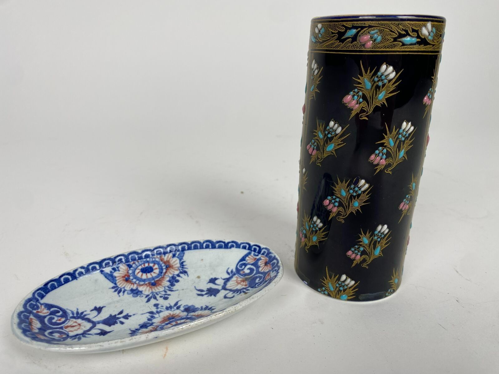 GIEN un petit vase rouleau en faïence émaillée signé sous le talon h14 cm et un petit vide-poches