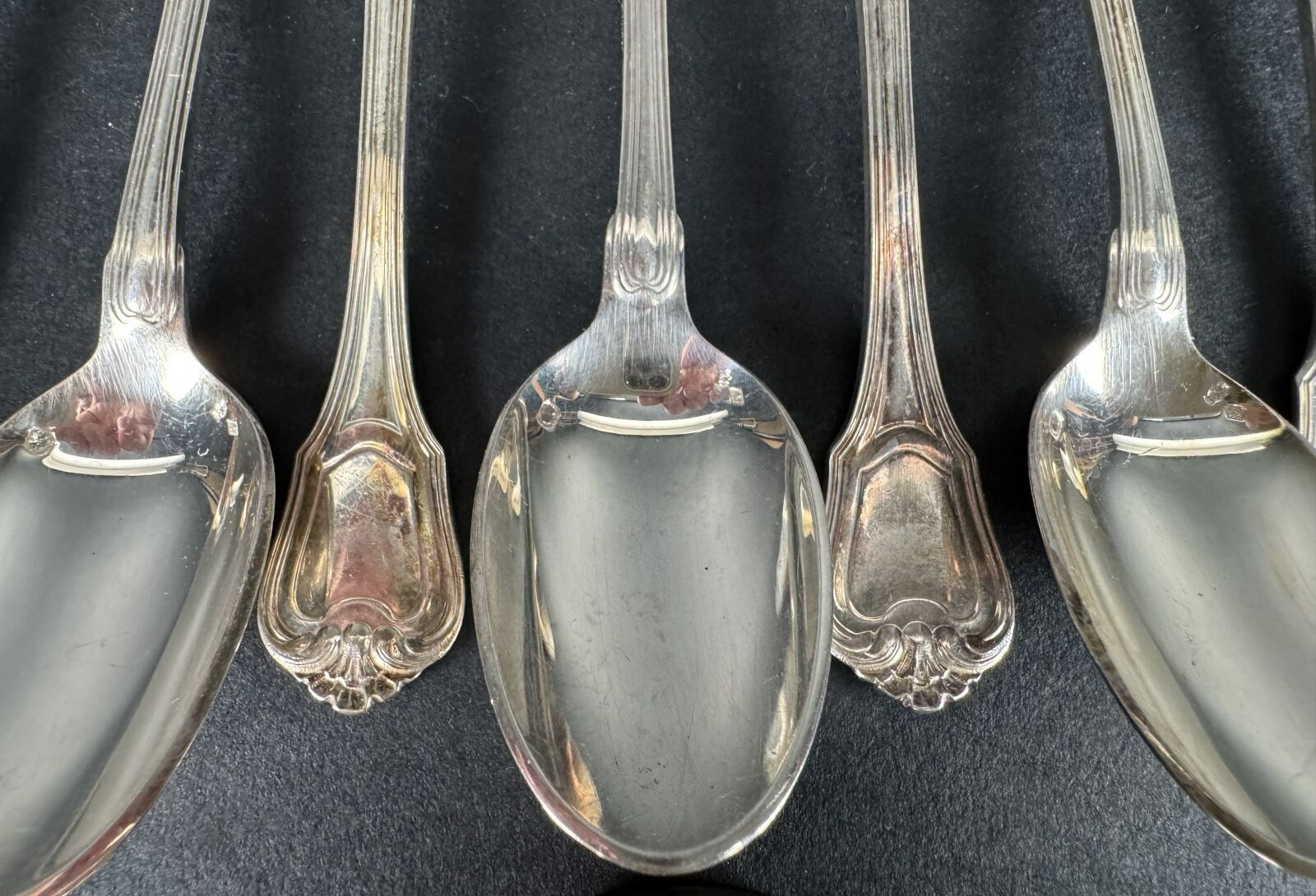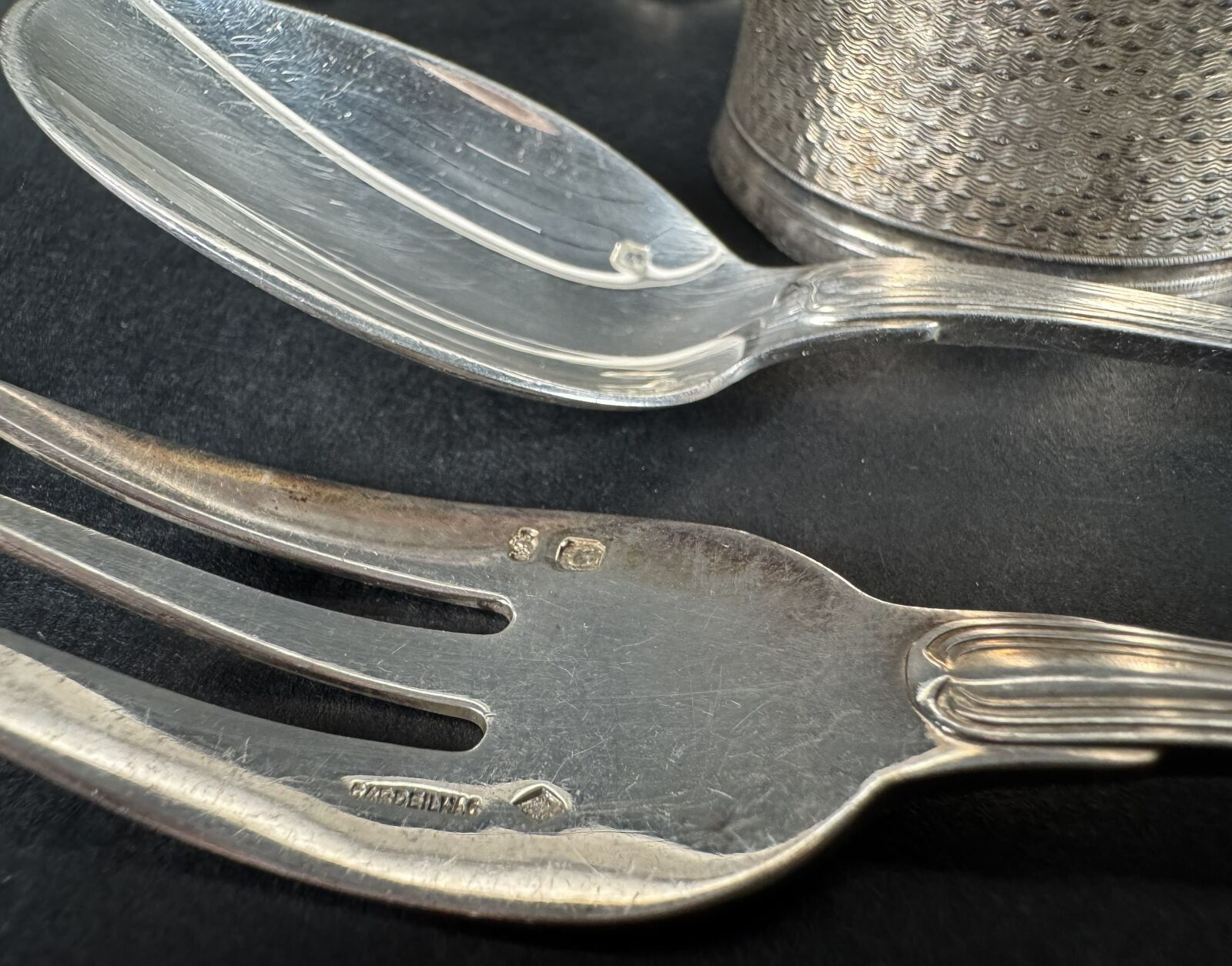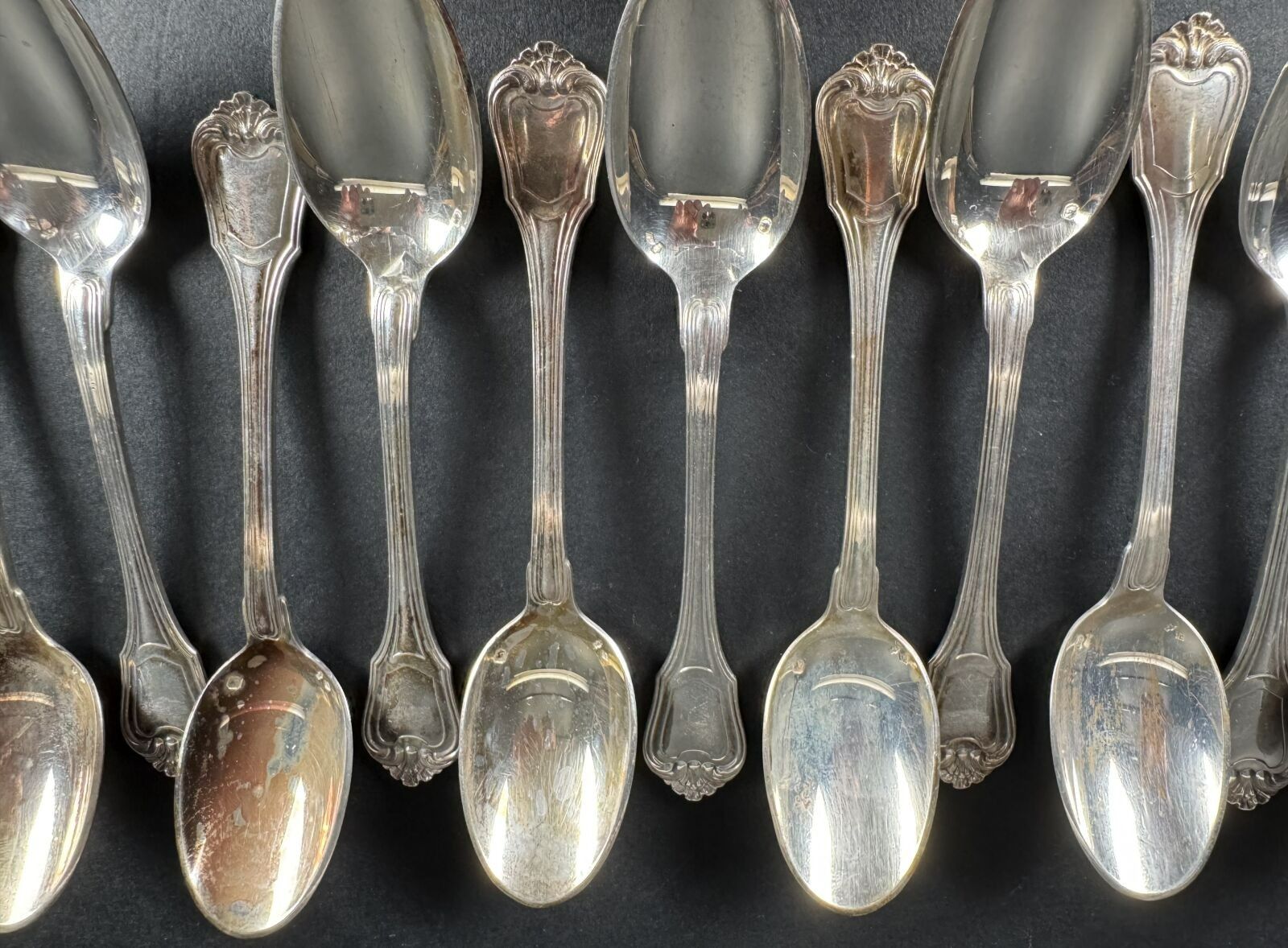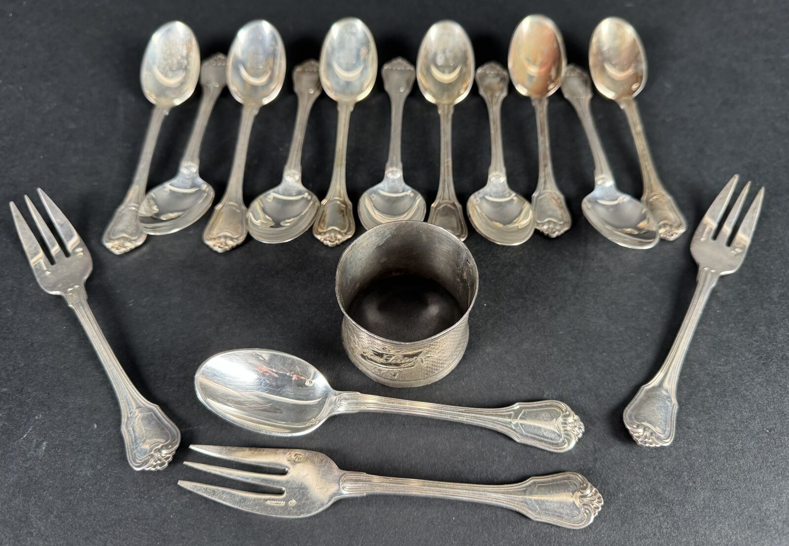 douze cuillers à café et trois fourchettes à entremet en argent minerve, Maître orfèvre Cardheilac, 550 g