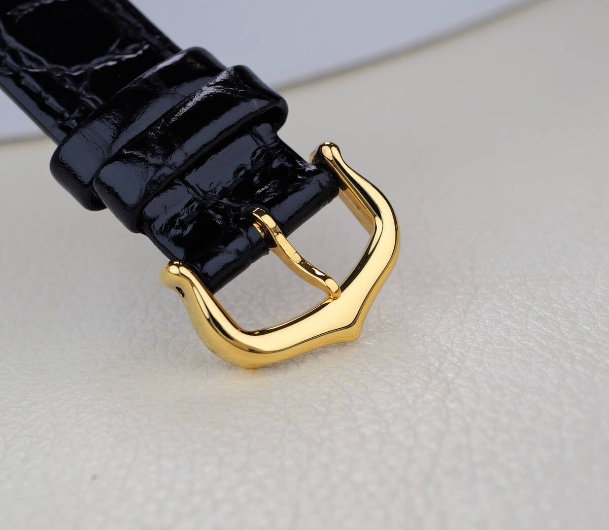 Matière : Plaqué or 18K / Bracelet cuir noir (neuf, non d’origine)