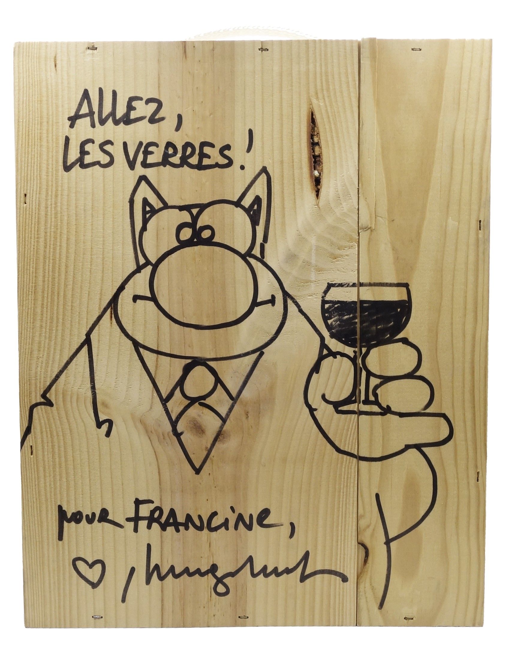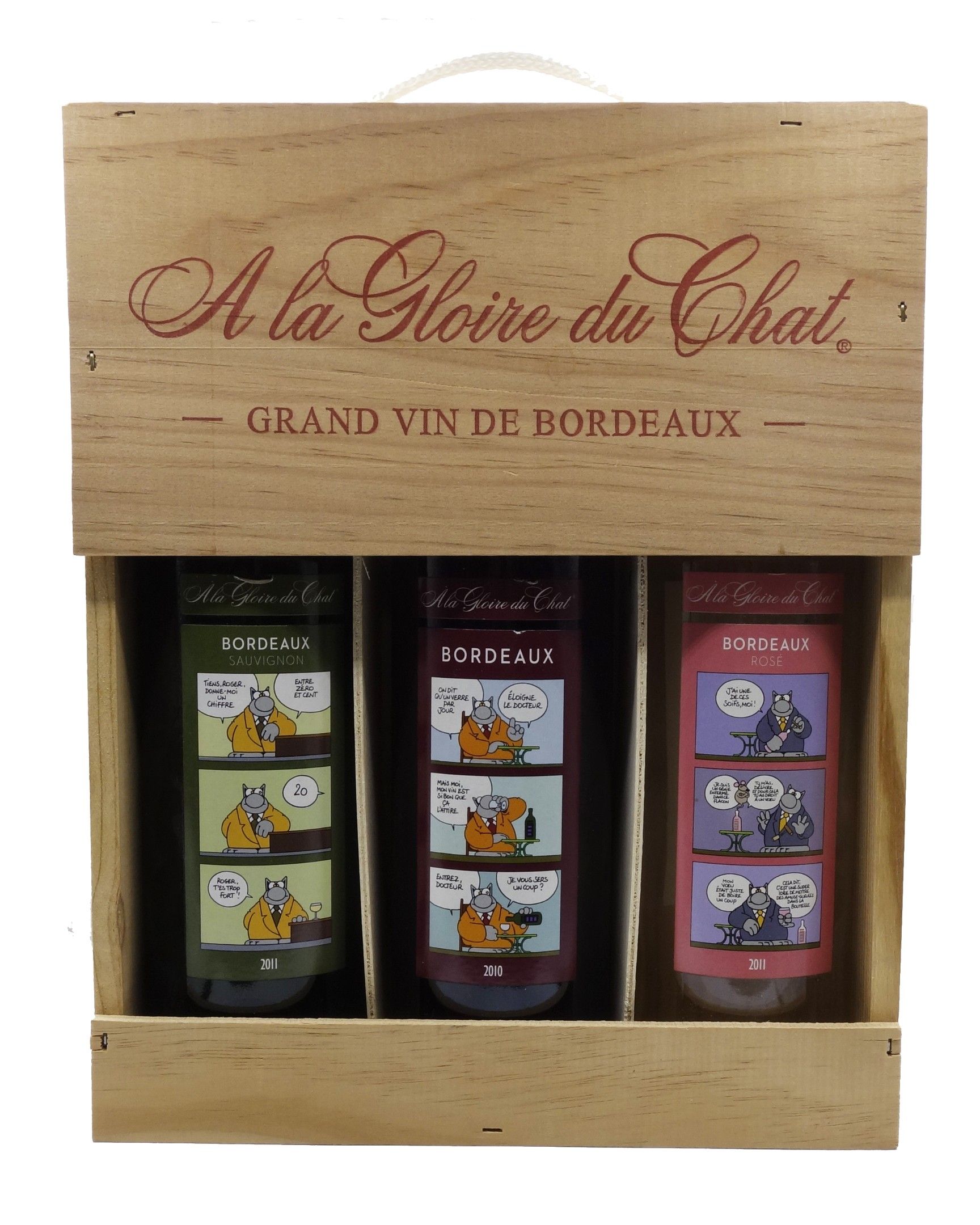 Philippe Geluck = Coffret "A la gloire du chat" contient 3 bouteilles de vin de Bordeaux. Dédicacé au verso.