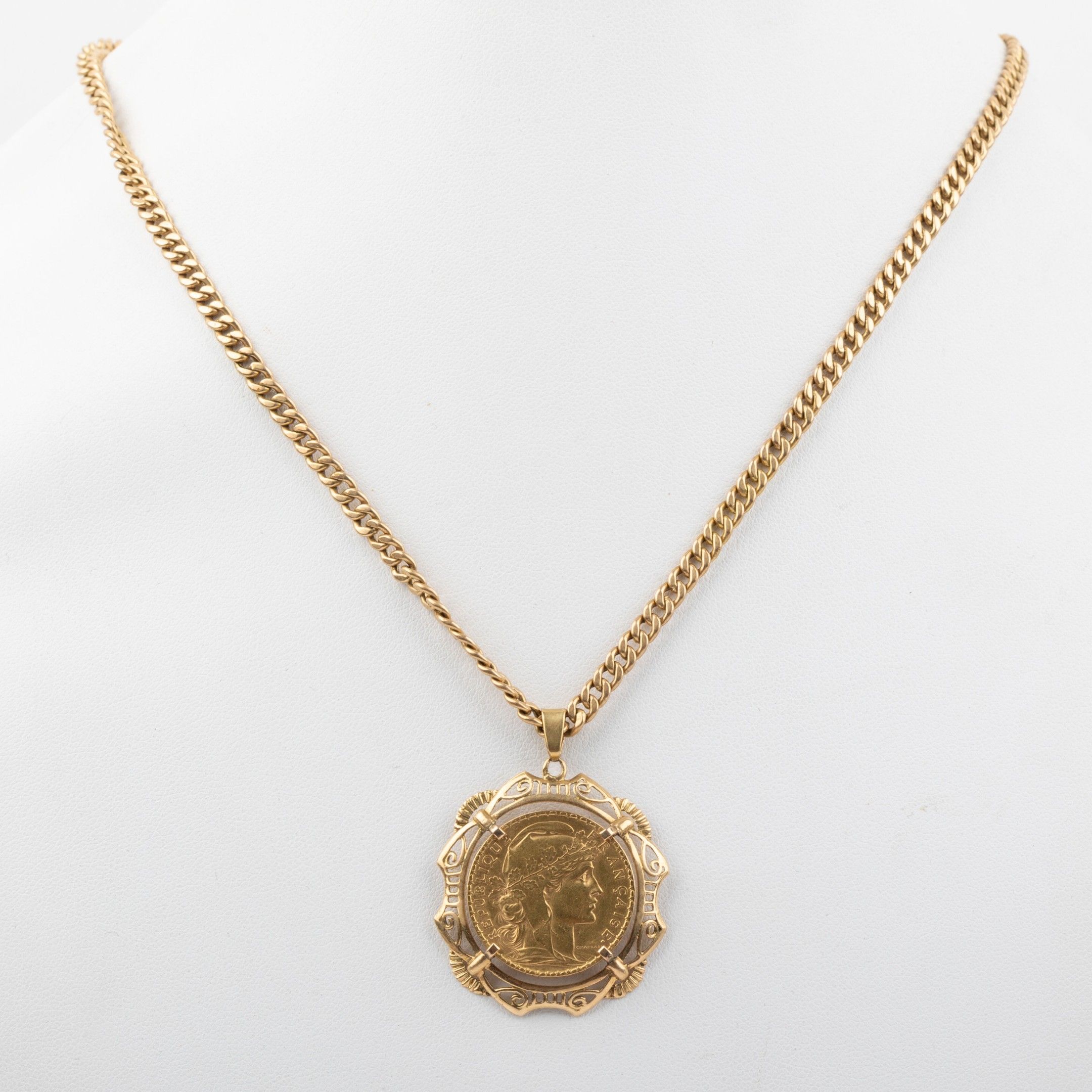 Chaine or 18K maille anglaise et pendentif pièce 20 Fr or montée Poids: 17.8 g- L: 45 cm