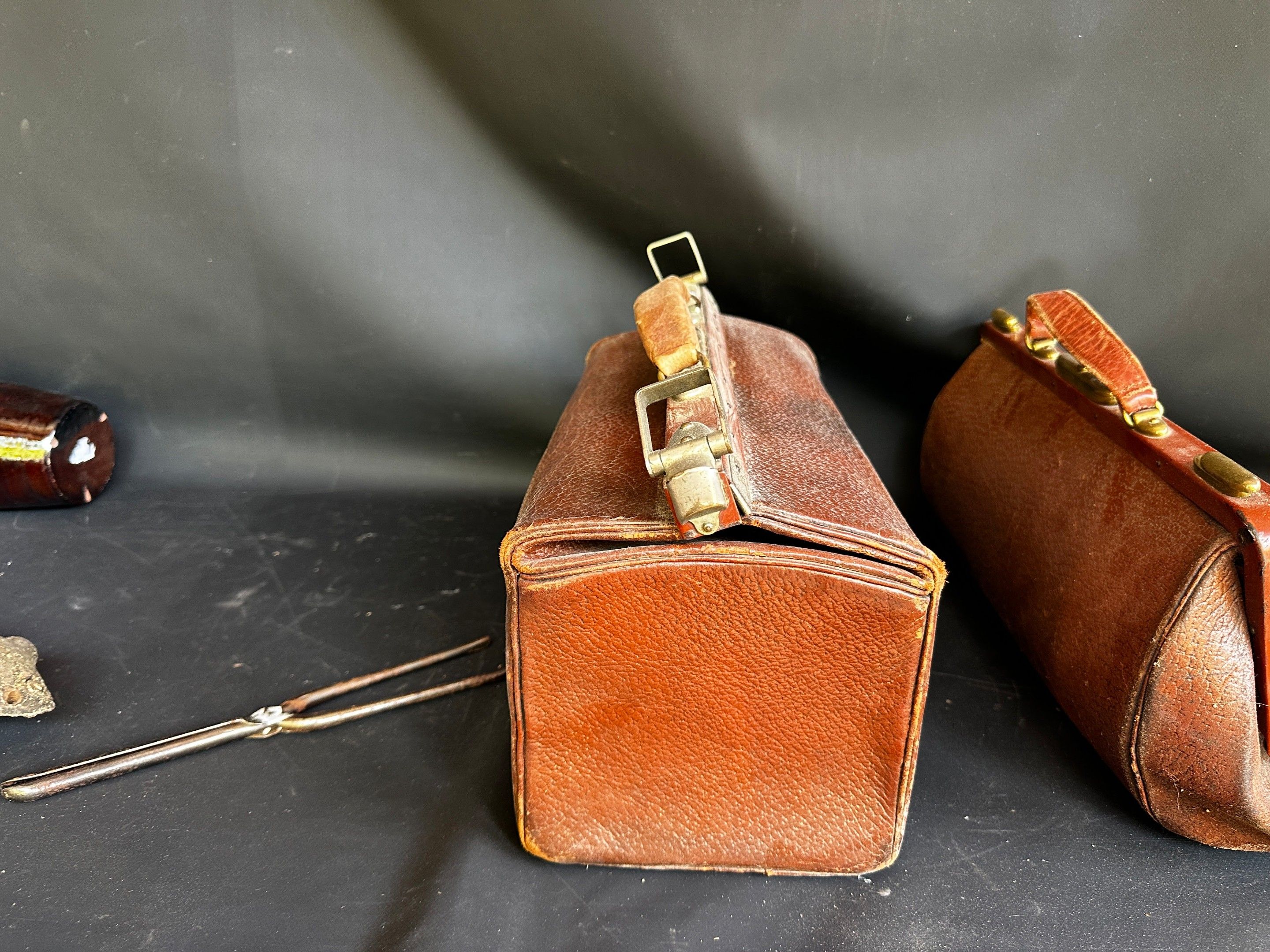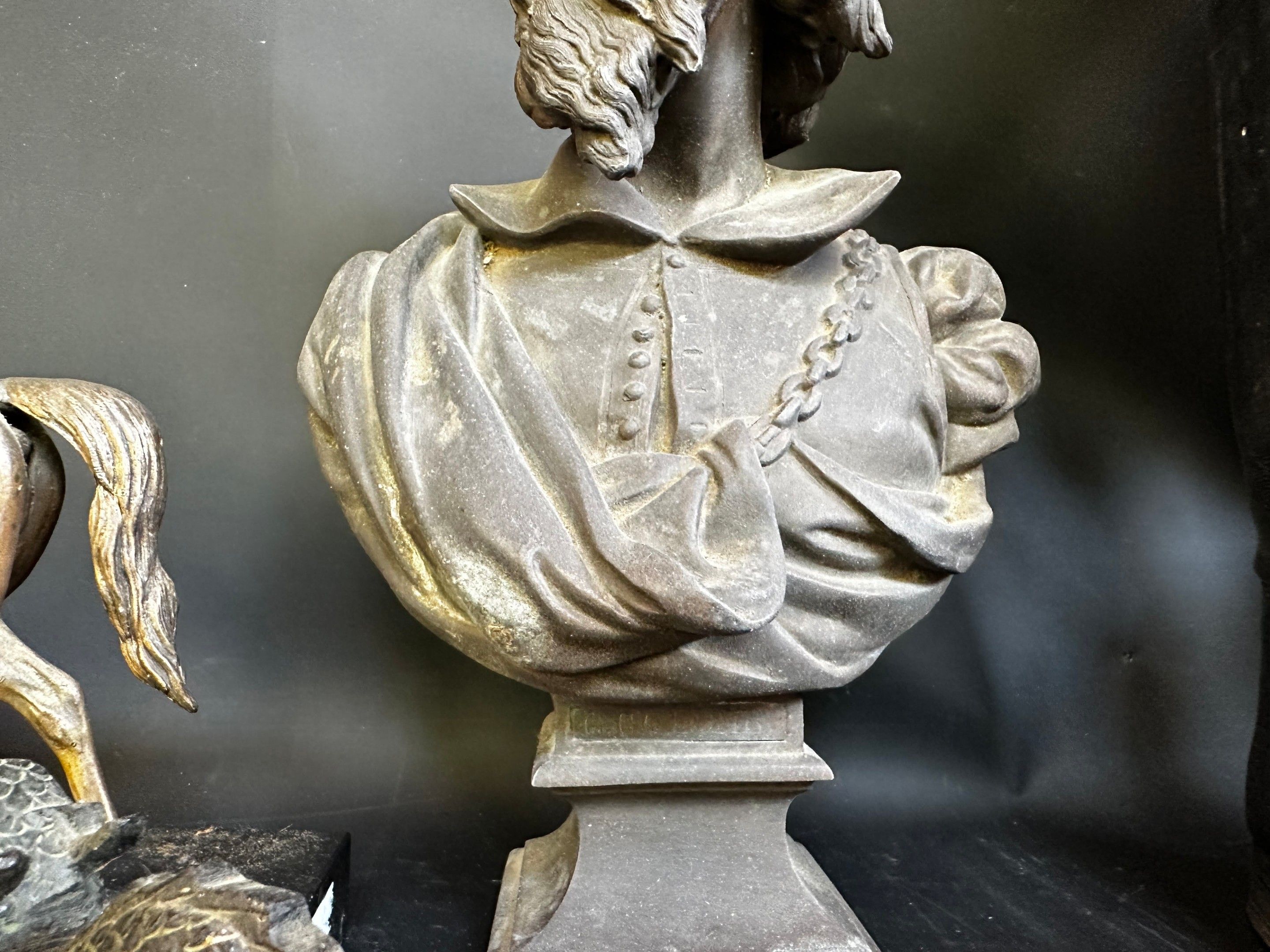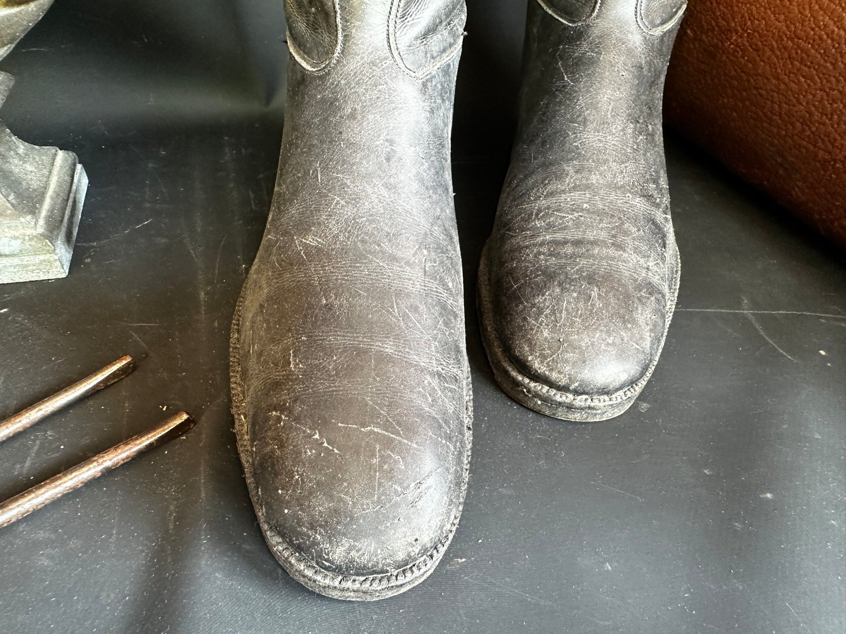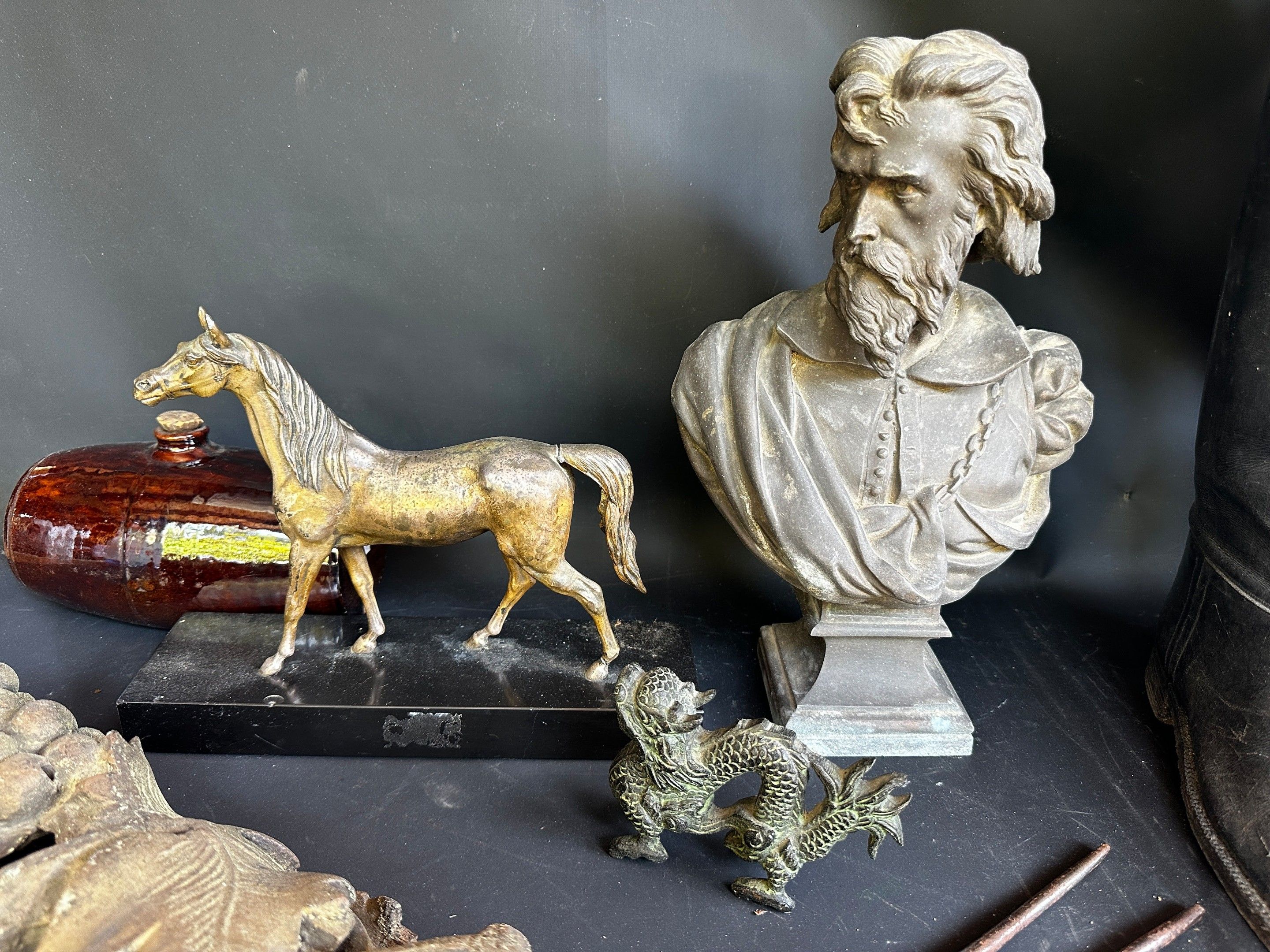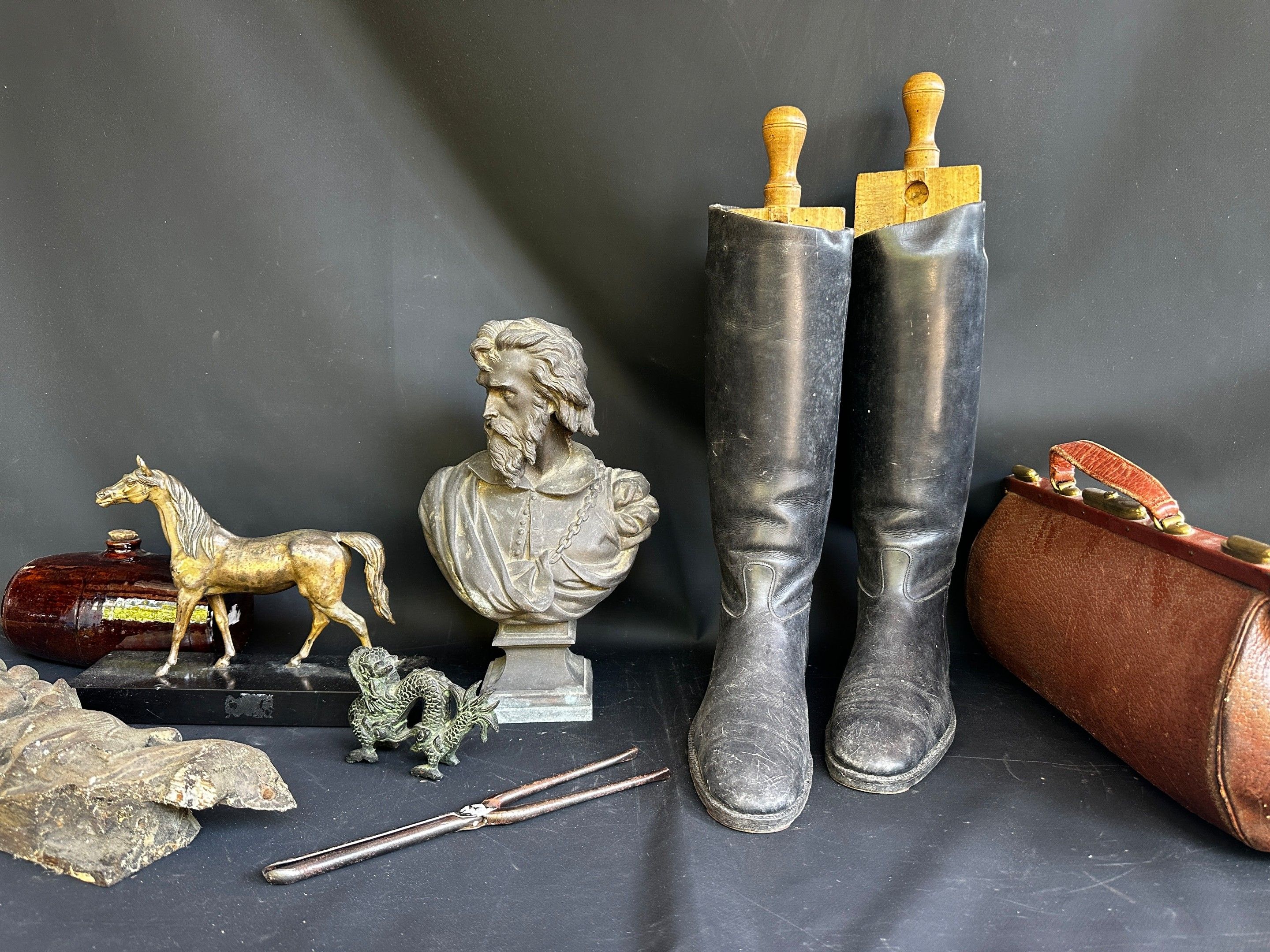 Lot comprenant des bottes de cavaliers et embauchoirs , un tonnelet en terre cuite vernissée , un buste en régule , un cheval en bronze argenté un fer à frisé , un élément décoratif en bois et deux mallettes de médecin , et un dragon chinois