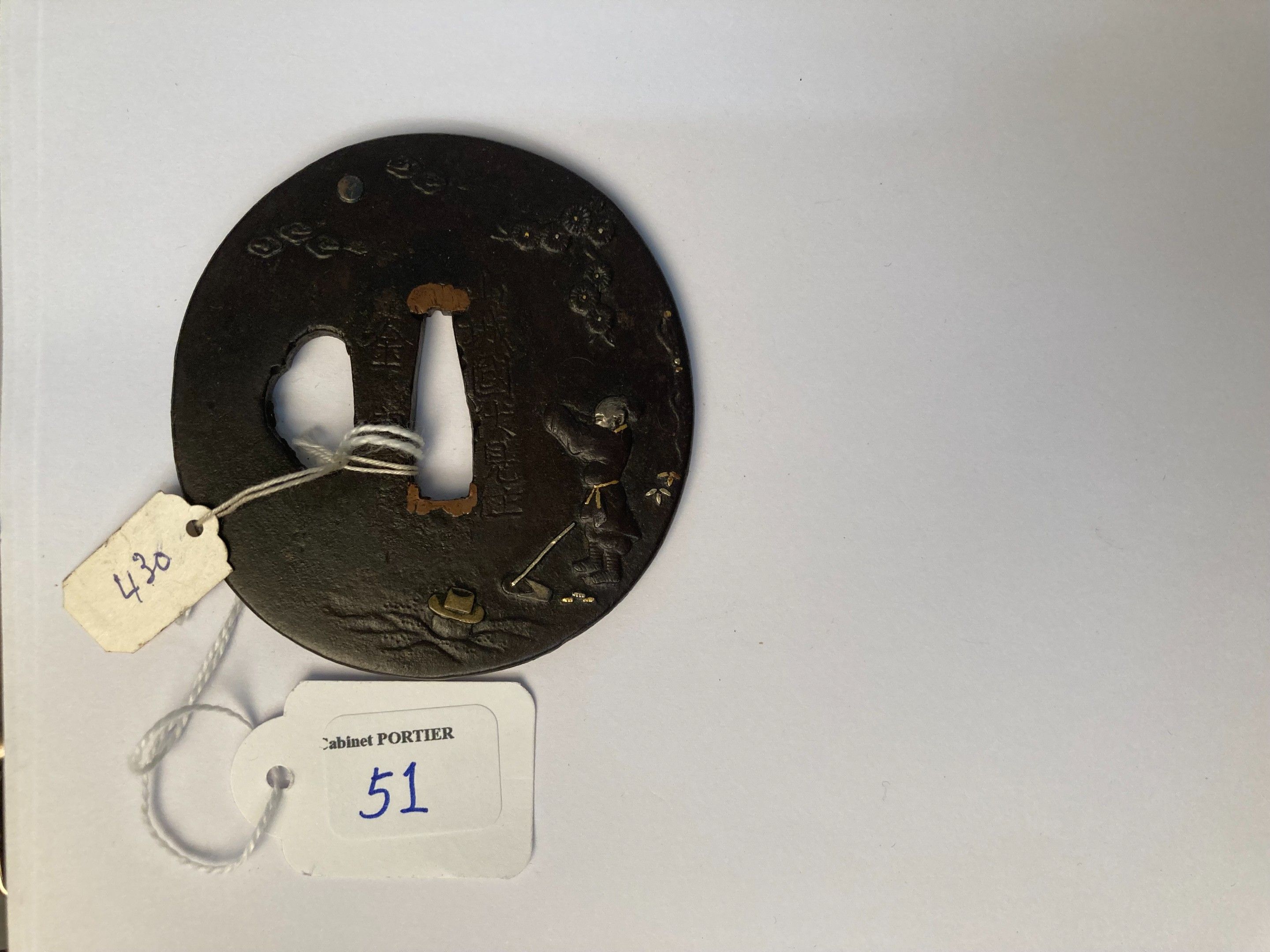 JAPON - Epoque EDO (1603 - 1868), XIXe siècle, - Nagamaru gata en fer à décor en hira zogan de cuivre doré et shibuichi d'un sennin tendant les mains vers la lune. Porte la signature apocryphe Yamashiro kuni Fushimi ju Kaneie. - H. 7 cm - - Expert : Cabinet Portier
