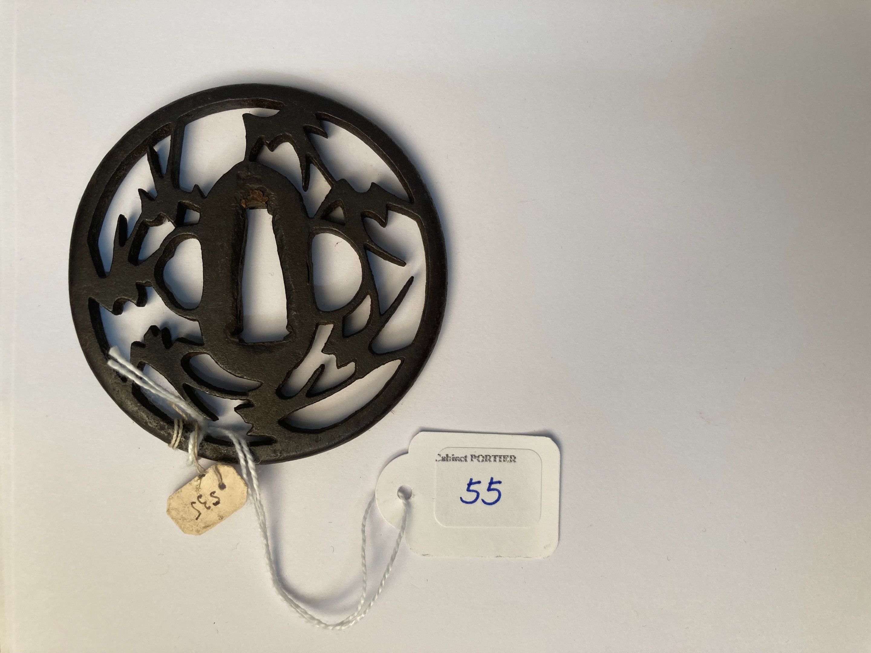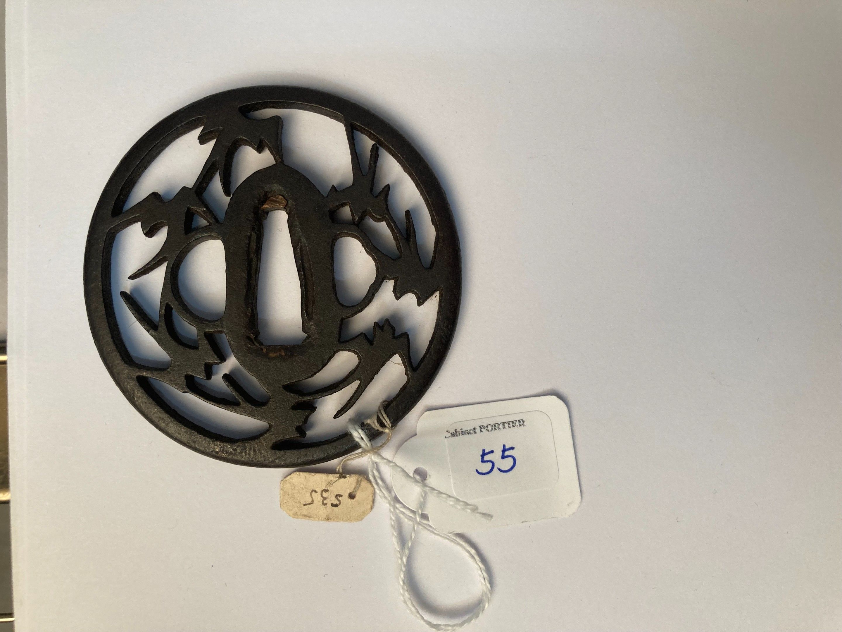 JAPON, ECOLE AKASAKA - Epoque EDO (1603 - 1868), - Maru gata en fer ajouré en yo-sukashi d'hirondelles en vol. Non signé. - H. 7,6 cm - - Expert : Cabinet Portier