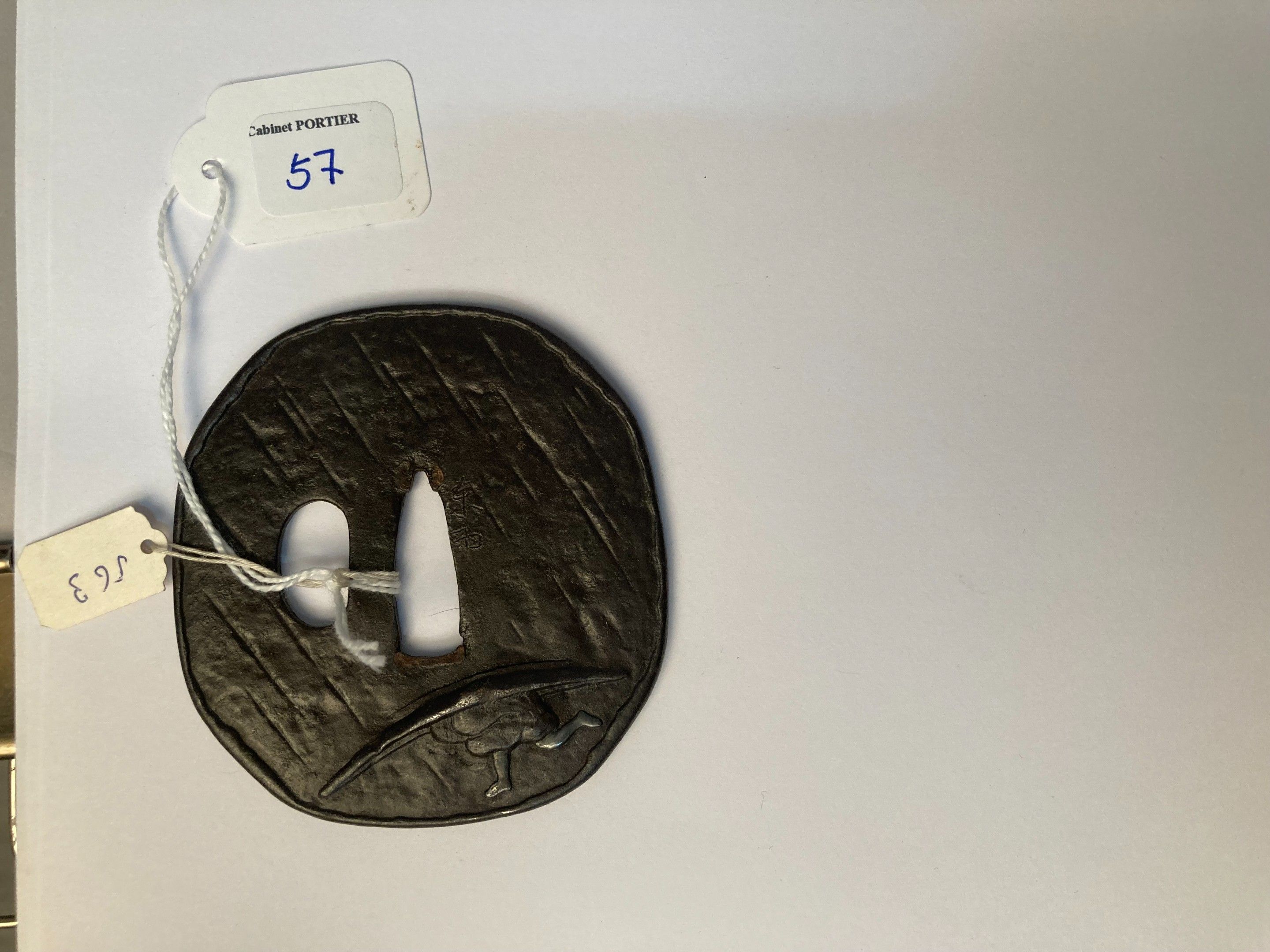 JAPON - Epoque EDO (1603 - 1868), XIXe siècle, - Haku gata en fer incrusté en hira zogan de shibuichi d'un homme se protégeant de la pluie sous un grand chapeau. Porte la signature apocryphe Tou. - H. 7,9 cm - - Expert : Cabinet Portier