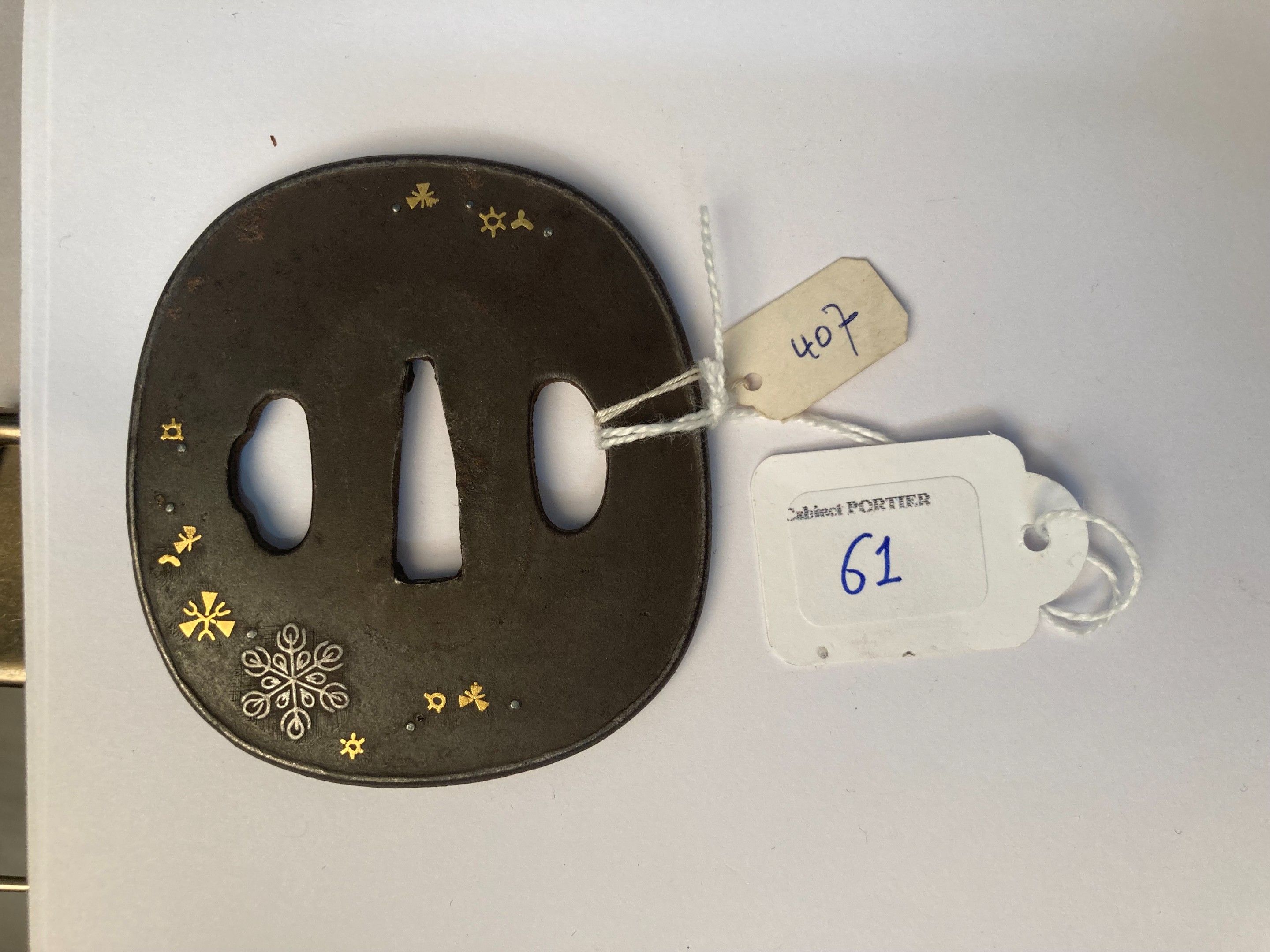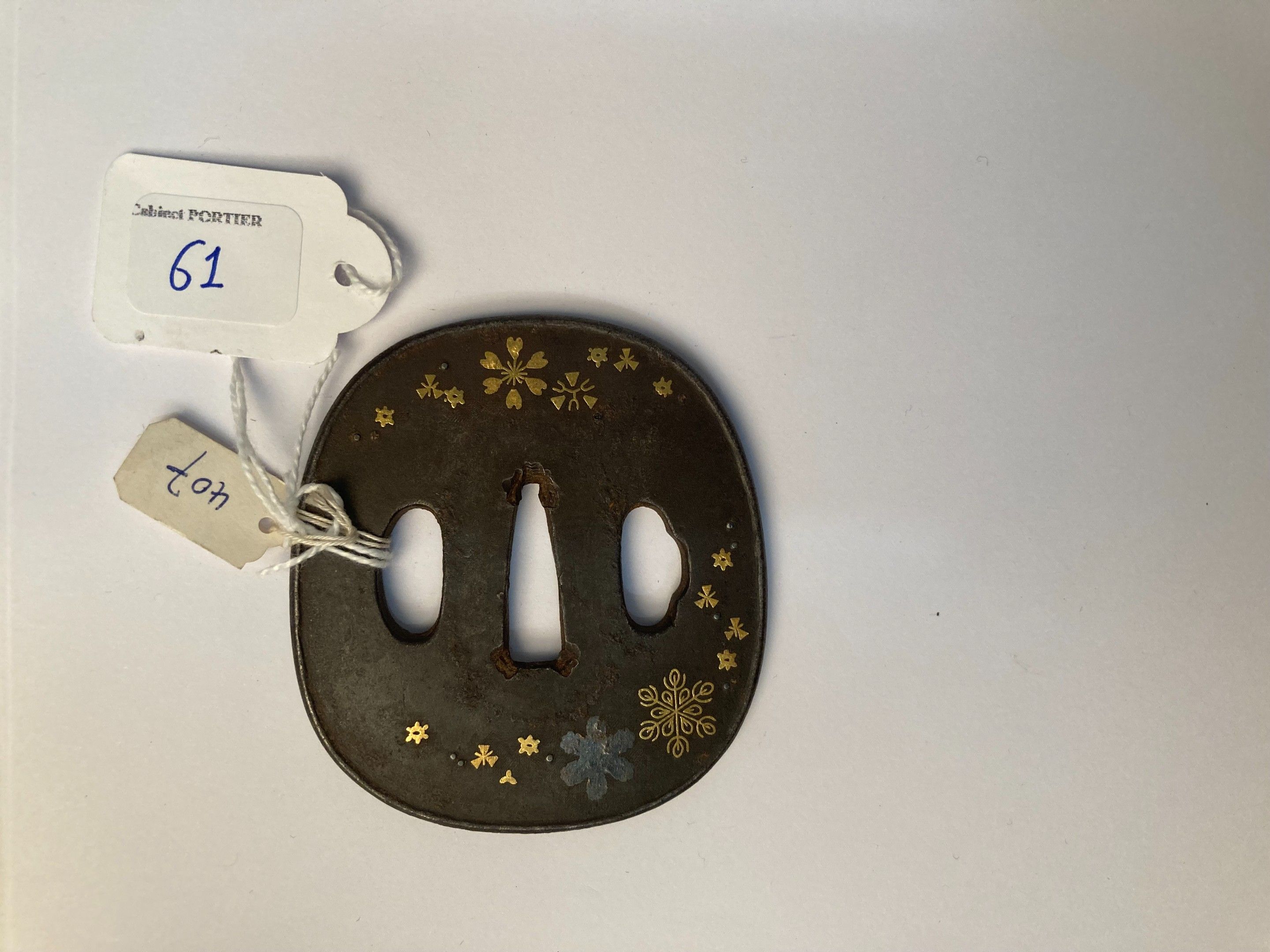 JAPON - Epoque EDO (1603 - 1868), XIXe siècle, - Nagamaru gata en fer incrusté en nunome zogan de cuivre doré et shibuichi de flocons de neige. Non signé. - H. 7,2 cm - - Expert : Cabinet Portier