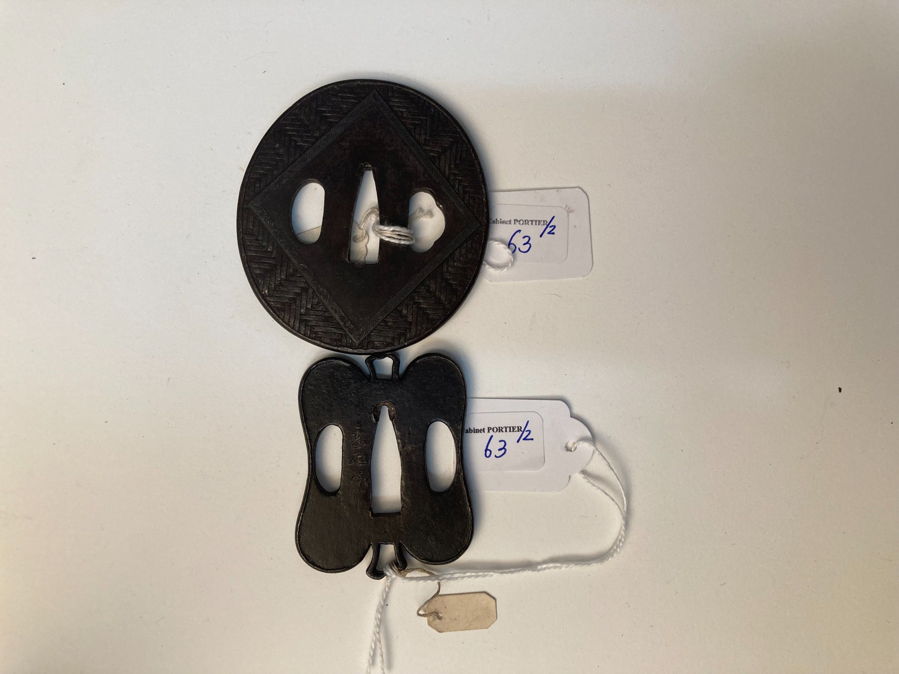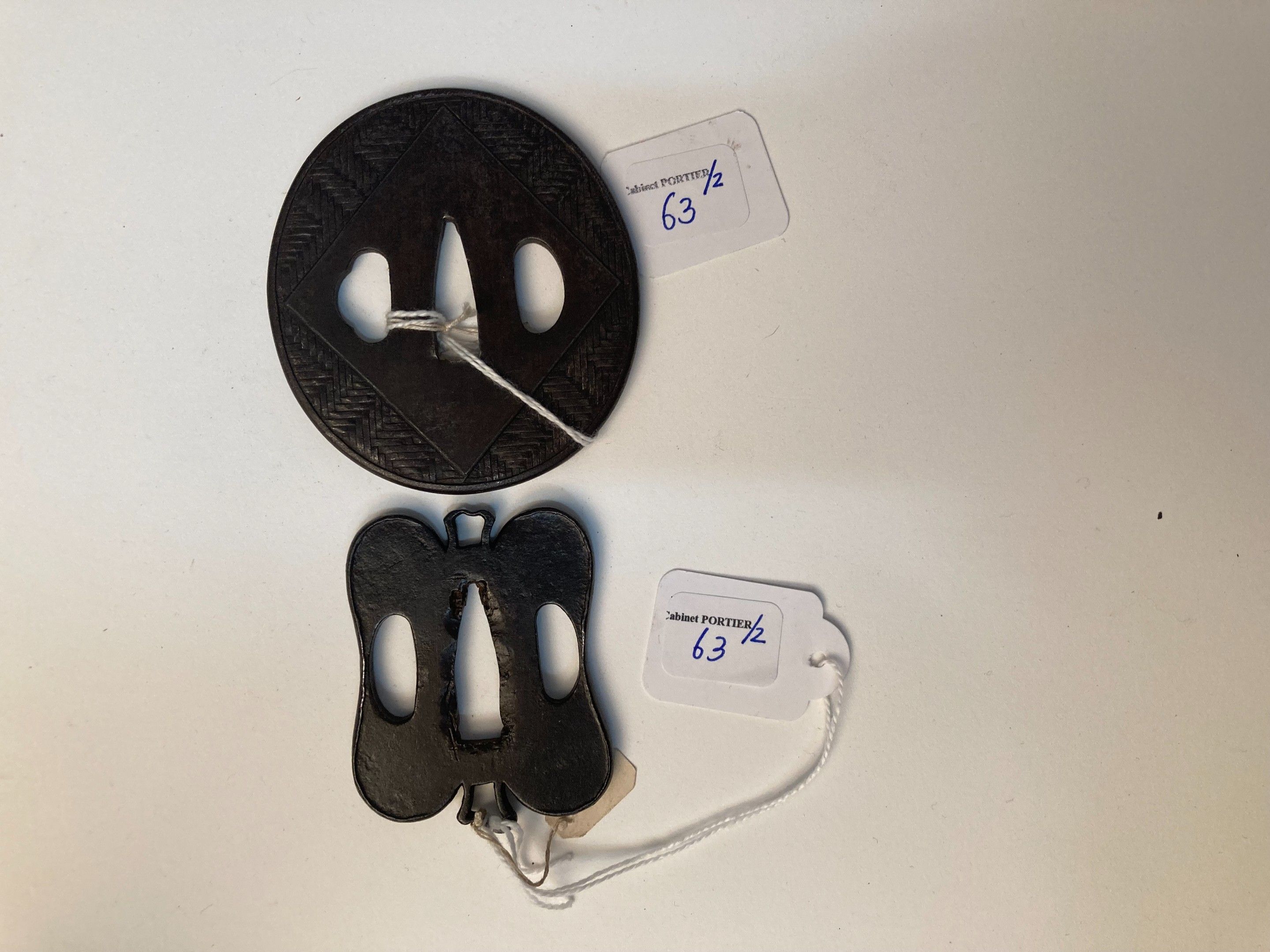 JAPON - Milieu Epoque EDO (1603 - 1868), - Deux tsuba en fer : - - nagamaru gata ciselée d'un losange sur la pointe bordée d'une frise de feuilles, sur fond de motif de vannerie. Non signé. H. 7,2 cm - - kawari gata en forme d'uchiwa. Signé de façon illisible. H. 5,9 cm - - Expert : Cabinet Portier