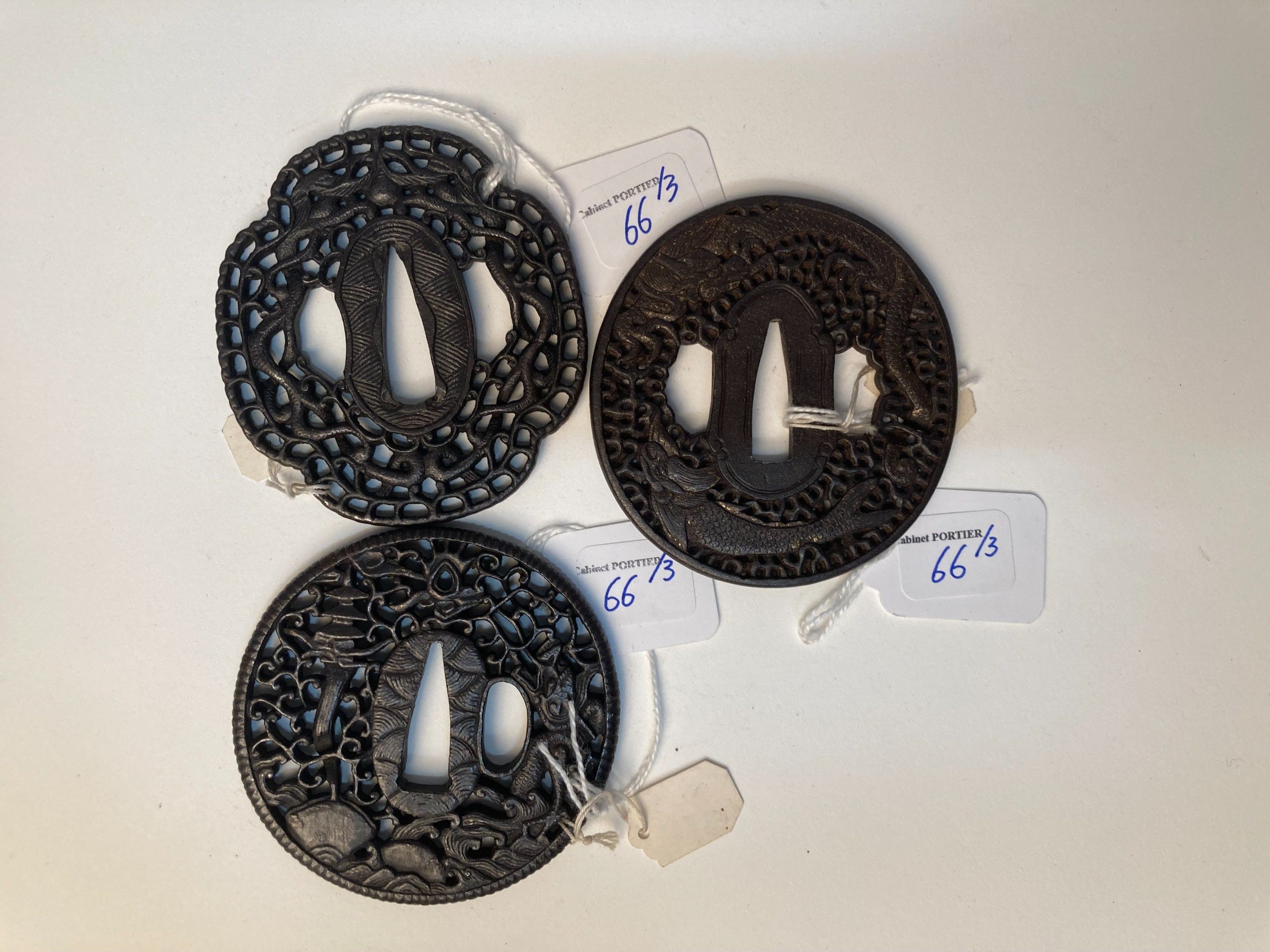 JAPON - Epoque EDO (1603 - 1868), XIXe siècle, - Trois tsuba en fer dans le style namban : - - nagamaru gata ciselé et ajouré en maru bori d'un dragon et d'un poisson dans les flots. Non signé. H. 7,2 cm - - maru gata ciselé et ajouré en maru bori d'un dragon sortant des flots pourchassant la perle sacrée. Non signé. Diam. 6,9 cm - - moko gata ajouré en maru bori de deux dragons archaïsants affrontés autour de la perle sacrée. Non signé. H. 7,2 cm - - Expert : Cabinet Portier