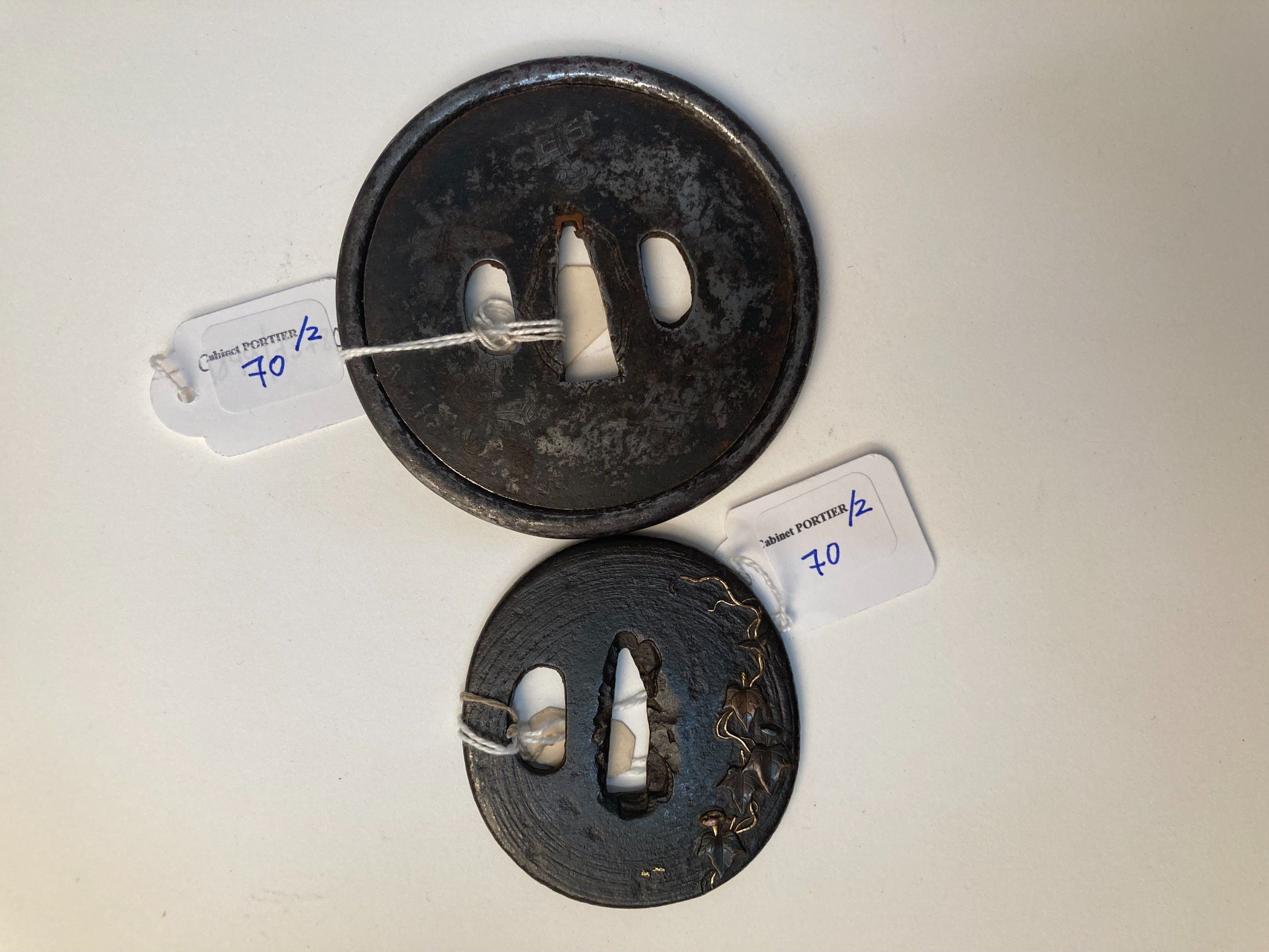 JAPON - Milieu Epoque EDO (1603 - 1868), - Deux tsuba en fer : - - petite nagamaru gata incrusté en taka zogan de cuivre doré de feuilles et vrilles de vignes. Non signé. (usures). H. 6,1 cm - - Maru gata en fer dépatiné ciselé de sapèques dans des rinceaux végétaux sur une face et des objets de bon augure. Mimi en relief. Non signé. Diam. 8,4 cm - - Expert : Cabinet Portier