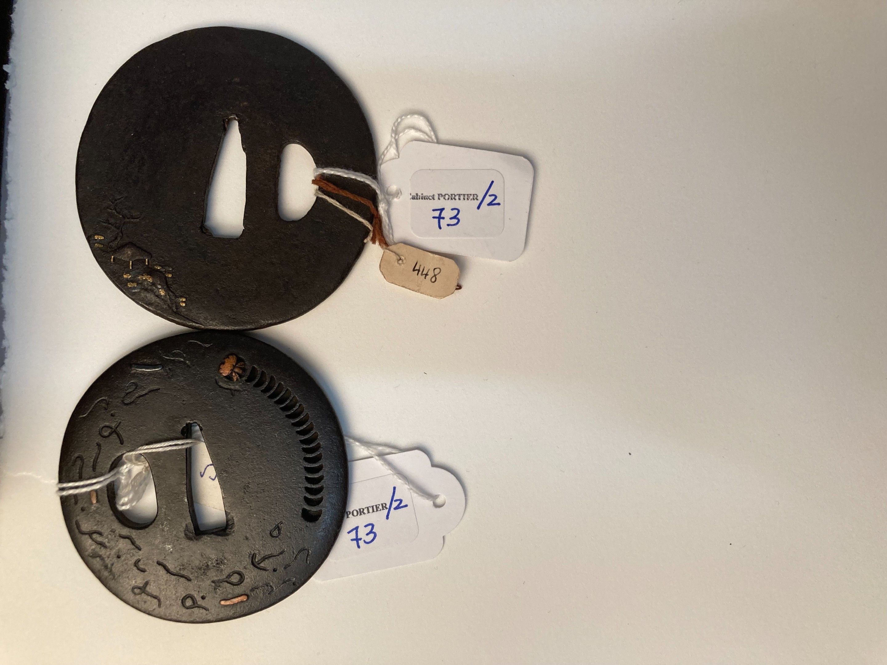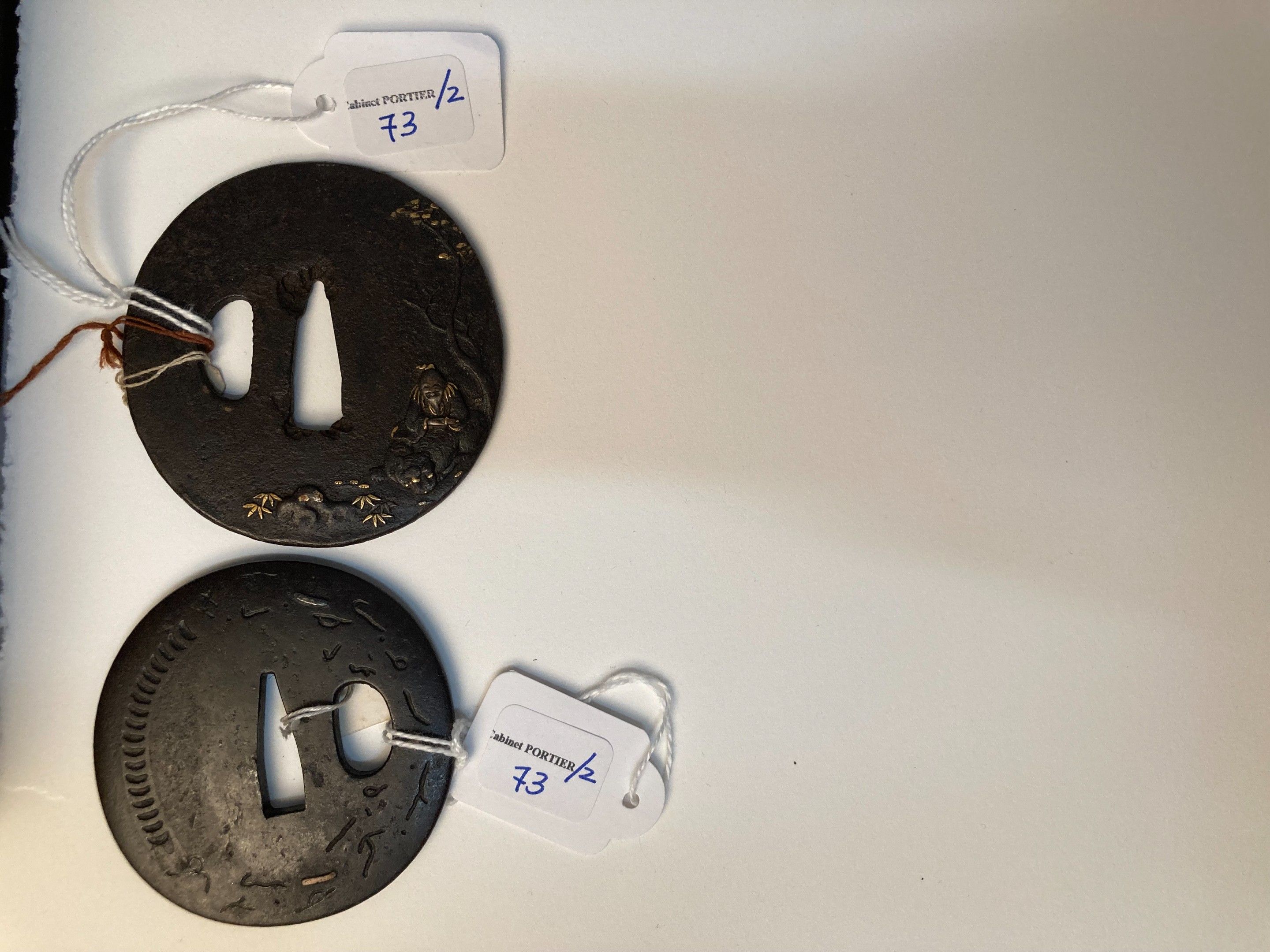 JAPON - Epoque EDO (1603 - 1868), XIXe siècle, - Ensemble de deux maru gata en fer : - - ciselé et incrusté en hira zogan de shibuichi et cuivre doré du sennin Bukan Zenshi sur son tigre. Non signé. H. 7 cm - - incisé et ajouré d'un mille-pattes. Non signé. H. 6,4 cm - - Expert : Cabinet Portier