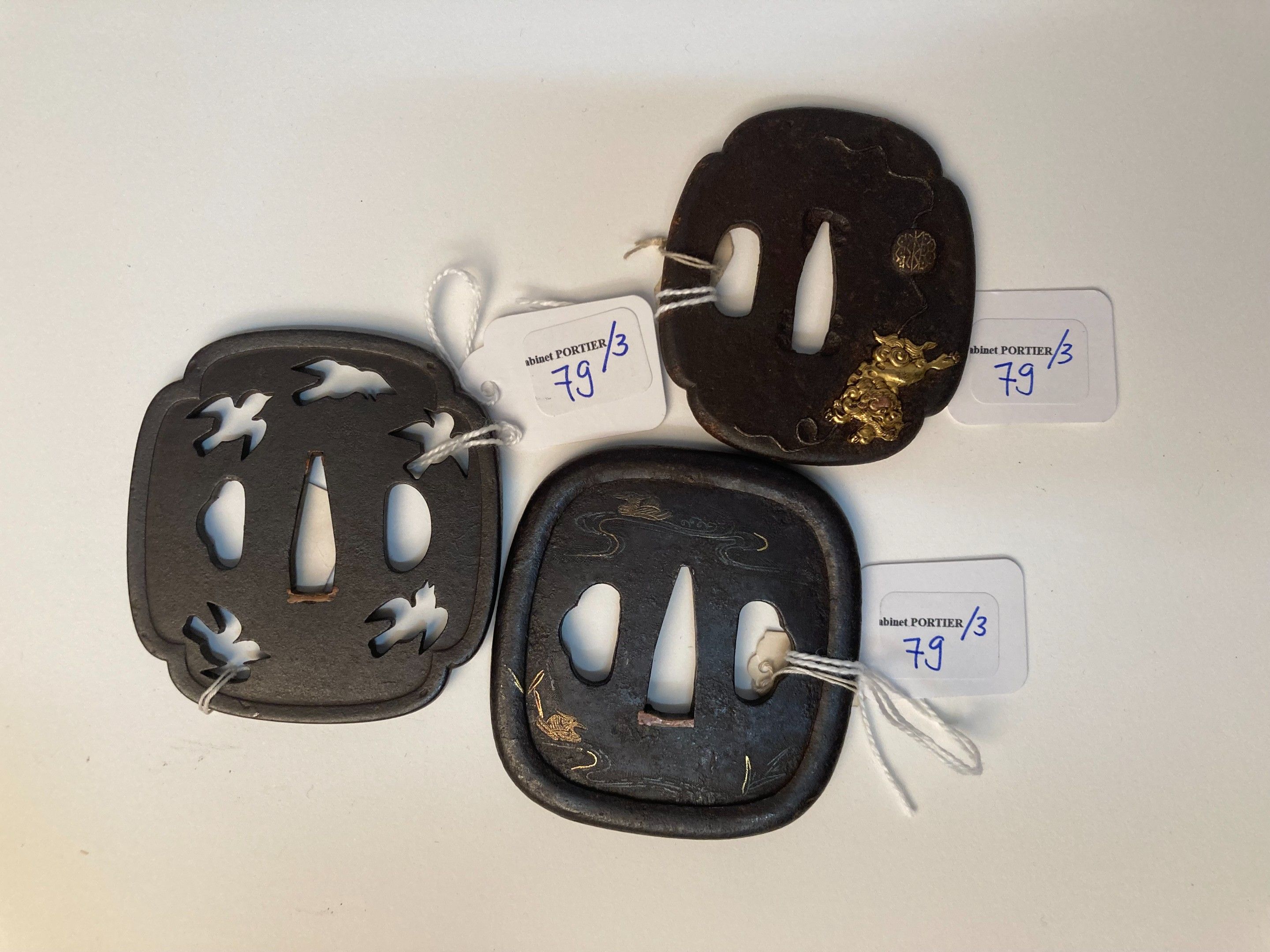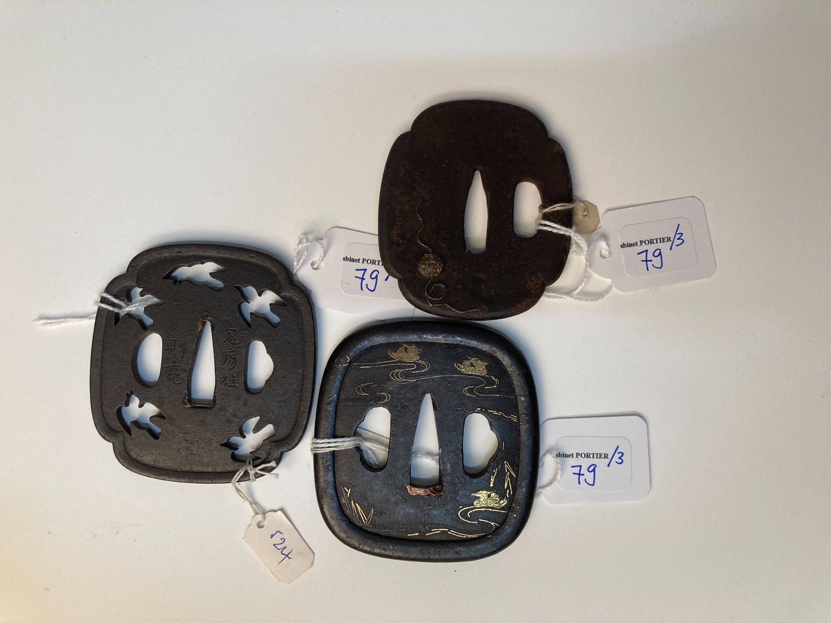 JAPON - Epoque EDO (1603 - 1868), XIXe siècle, - Ensemble de trois tsuba en fer : - - Mokko gata incrusté en taka zogan de cuivre doré de shishi jouant avec une balle. Non signé. H. 6,6 cm - - Mokko gata ajouré en kage sukashi d'hirondelles en vol. Signé Bishu (no) ju Norisuke. H. 7,1 cm - - Hira kaku gata incrusté en hira zogan de cuivre doré de canards sur un cour d'eau. Non signé. H. 7 cm - - Expert : Cabinet Portier