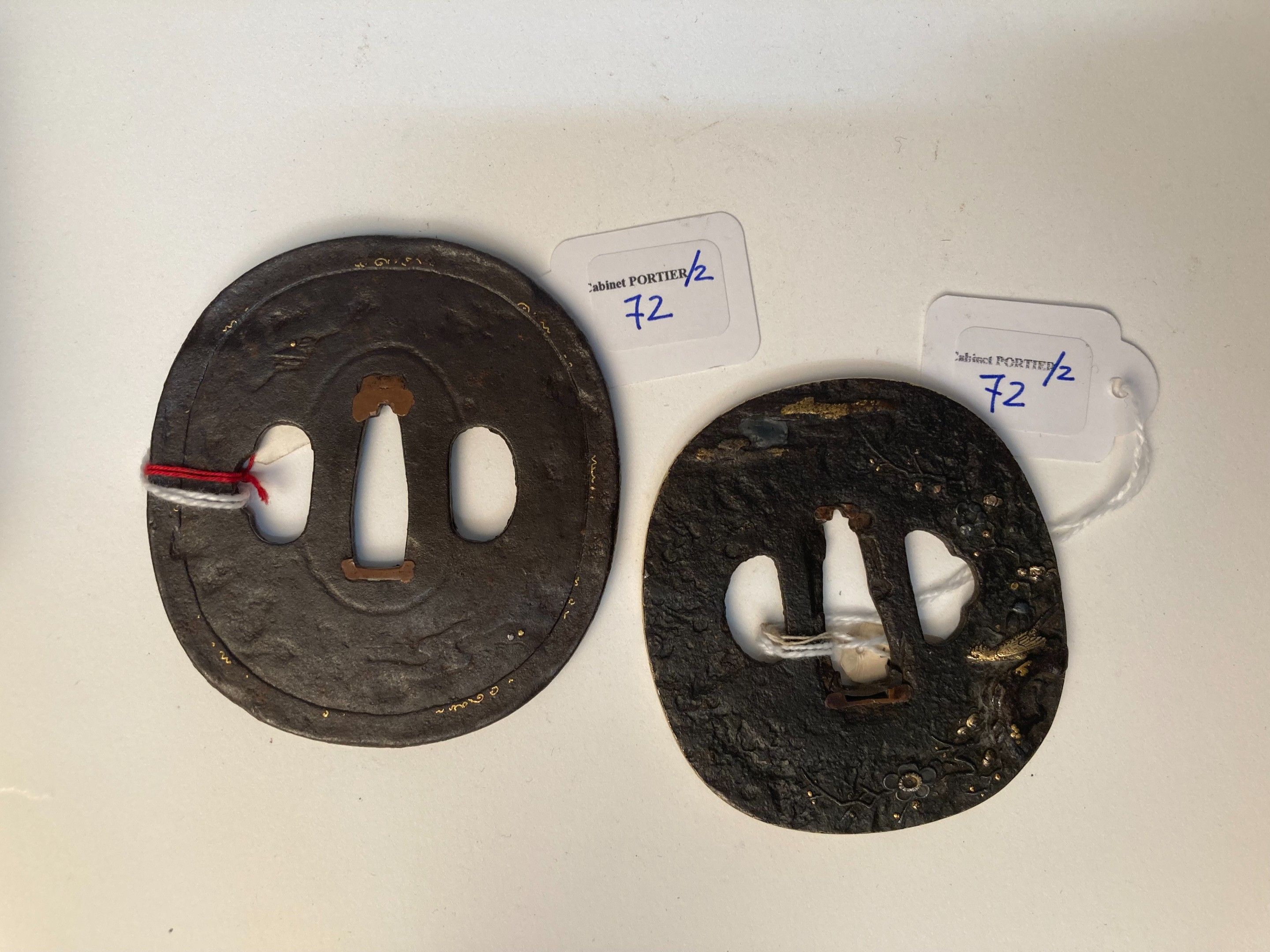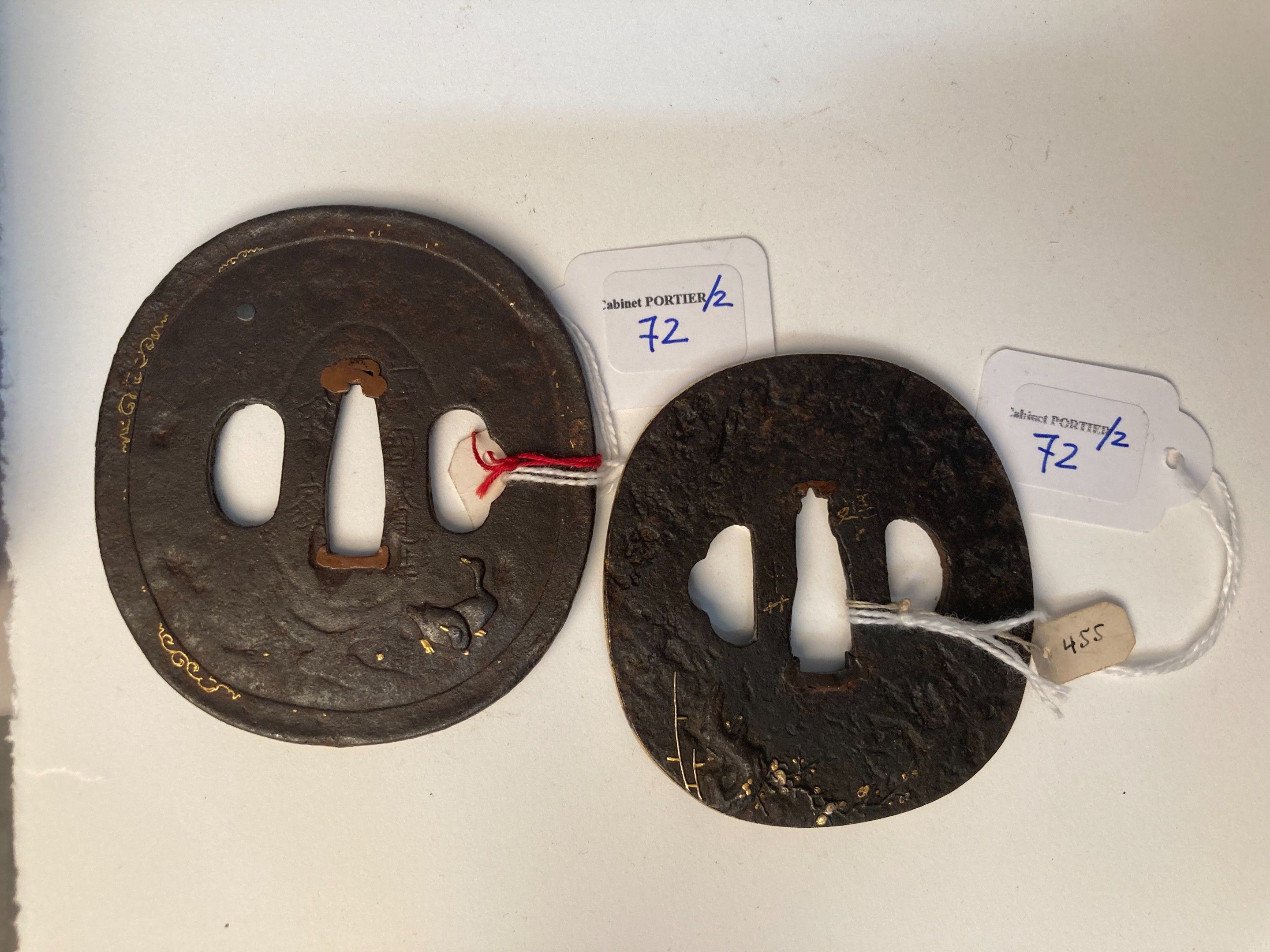 JAPON - Epoque EDO (1603 - 1868), XIXe siècle, - Ensemble de trois tsuba en fer : - - Kawari gata en forme de noshi (awabi séché) enroulé. Signé Kofu (no) ju Mitsuyoshi. H. 6,8 cm - - Mokko gata en forme d'awabi. Non signé. H. 7 cm - - Mokko gata ajouré en kage sukashi de quatre reishi. Non signé. H. 6,3 cm - - Expert : Cabinet Portier