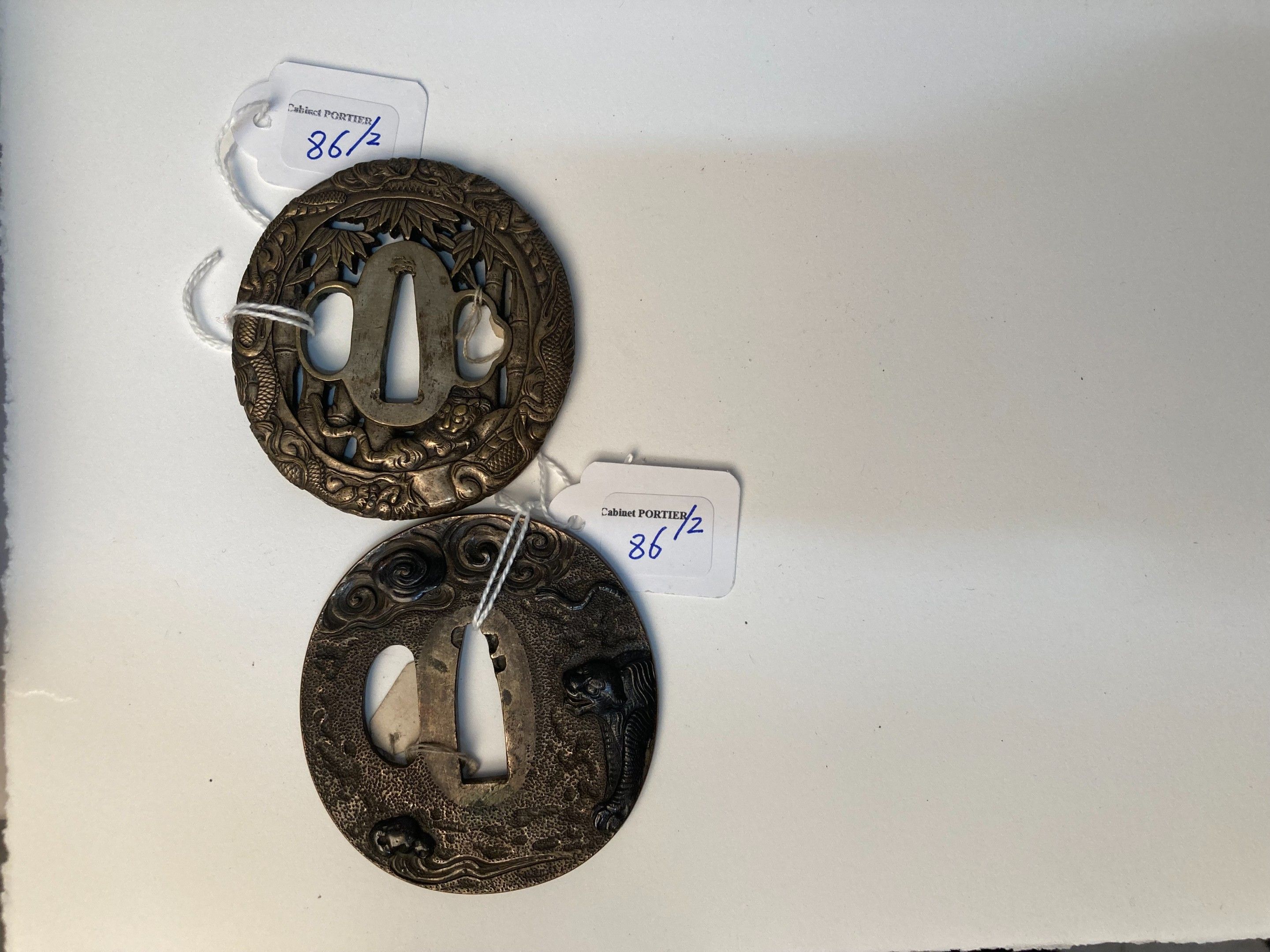 JAPON - Epoque MEIJI (1868 - 1912), - Ensemble de deux nademaru gata en sentoku : - - ciselé en maru bori de tigre dans les bambous, le mimi ciselé de dragons en vol. Non signé. (Frotté) H. 7,1 cm - - incrusté en hira zogan de shibuichi de tigre et nuages. Non signé. H. 7,2 cm - - Expert : Cabinet Portier