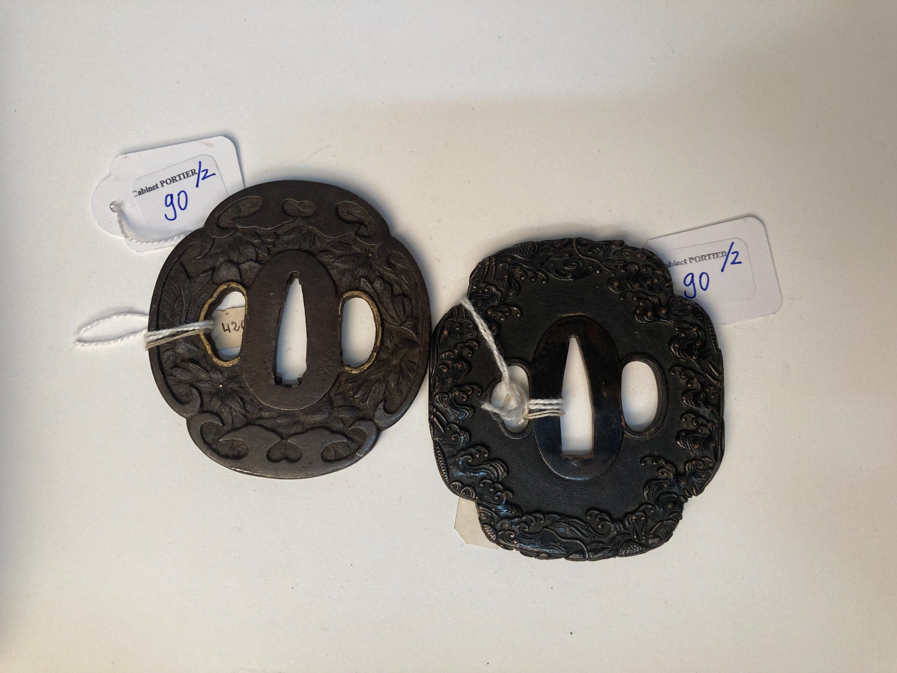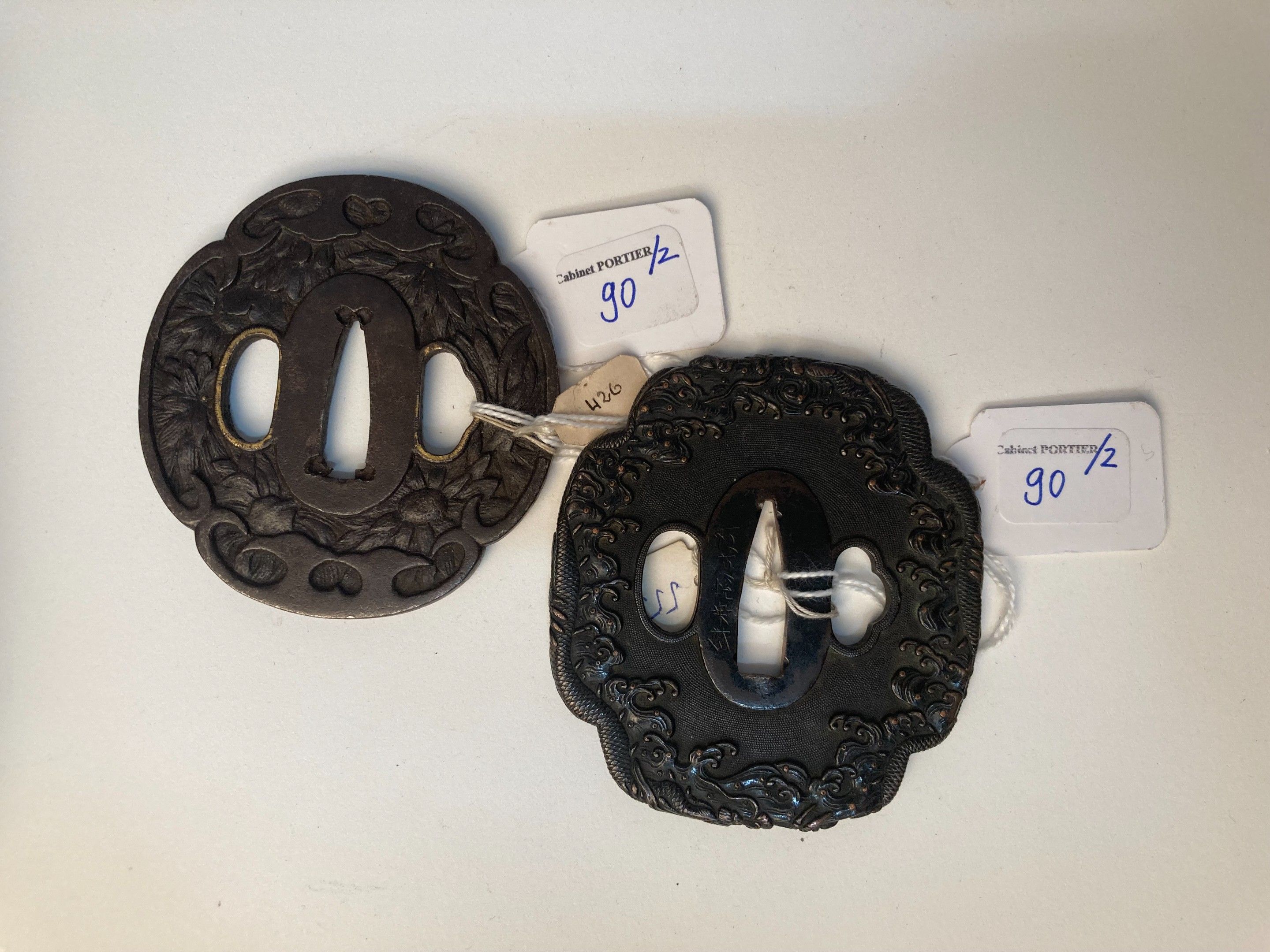 JAPON - Epoque EDO (1603 - 1868), XIXe siècle et Epoque MEIJI (1868 - 1912), - Deux tsuba : - - mokko gata en fer à décor ciselé en hira bori de fleurs de chrysanthèmes dans un cadre festonné. Les pourtours des ana dorés. Non signé. H. 7,4 cm - - mokko gata en shibuishi à décor ciselé de dragon sinuant dans les flots sur le mimi, sur fond nanako. Signé ... Etsujo. H. 7,7 cm - - Expert : Cabinet Portier