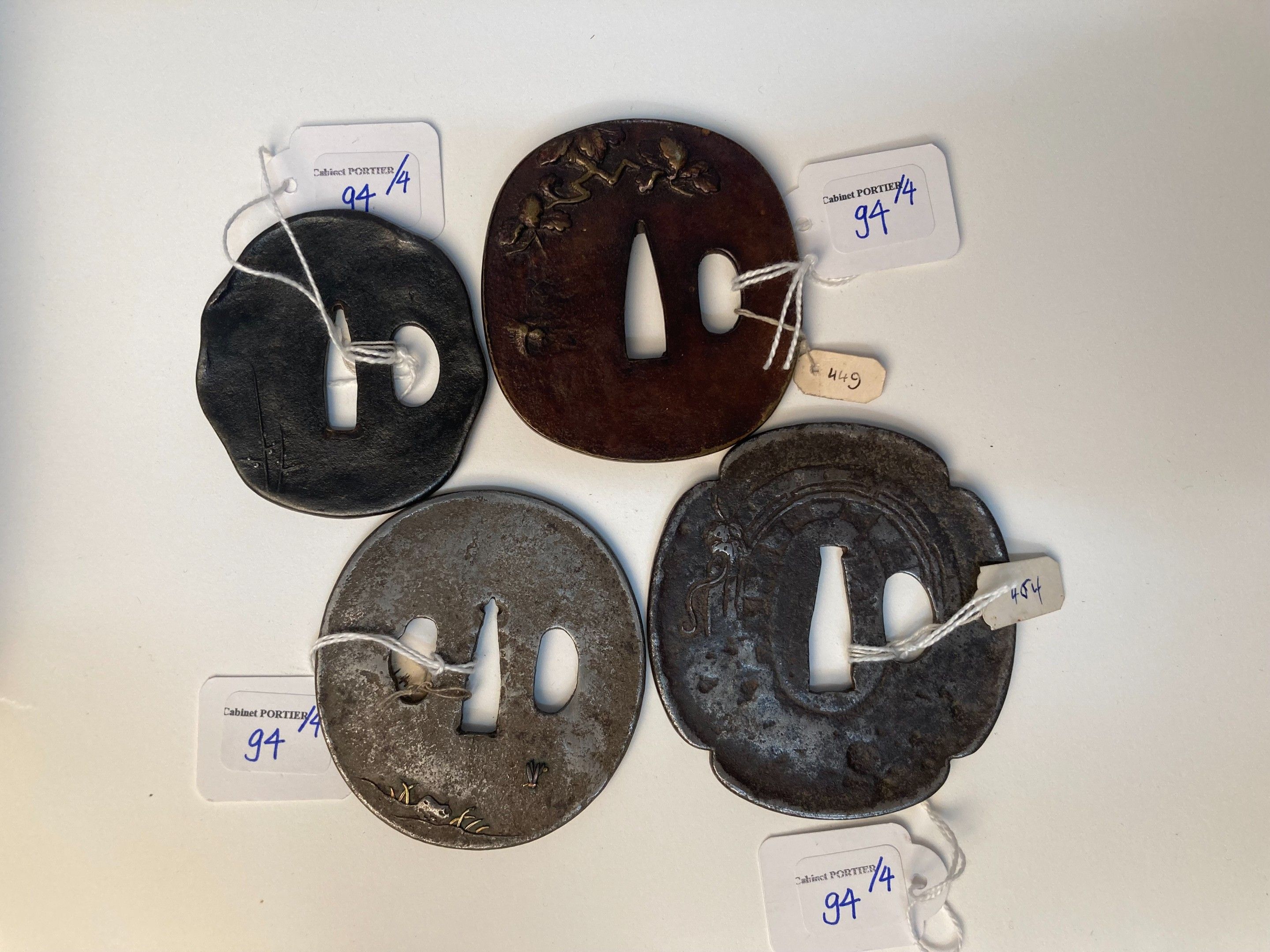 JAPON - Epoque EDO (1603 - 1868), XIXe siècle, - Ensemble de quatre tsuba : - - Nademaru gata en fer incrusté en hira zogan de cuivre doré et shibuichi de guêpes au-dessus d'un pont. Non signé. (Dépatiné) H. 7,3 cm - - Kobushi gata en fer ciselé en hira zogan de shibuichi de prunier fleurissant. Non signé. H.6,5 cm - - Mokko gata en fer ciselé en hira bori de vrilles de vigne. Signé Nobuie. (Dépatiné) H. 8,2 cm Ecole Myochin - - Nagamaru gata en sentoku laqué ciselé en taka bori d'aigle sur un tronc d'arbre. Signature illisible. H. 7,2 cm - - Expert : Cabinet Portier