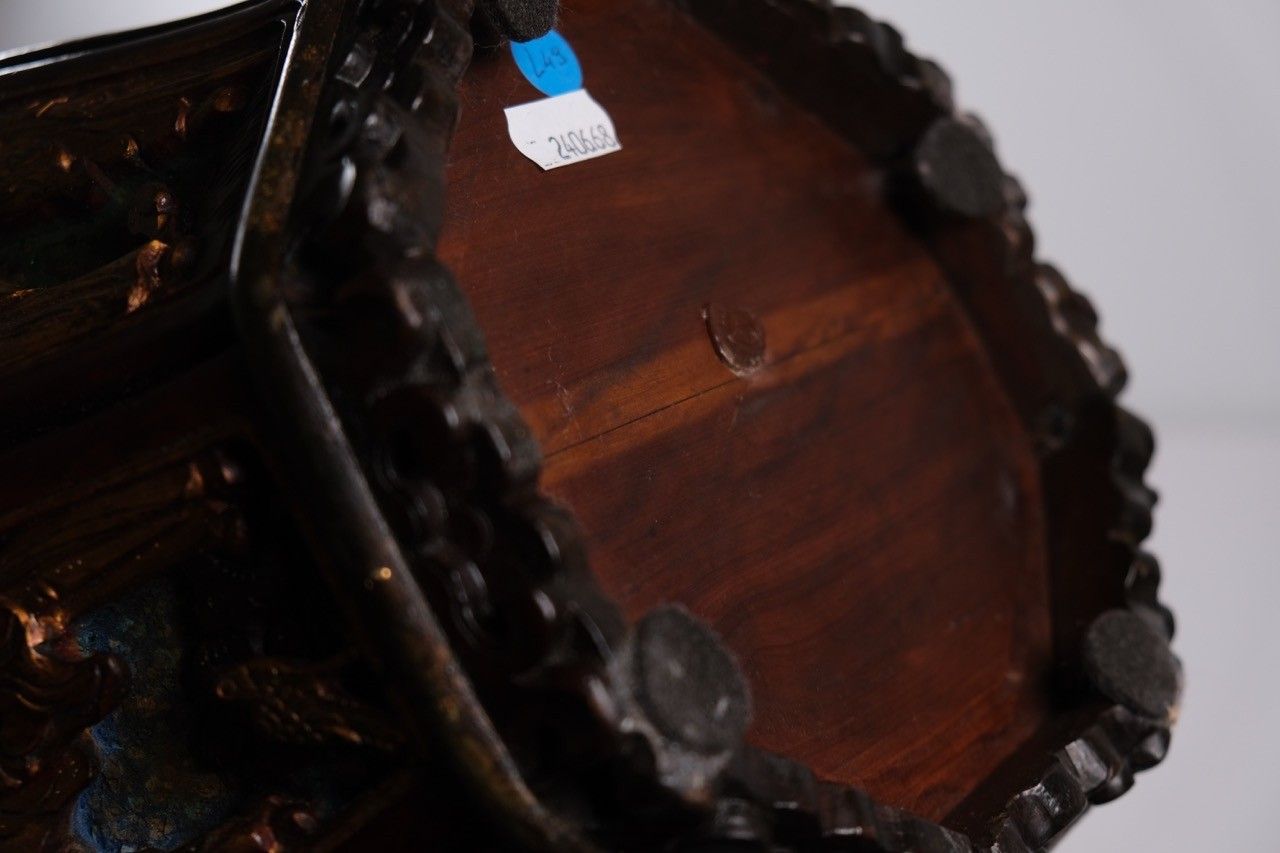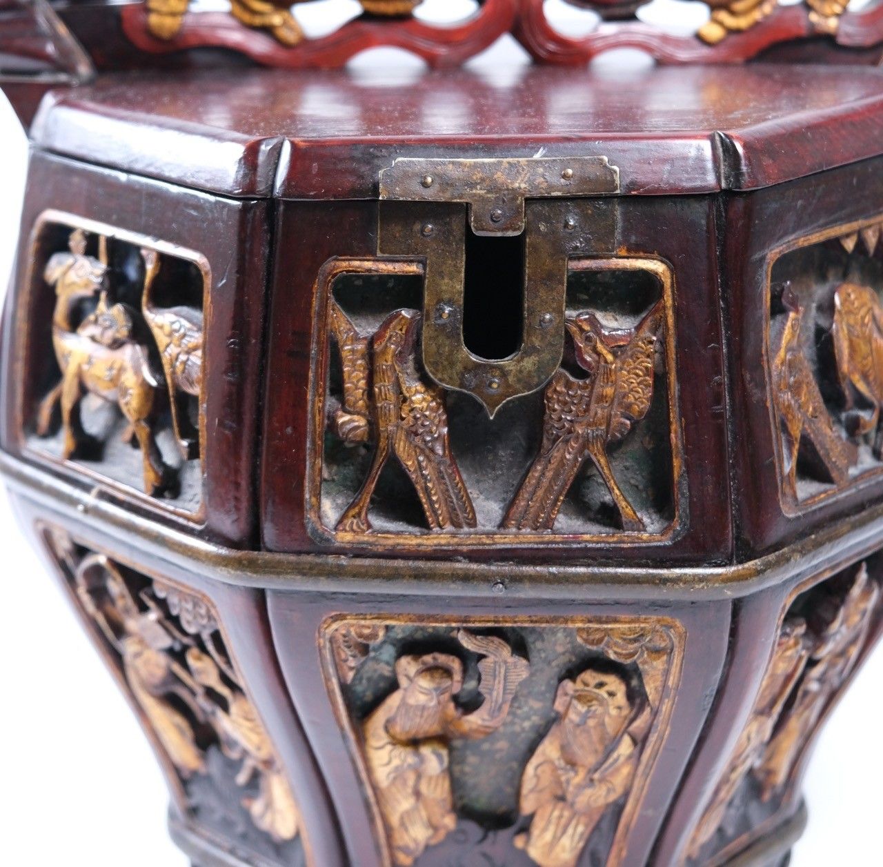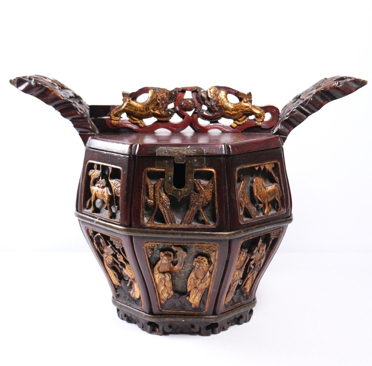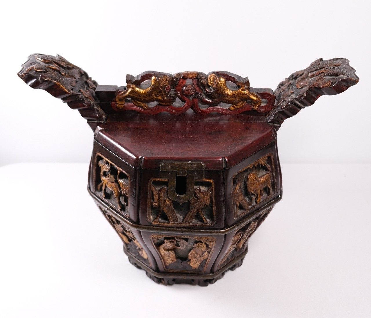 Boîte à théière en bois laqué et doré à décor d'animaux et de personnages. Chine, fin XIXe - début XXe. H : 31, D : 24 cm