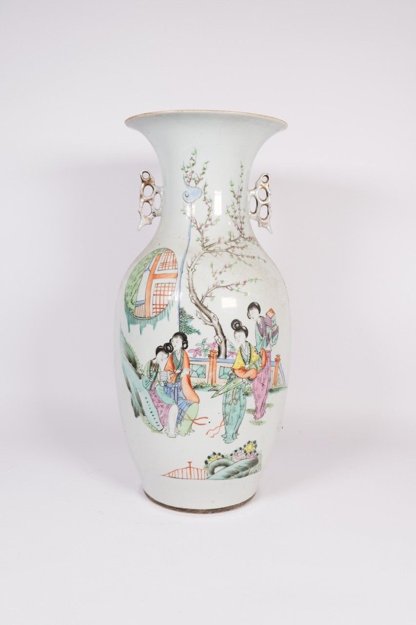 Vase en porcelaine et émaux polychrome de Chine à décor de musiciennes. XXe siècle. H : 43 cm