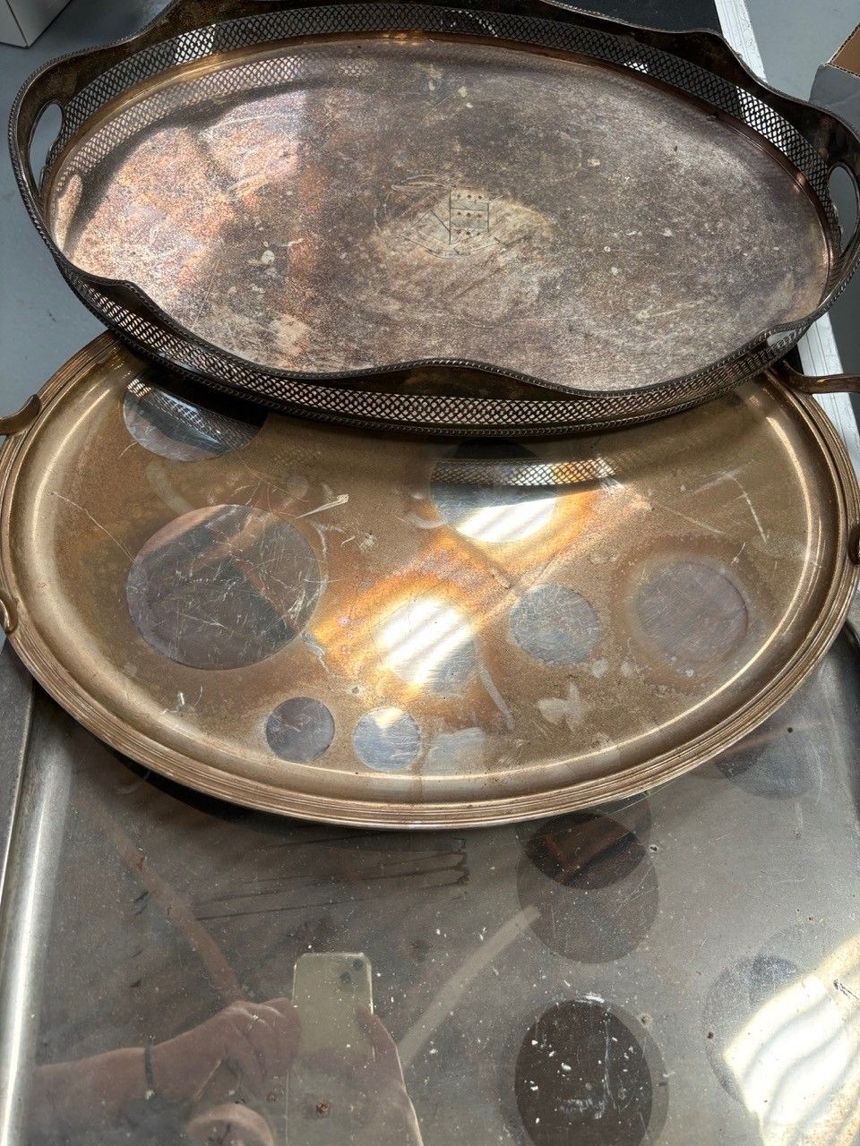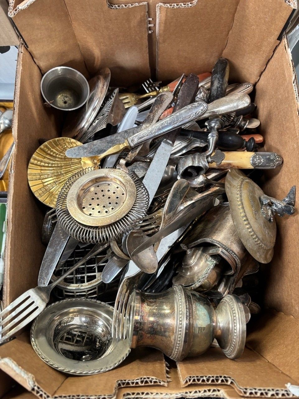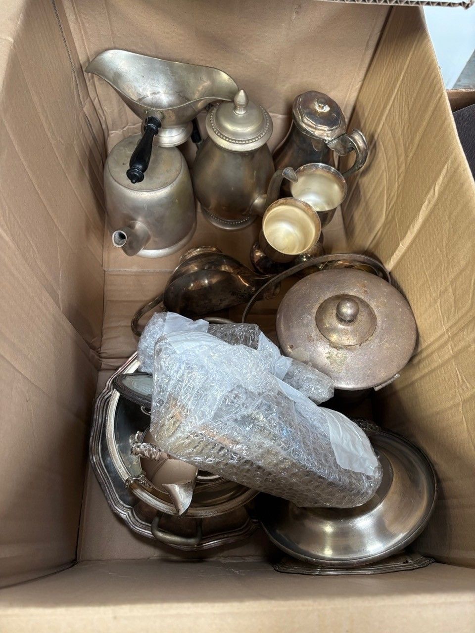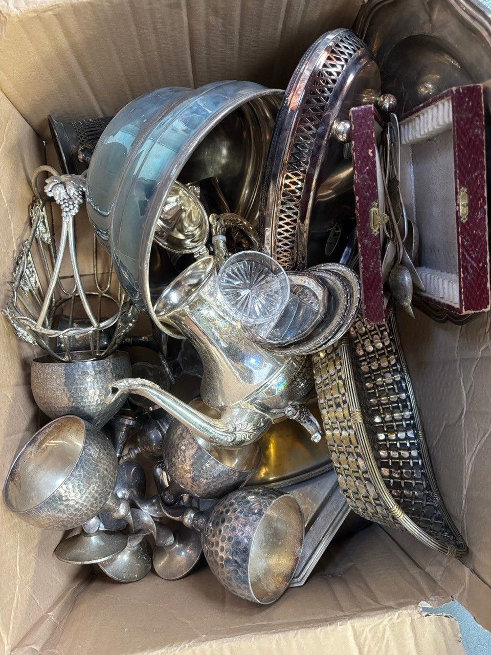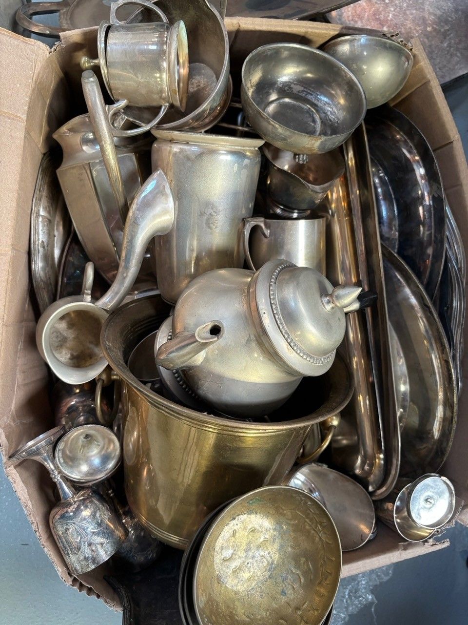 Important lot de pièces en métal argenté, laiton dont pièces de forme, plateaux, seau à champagne, nécessaire de toilette, chauffe-plat, couverts... Dans 4 cartons. Lot situé dans notre box à Lorient - Enlèvement : UNIQUEMENT le jeudi 27/11 de 14h à 17h ou le mardi 2 décembre de 9h à 12h