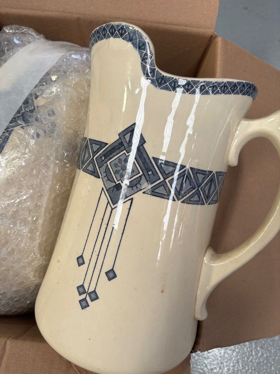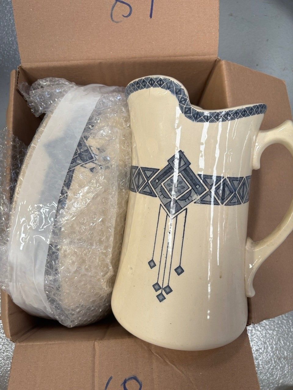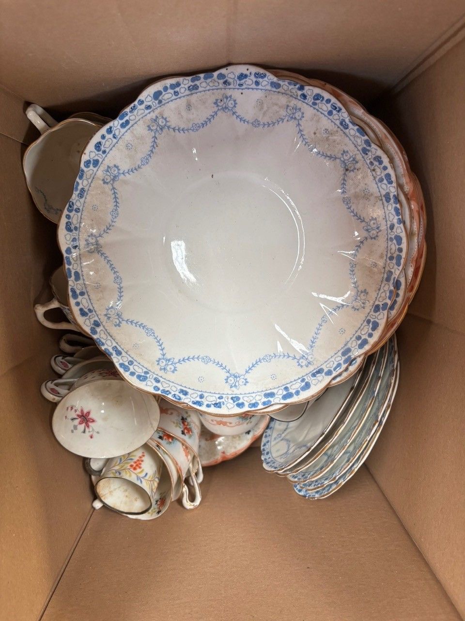 Lot de tasses, sous-tasses, assiettes en porcelaine, broc et bassin de toilette en faïence. Dans un 2 cartons (accidents et manques) Lot situé dans notre box à Lorient - Enlèvement : UNIQUEMENT le jeudi 27/11 de 14h à 17h ou le mardi 2 décembre de 9h à 12h