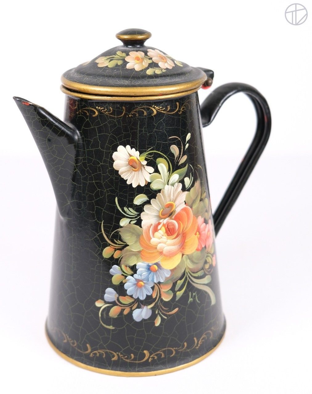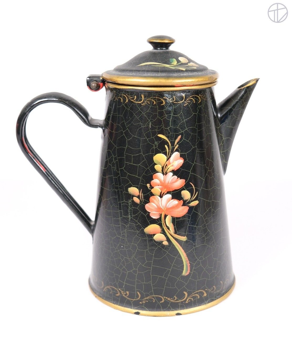Cafetière en métal peint à décor de fleurs sur fond noir
