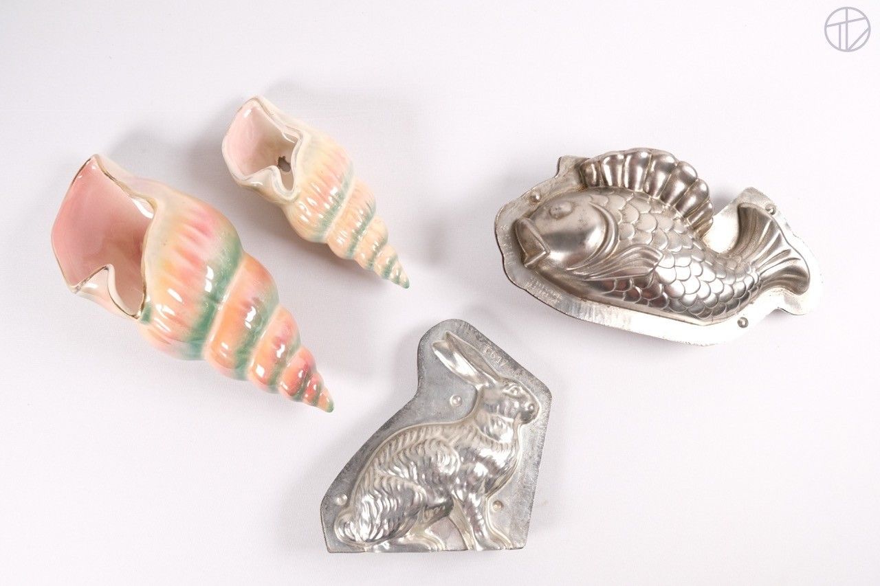 2 moules à chocolat à décor de poisson et de lapin. Il est joint 2 bulots en faïence de Fives-Lille