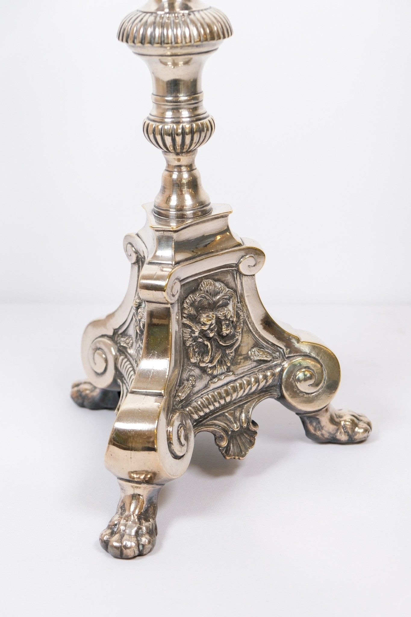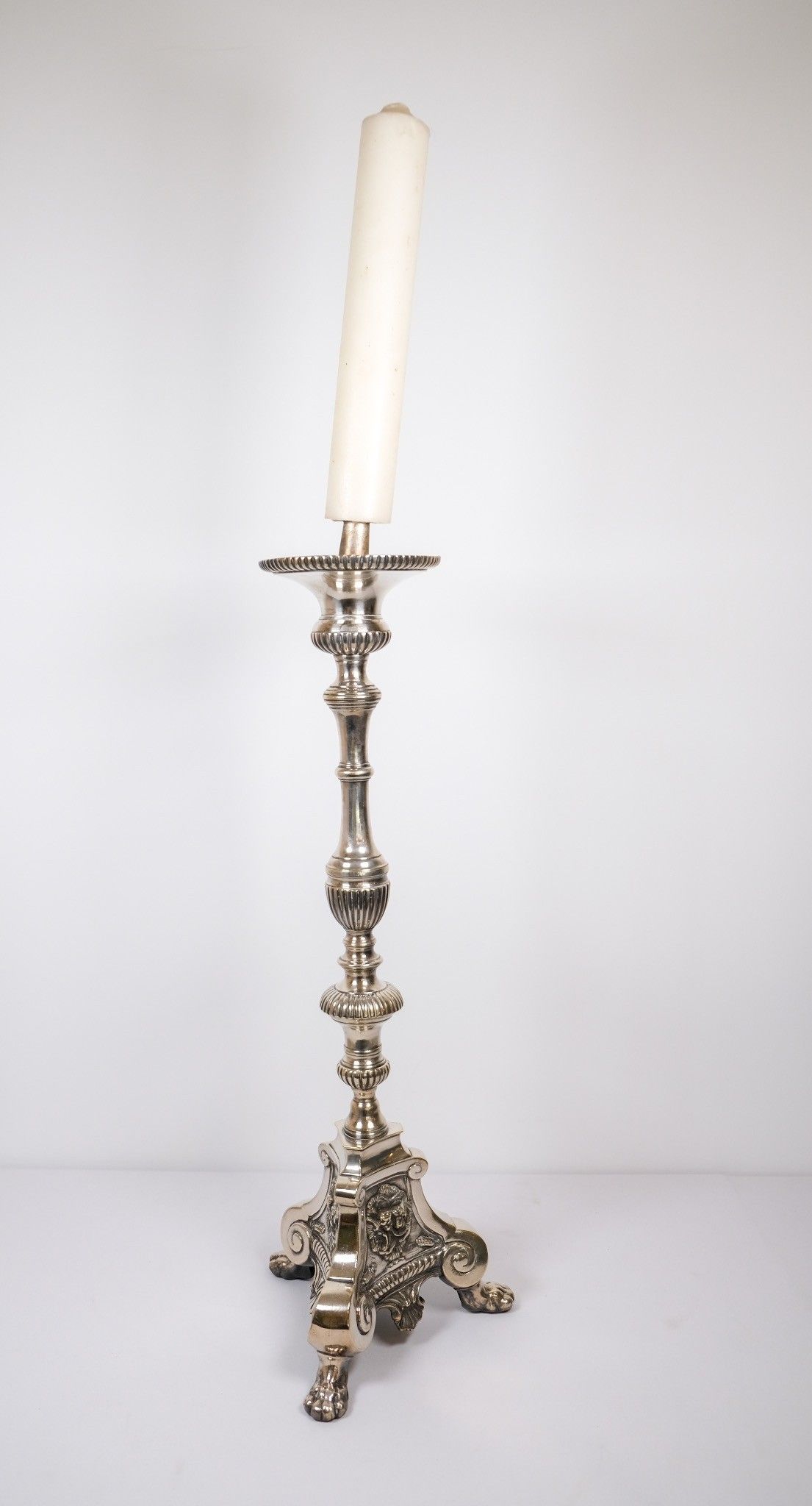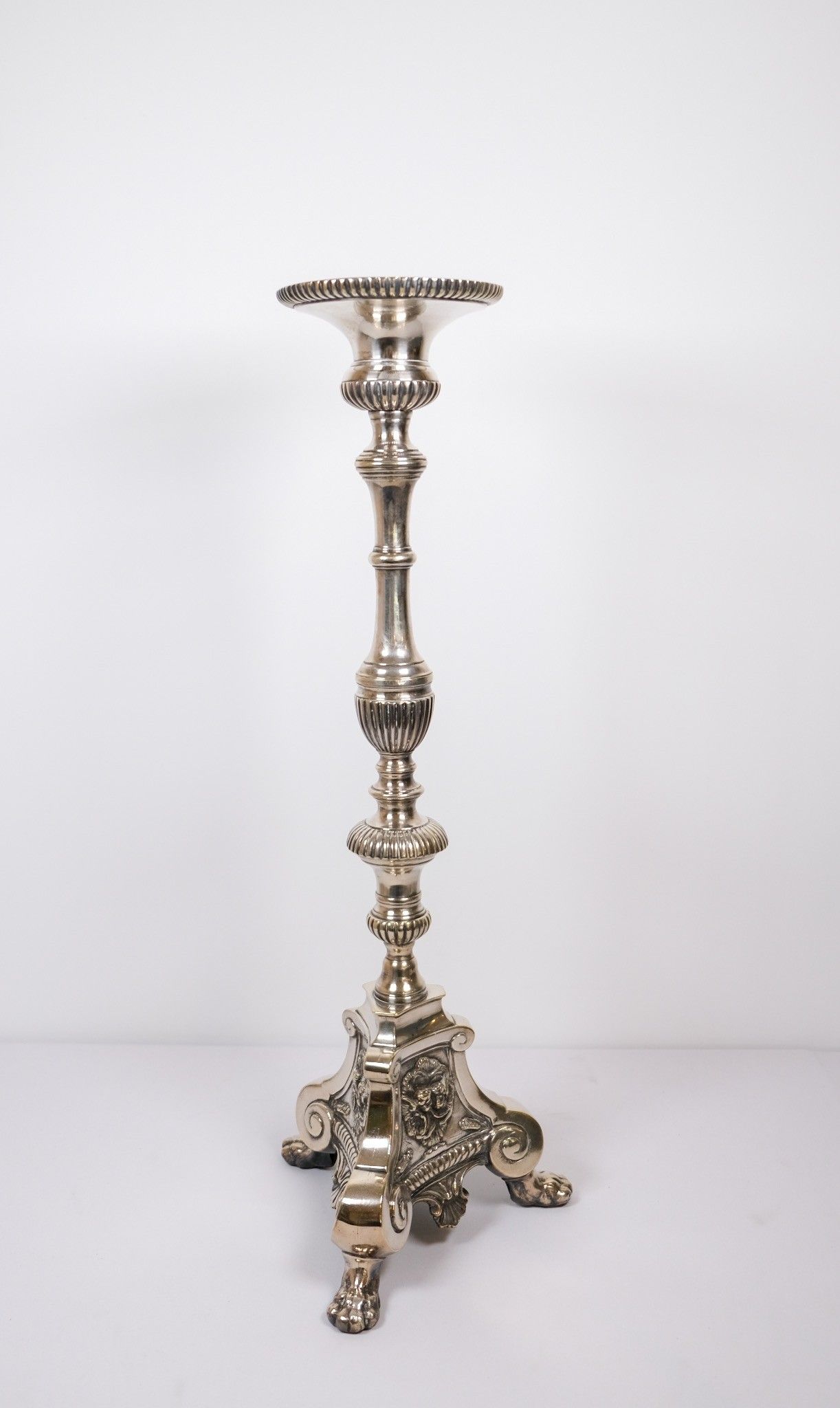 Pique-cierge tripode en bronze argenté. H : 68 cm