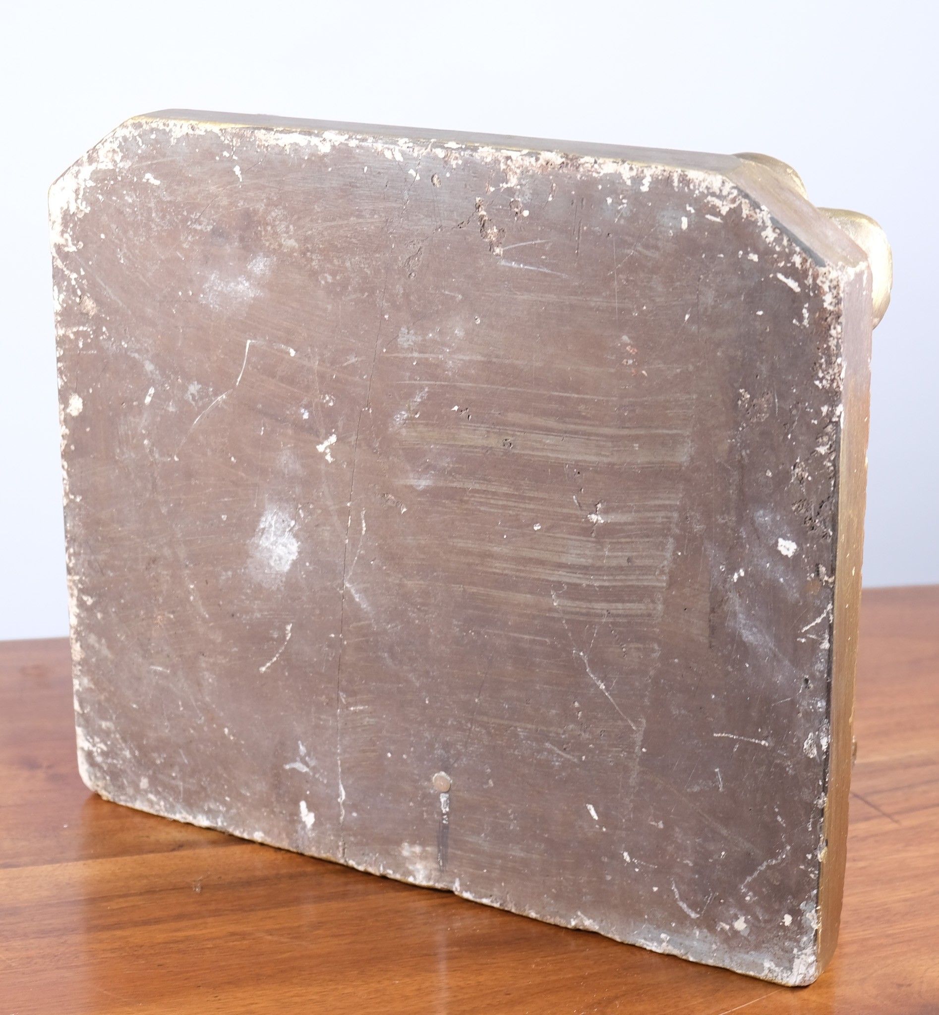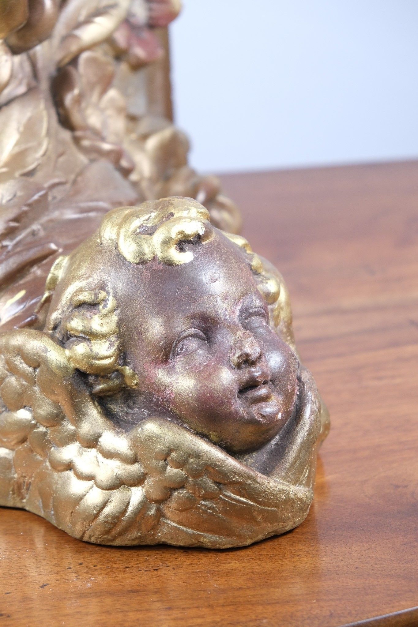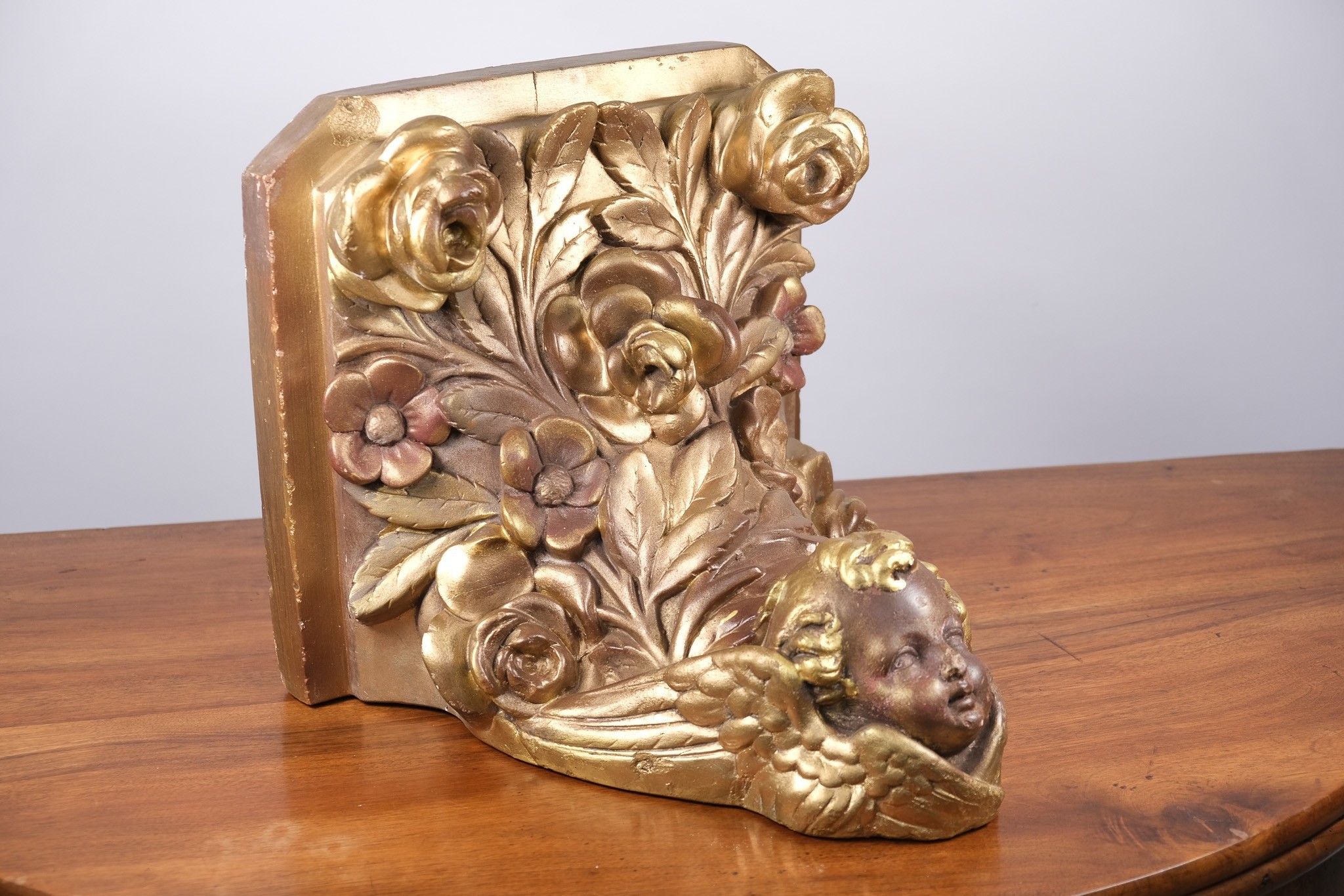 Console murale en plâtre doré façon bois, à décor de roses et de putto. Travail moderne