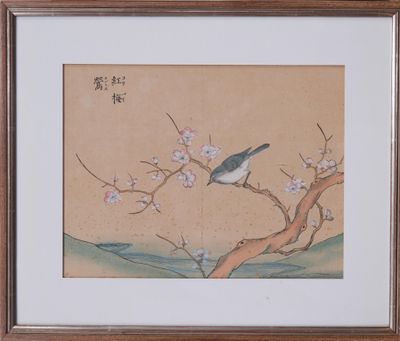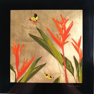 Plaque en bois et cuivre à décor laqué de papillons et fleur…