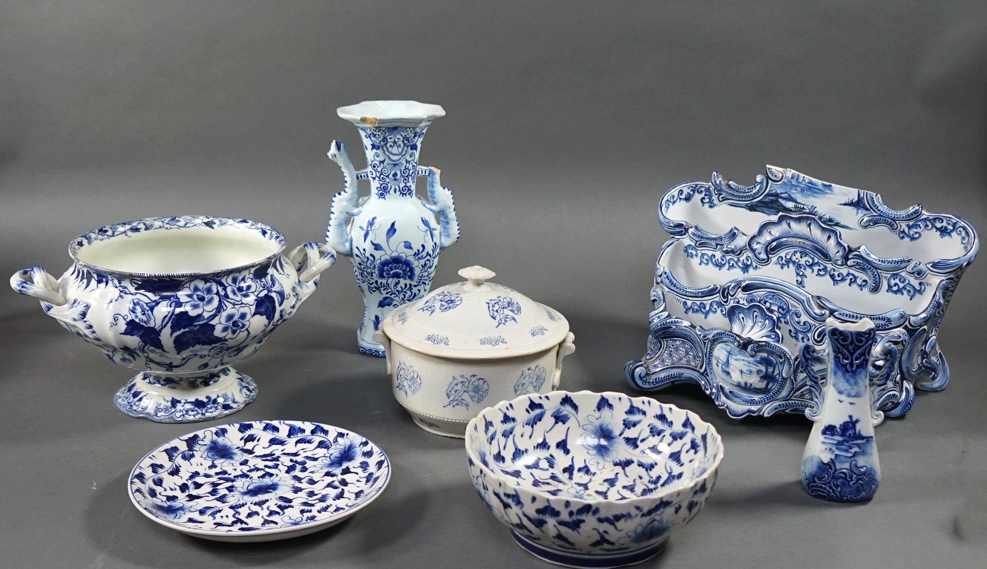 Lot de FAIENCES dans le gout de DELFT comprenant, jardinières, plat, terrines, vases et coupe. Haut. 8 à 27 cm. Accidents.