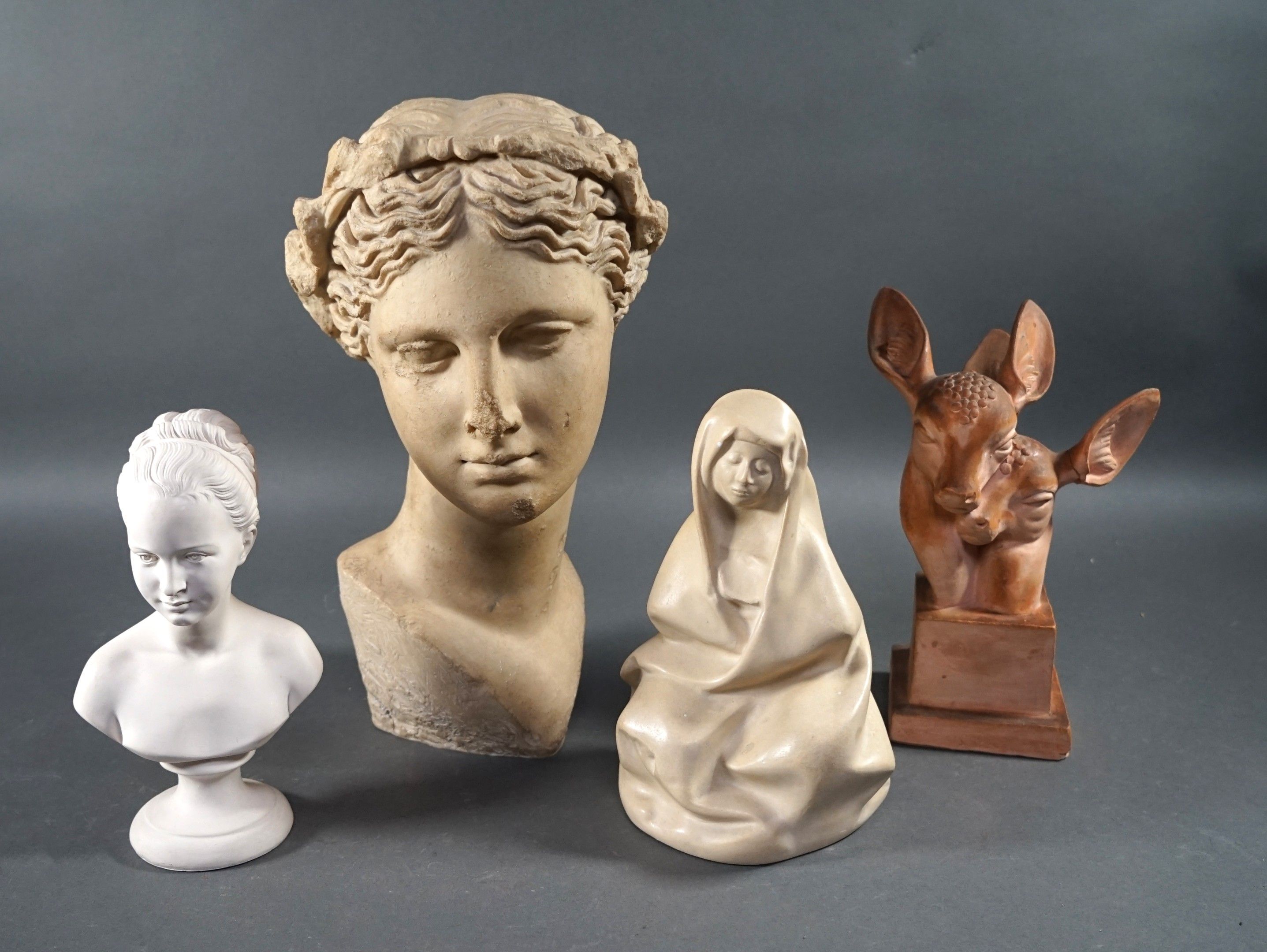 Lot de sculptures comprenant Vierge de Moissac, Epreuve en plâtre, reproduction de la RMN, Ch. LAURENT, XXe. Tête de biche, épreuve en terre cuite signée (Accident et restauratio), Buste de jeune fille en plâtre et tête de Thalie en composition. Haut. 21 à 34 cm.