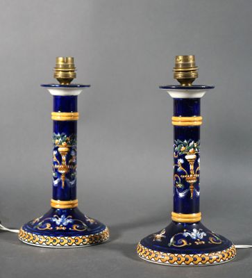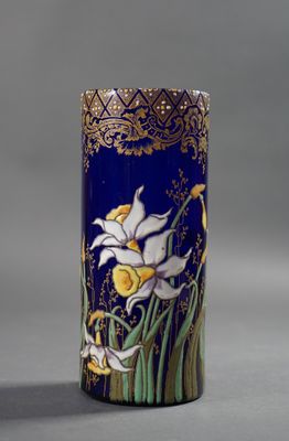 VASE rouleau en verre bleu à décor émaillé de fleurs et reha…