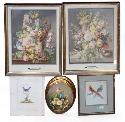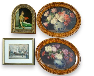Lot de GRAVURES et huile sur panneau à vue ovale nature mort…
