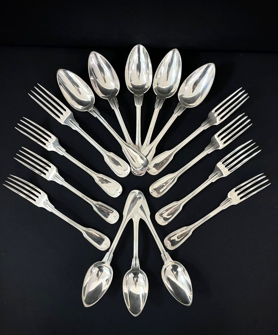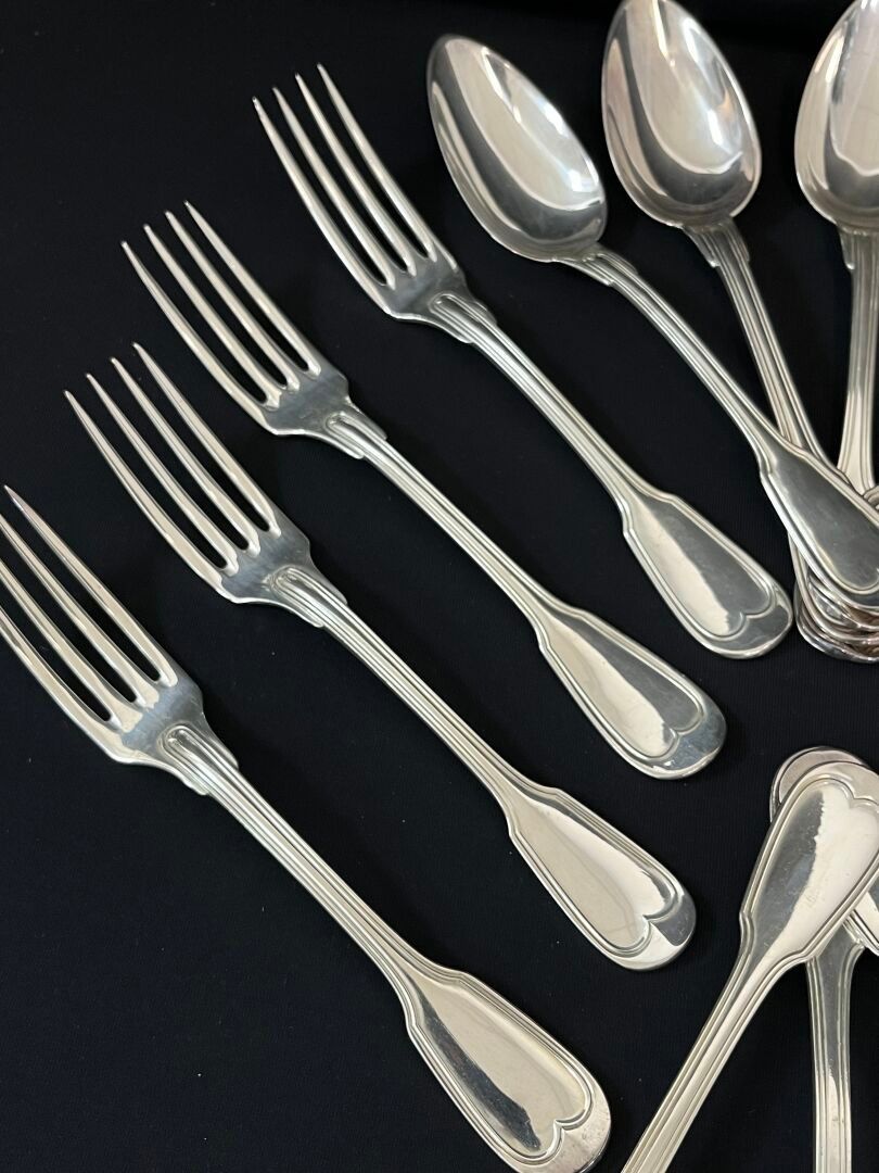Partie de ménagère en métal argenté modèle filet contour comprenant :