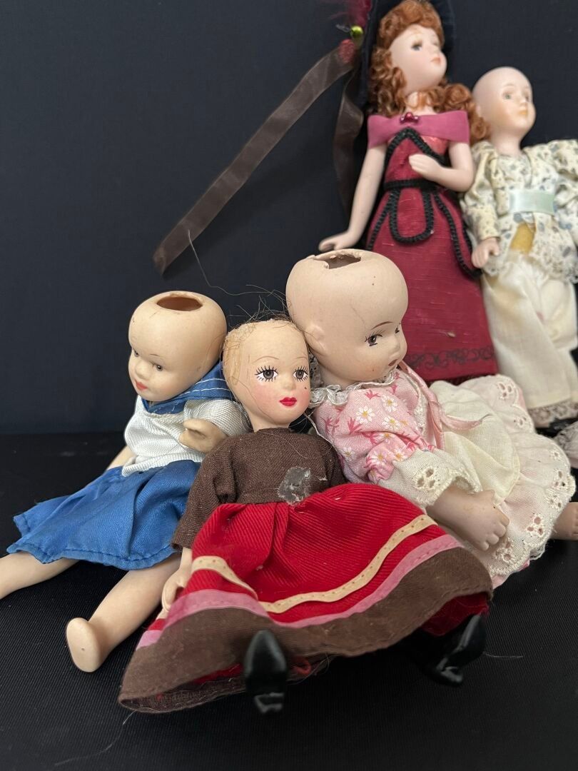 En l'état (une poupée accidentée avec un éclat joint, élastiques détendus, certaines perruques manquantes et usure).