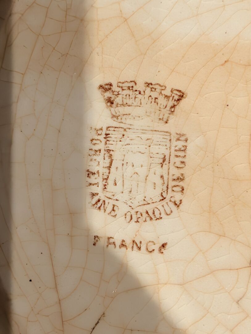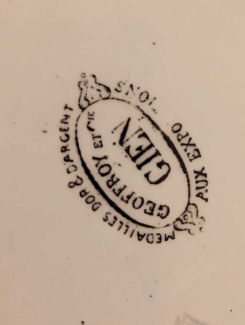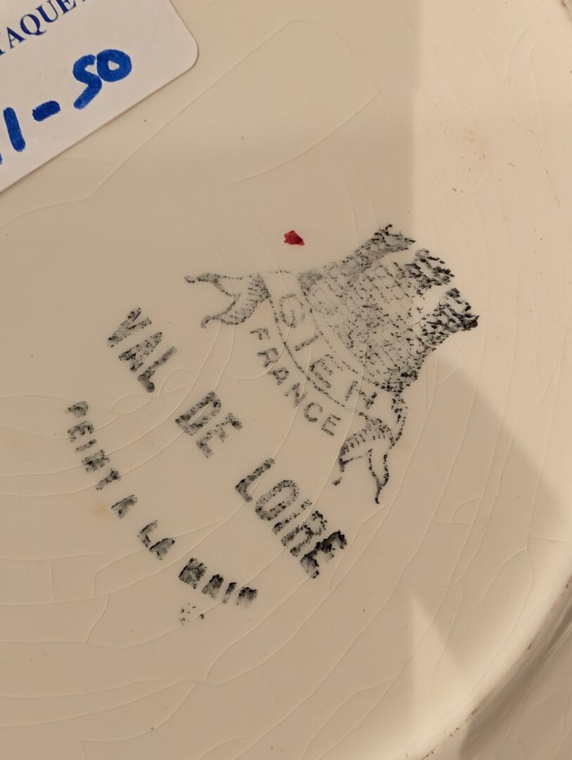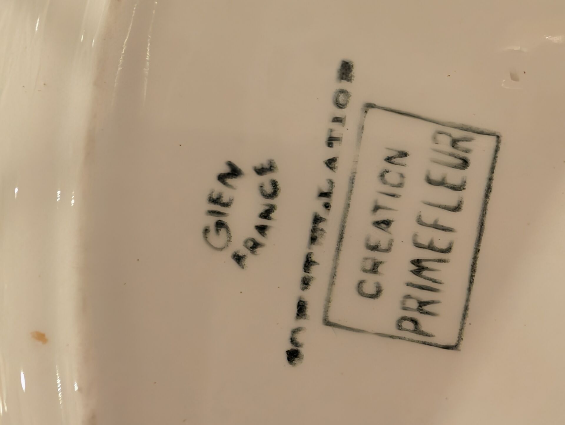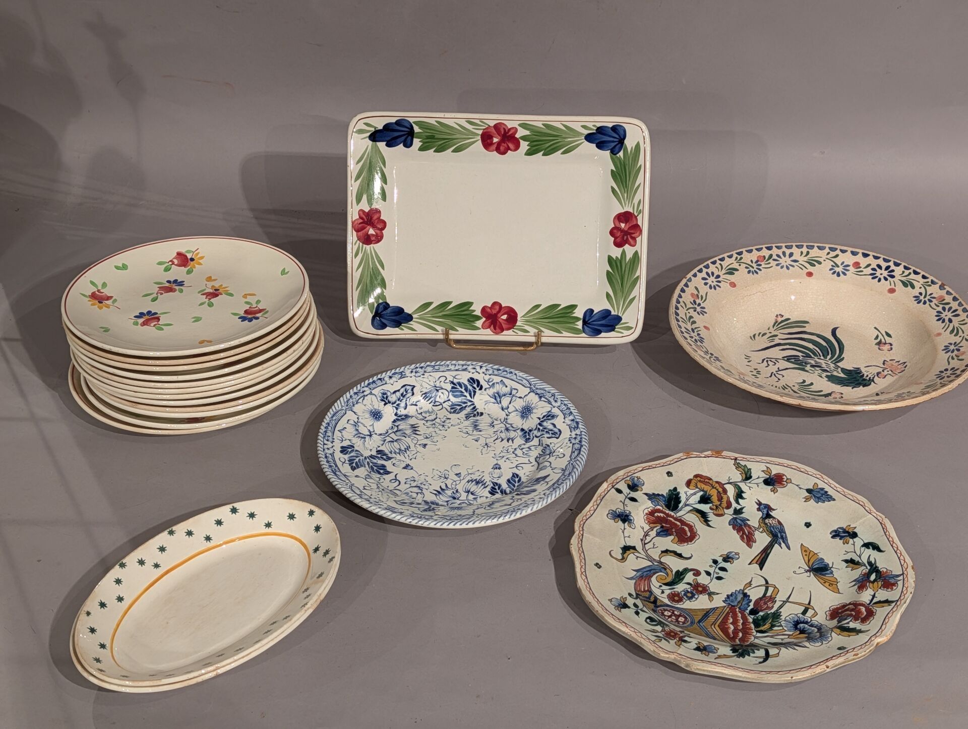 On y joint un plateau, deux assiettes, deux raviers et un plat creux en faïence de Gien