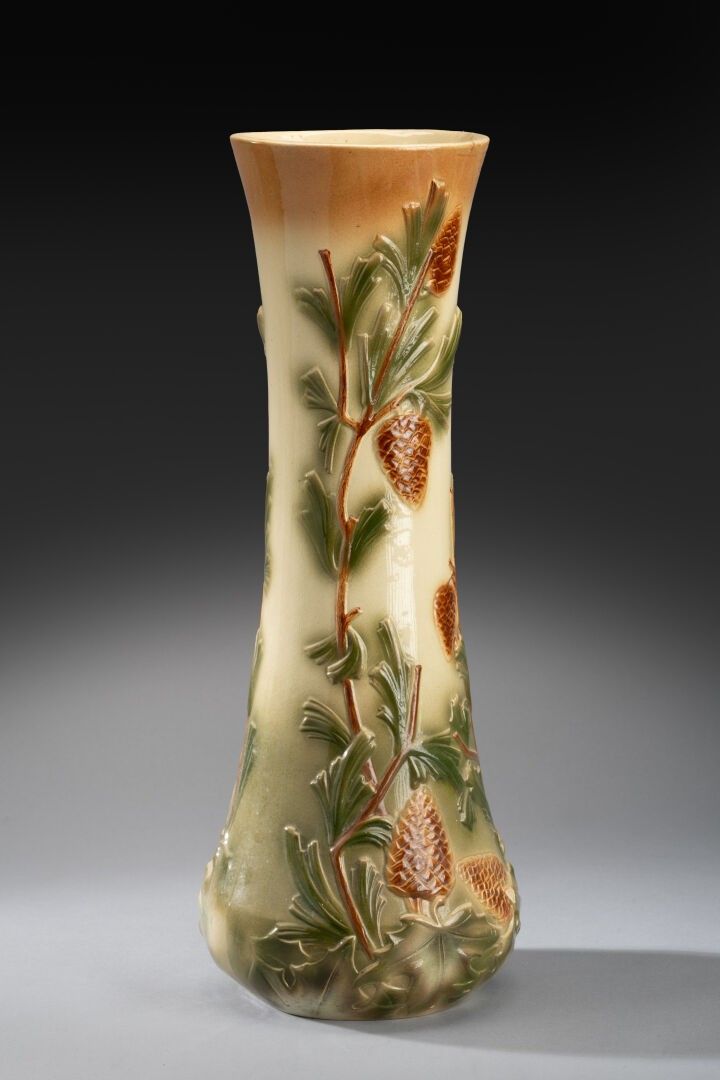 Digoin Sarreguemines Vase en barbotine à décor de pommes de pin Marque en creux au revers H.: 44.5 cm (Accident)