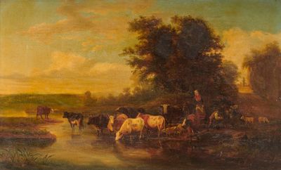 Ecole du XXème siècle "Troupeau s'abreuvant à l'étang" Huile…
