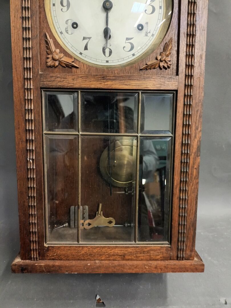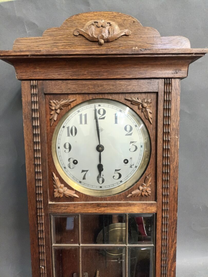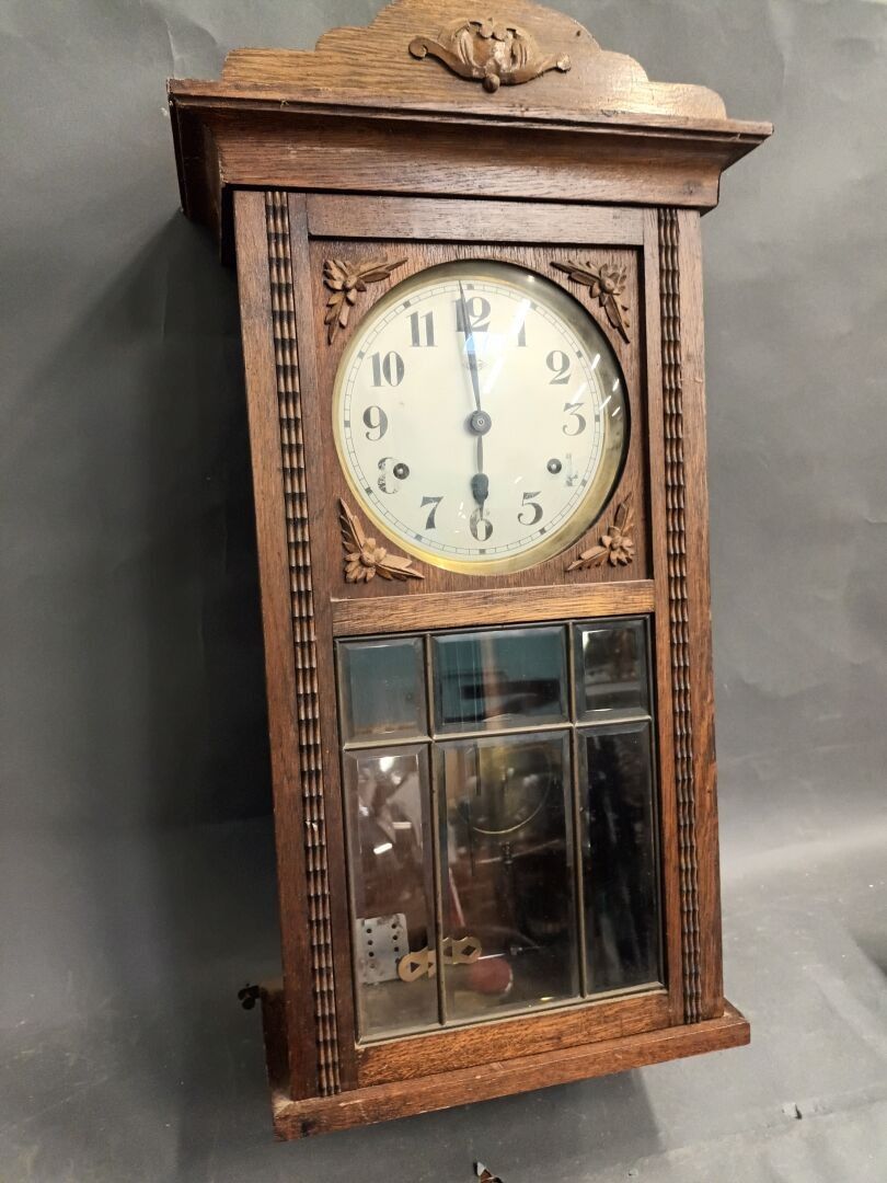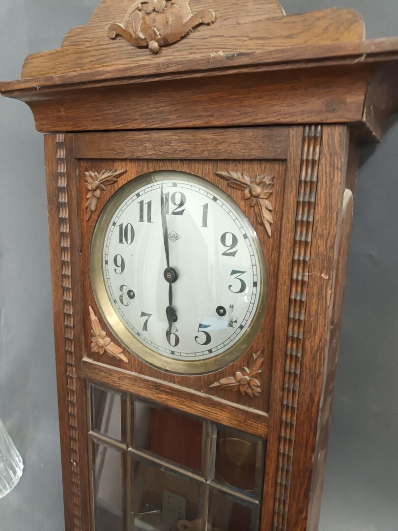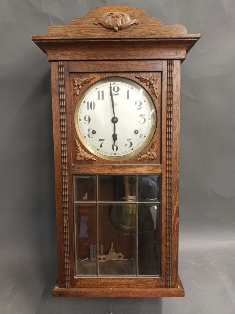 VEDETTE, Carillon à quatre marteaux, Coffre en bois sculpté, circa 1950, Cadran métaliqé, chriffres arabes 79 x 37 x 19 cm Avec sa clé de remontage