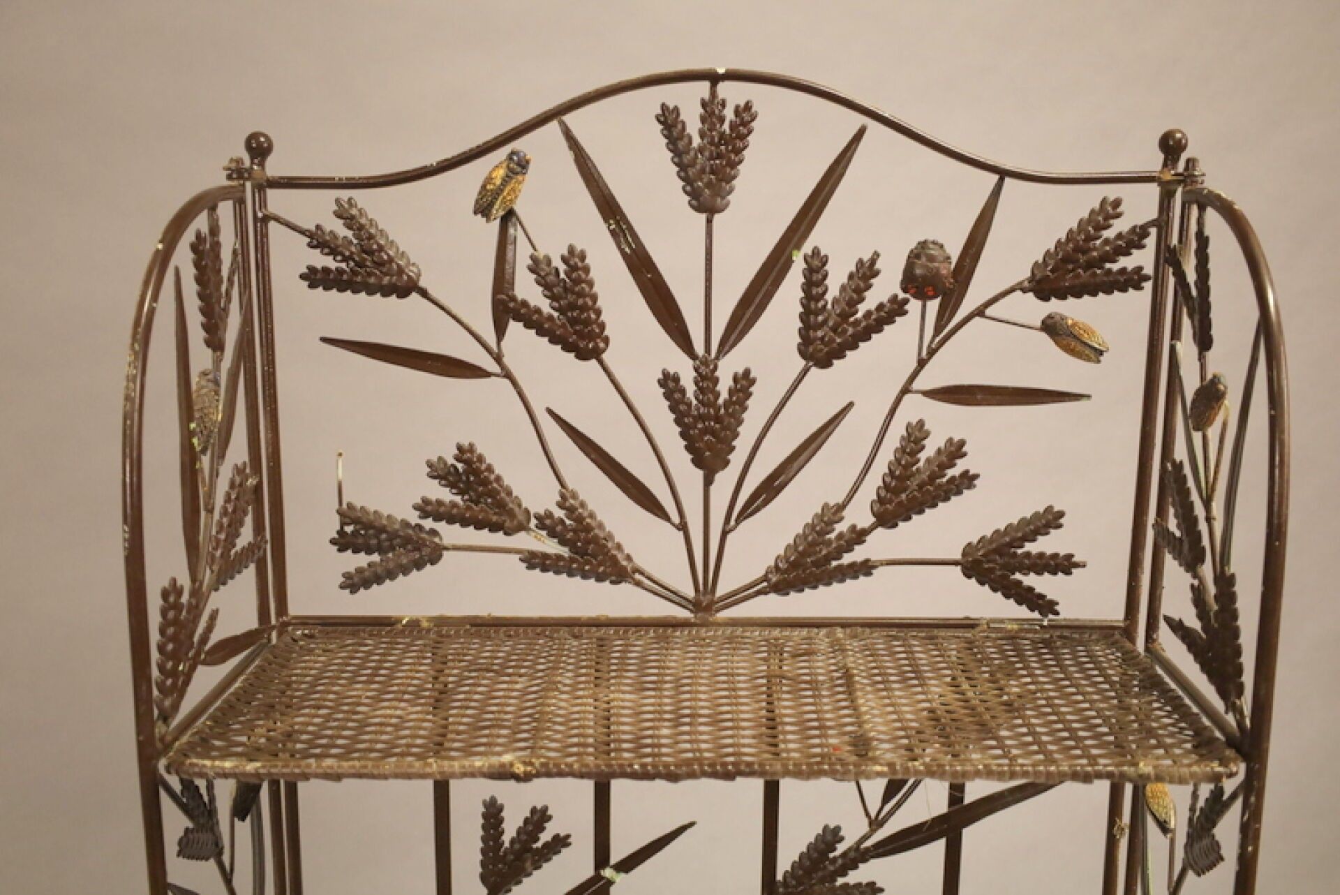 Etagère en tôle à 3 tablettes à décor d'épis de blé et de cigales. Dimensions : 158x60x32 cm (petits accidents aux étagères)