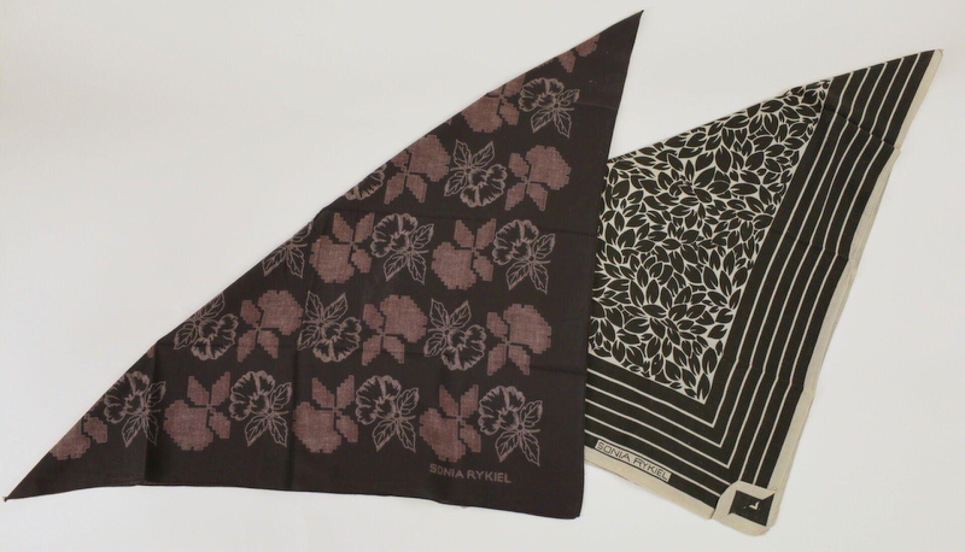 SONIA RYKIEL à PARIS, un ensemble de deux foulards, en coton, à dominante noire0. Signés. 70 x 70 cm