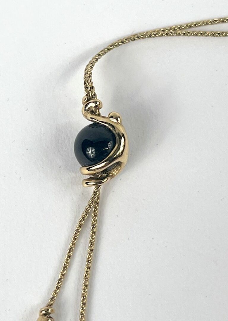 Charles Jourdan : chaine dorée retenant un pendentif en métal doré et onyx figurant une femme acrobate stylisée. Tour de cou : 39-43 cm