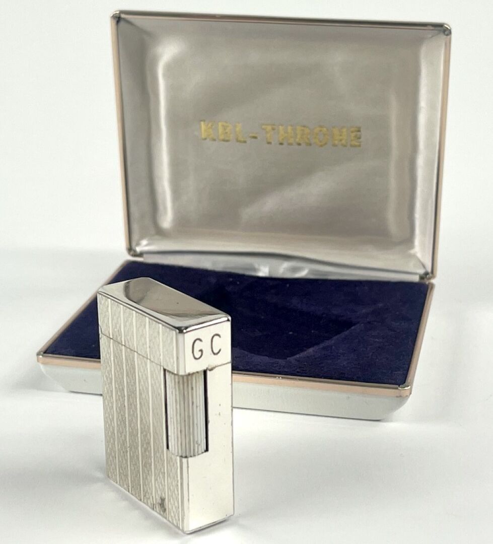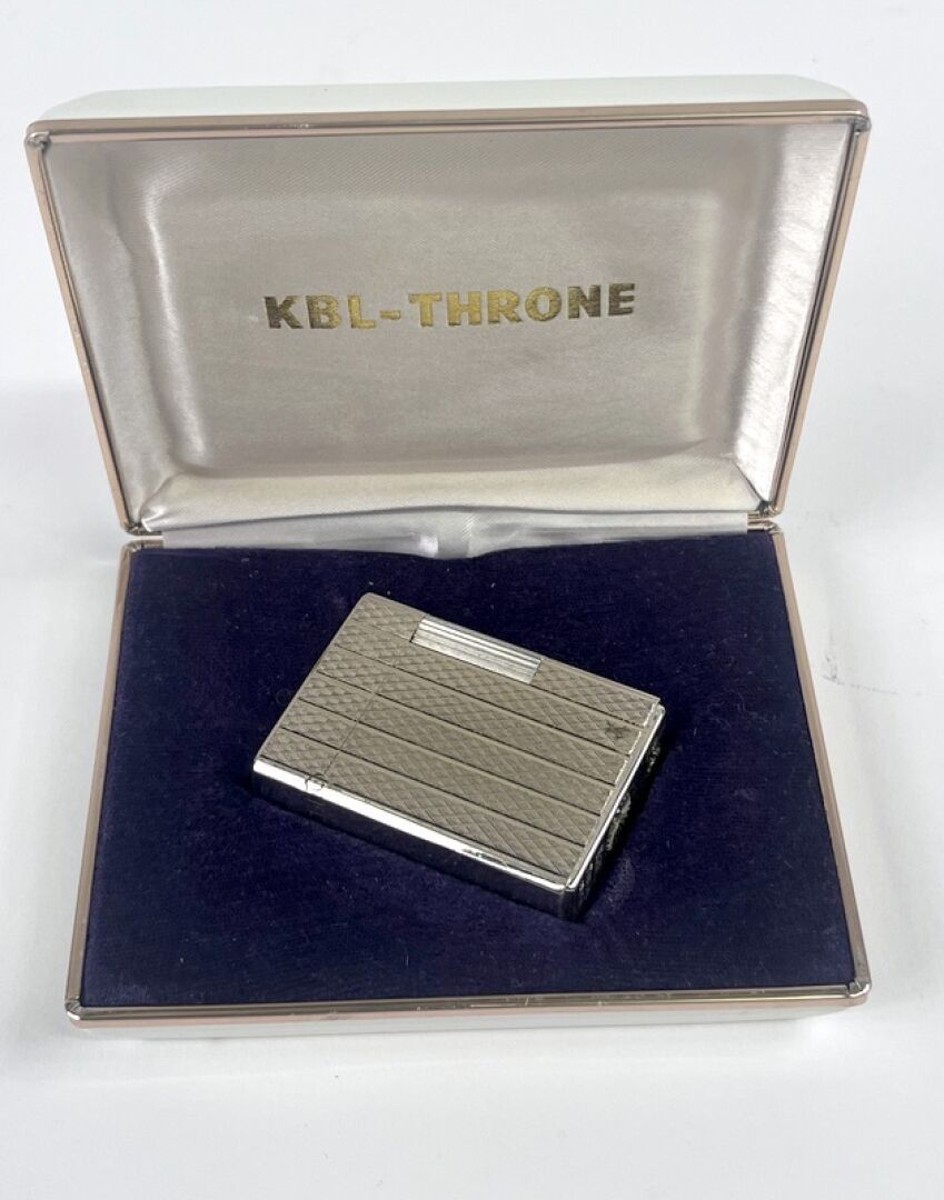 KBL THRONE - Briquet en métal argenté guilloché - Marqué sous la base - Vers 1970 . Dans sa boîte d'origne