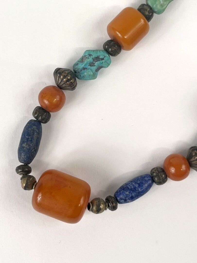 Collier fantaisie avec perles en ambre, turquoise, lapiz lazuli et métal. Tour de cou : 73 cm environ