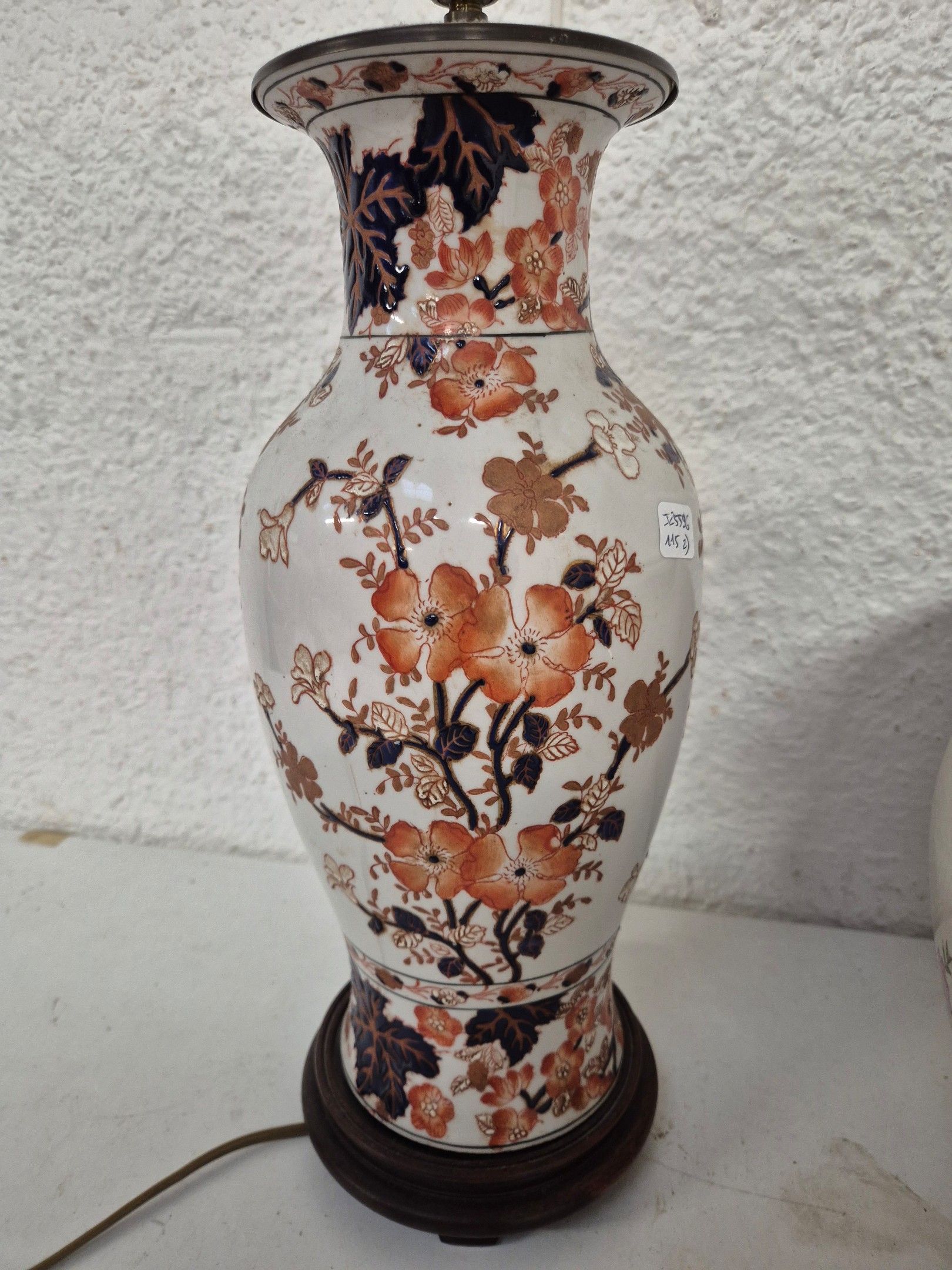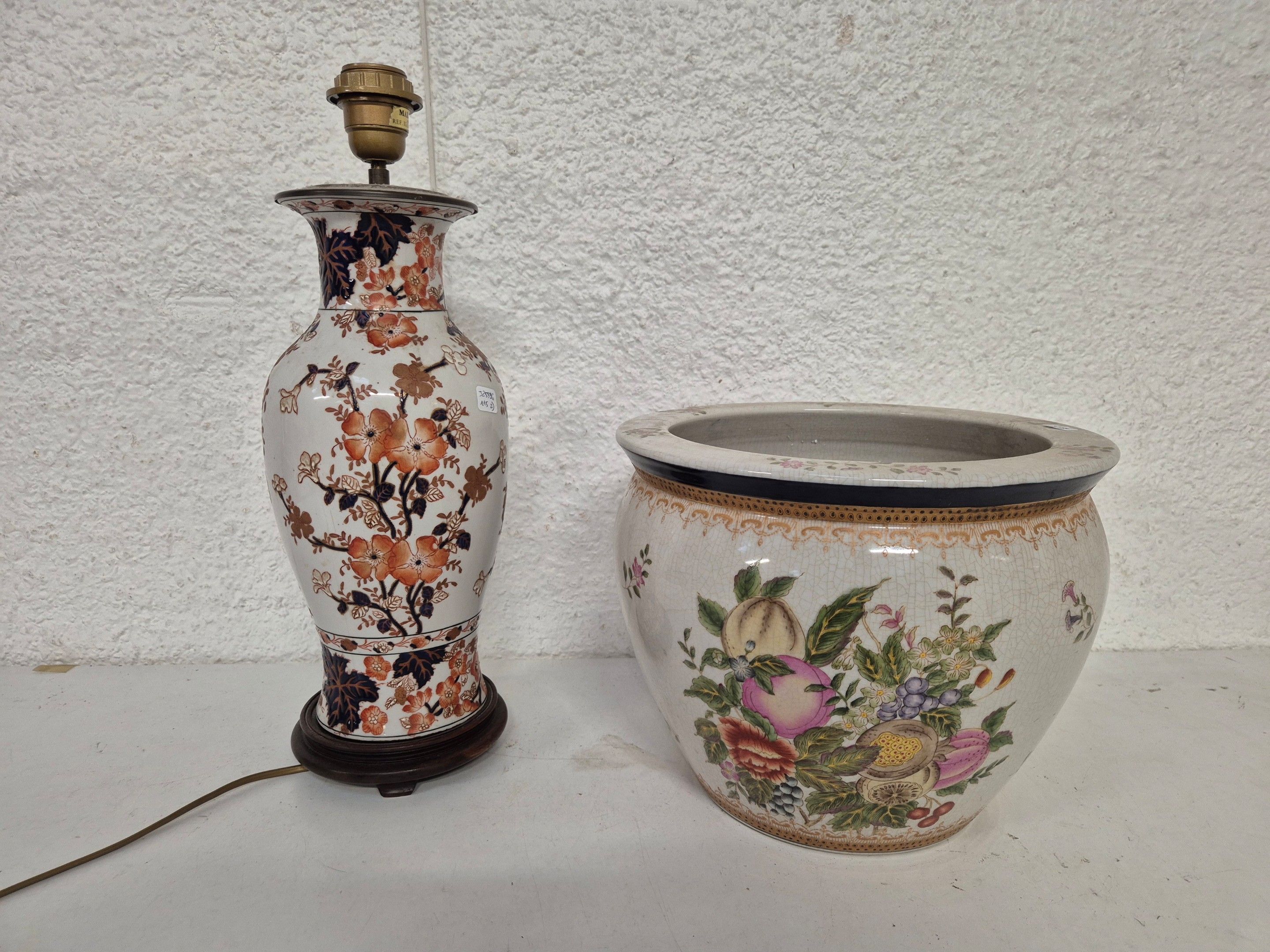 J/ CHINE XXE, cache-pot en faïence à décor de fleurs et fruits et vase balustre en porcelaine à décor floral sur fond blanc, monté en lampe.