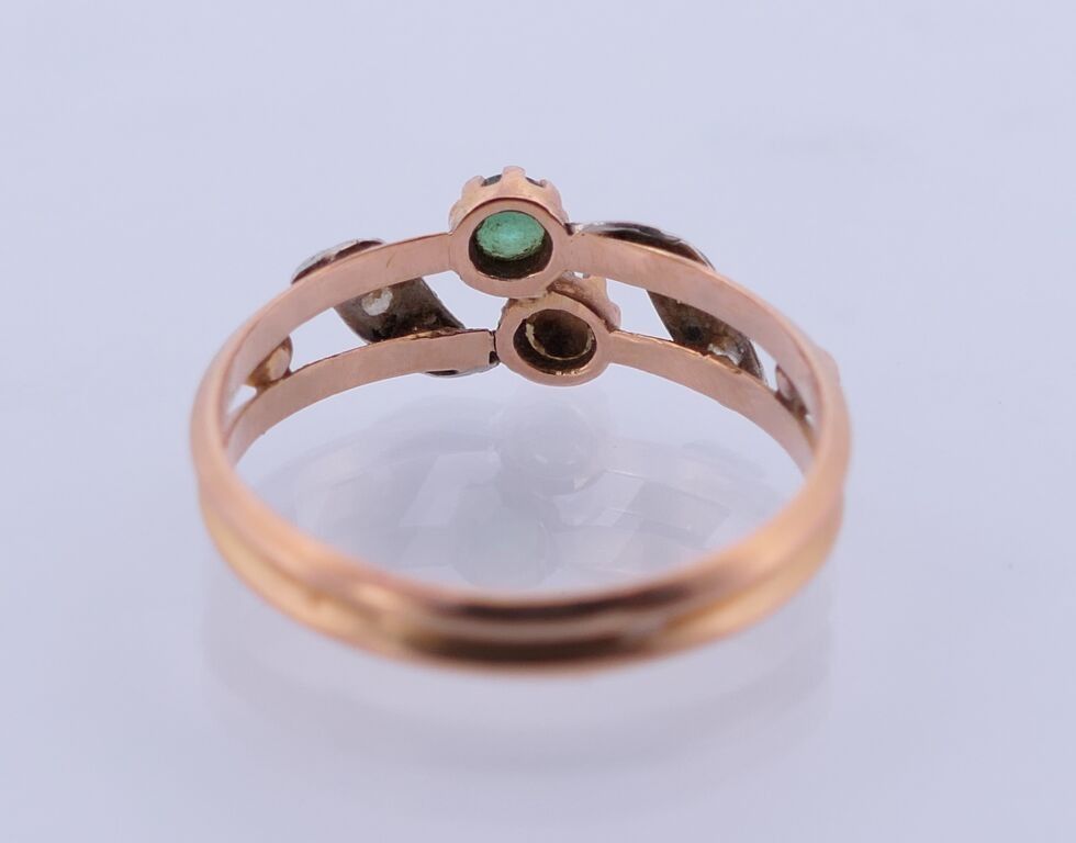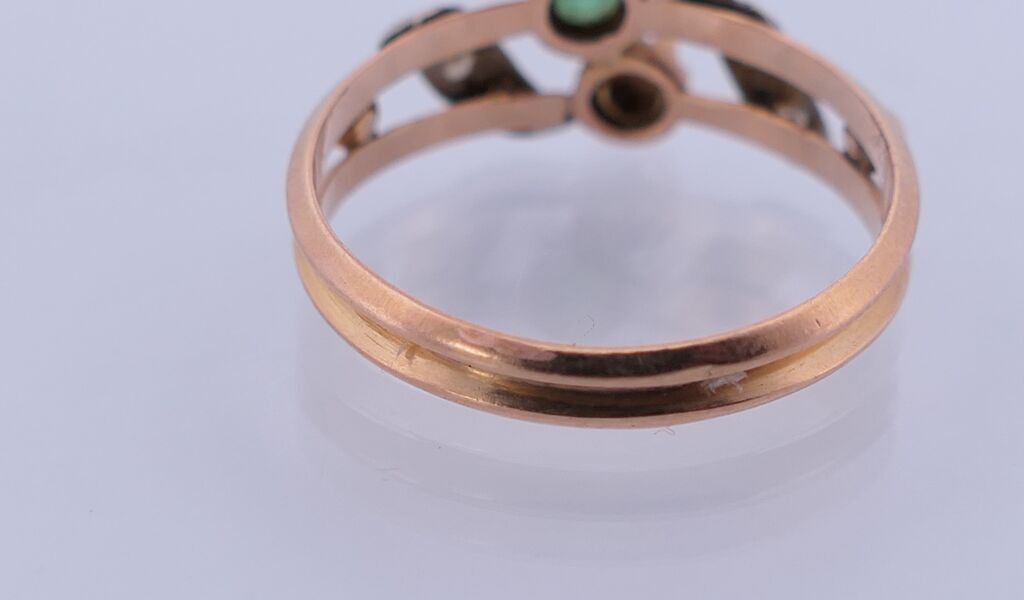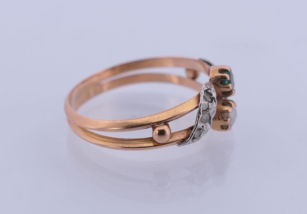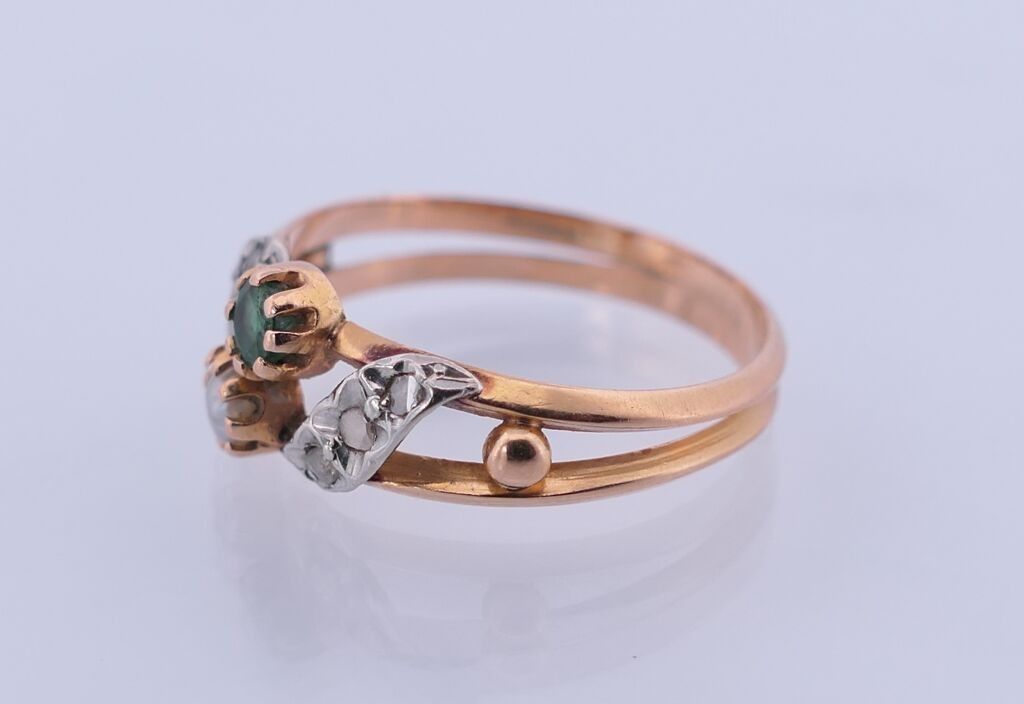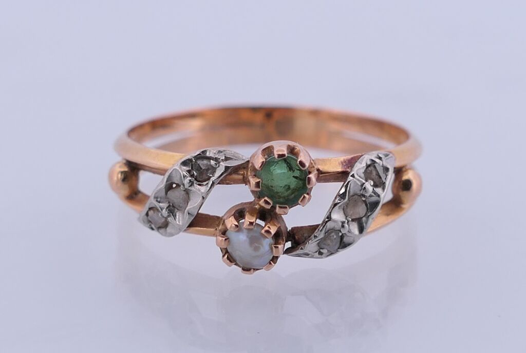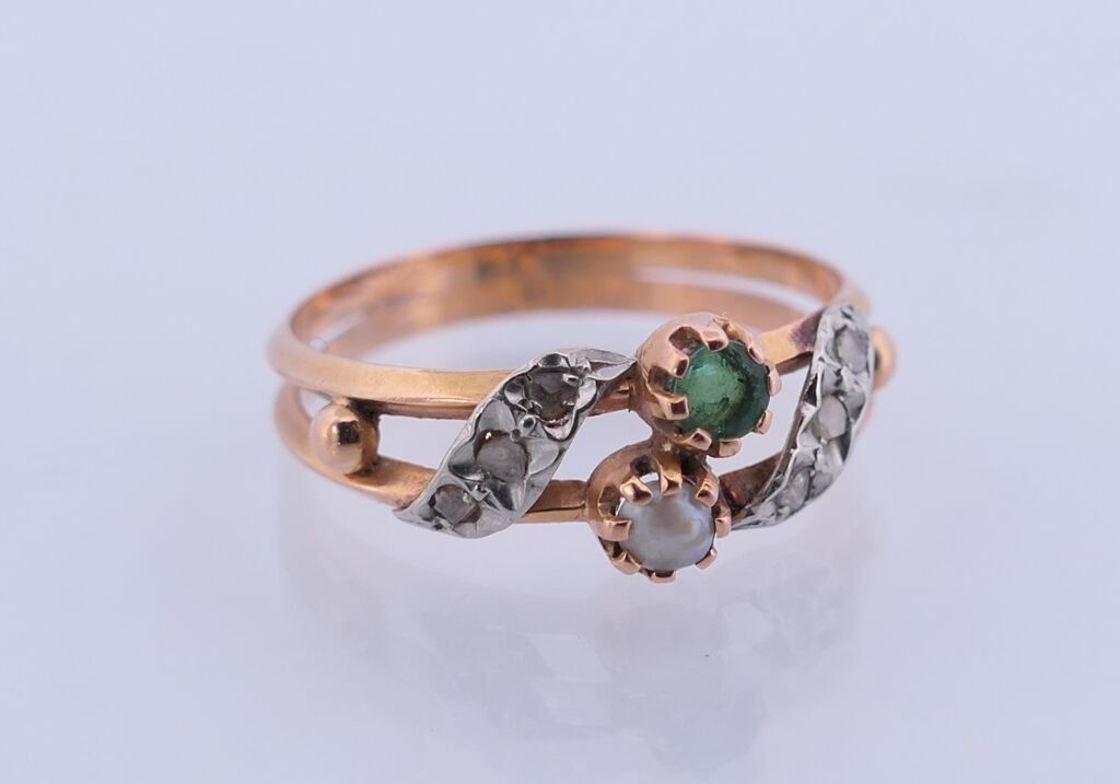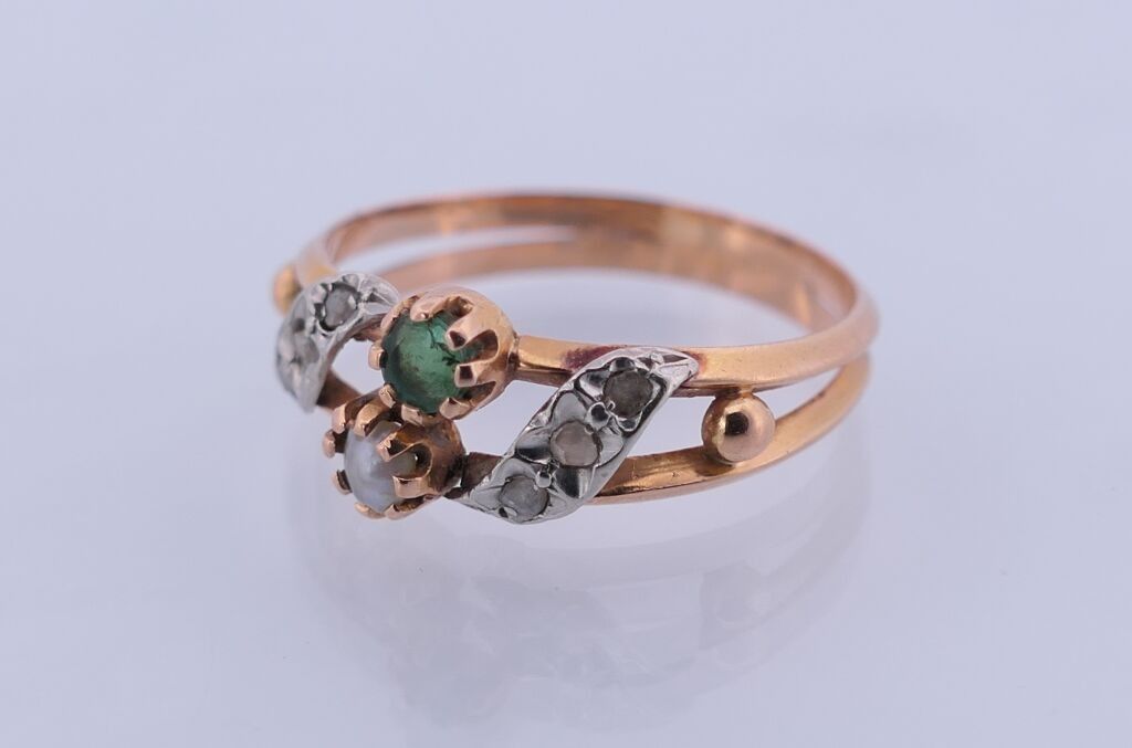 Bague en or jaune 750 sertie d'une perle, éclats de diamants et d'une émeraude. TDD. 56. PB. 2.4g.