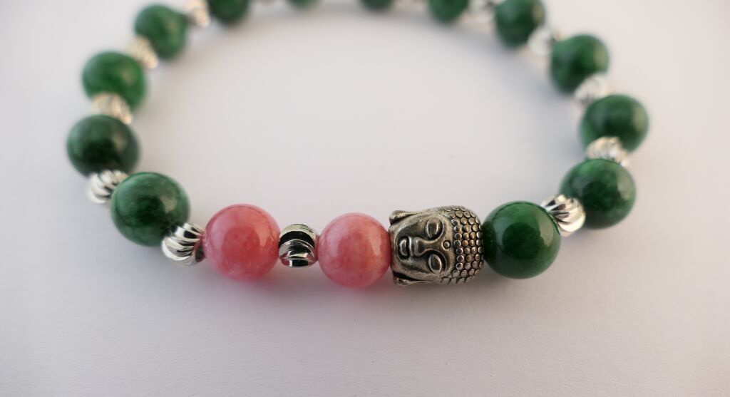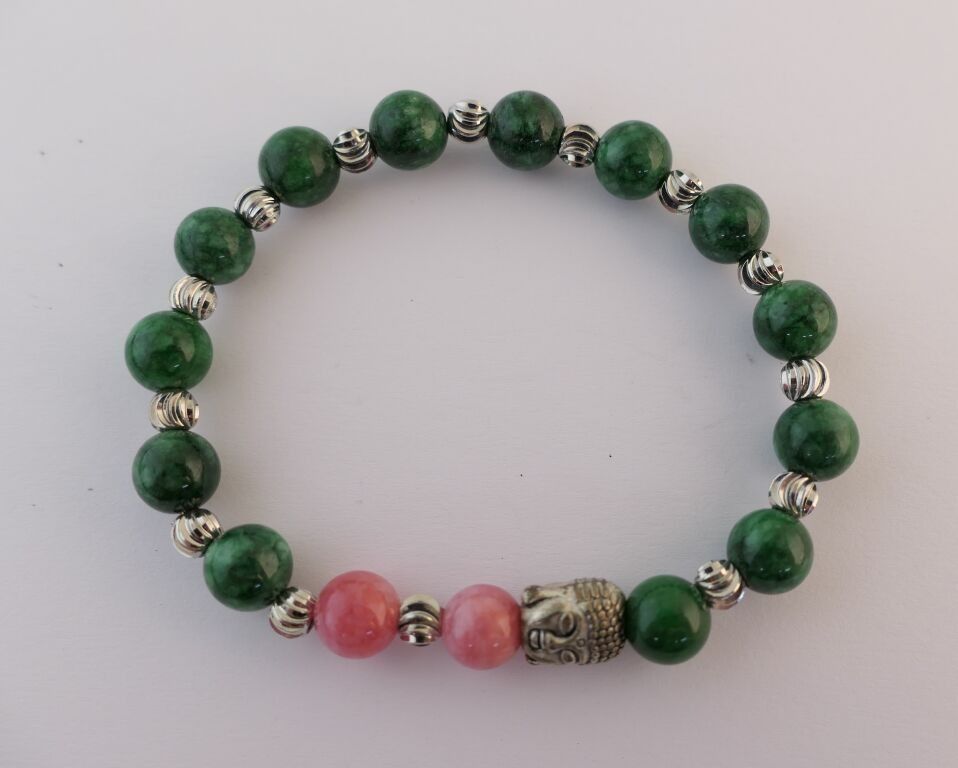 Bracelet élastique, composé de 2 perles corail,13 boules jade, agrémenté de boules torsadées en métal et d'une tête de Buddha.